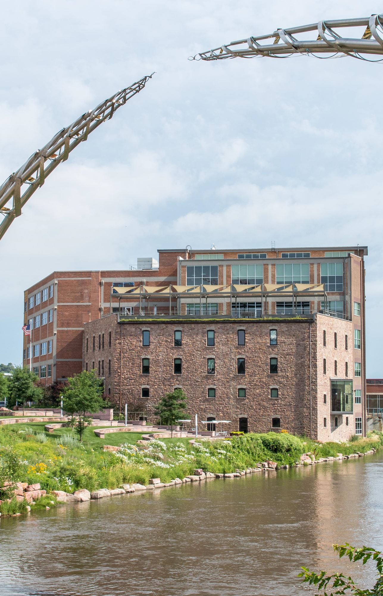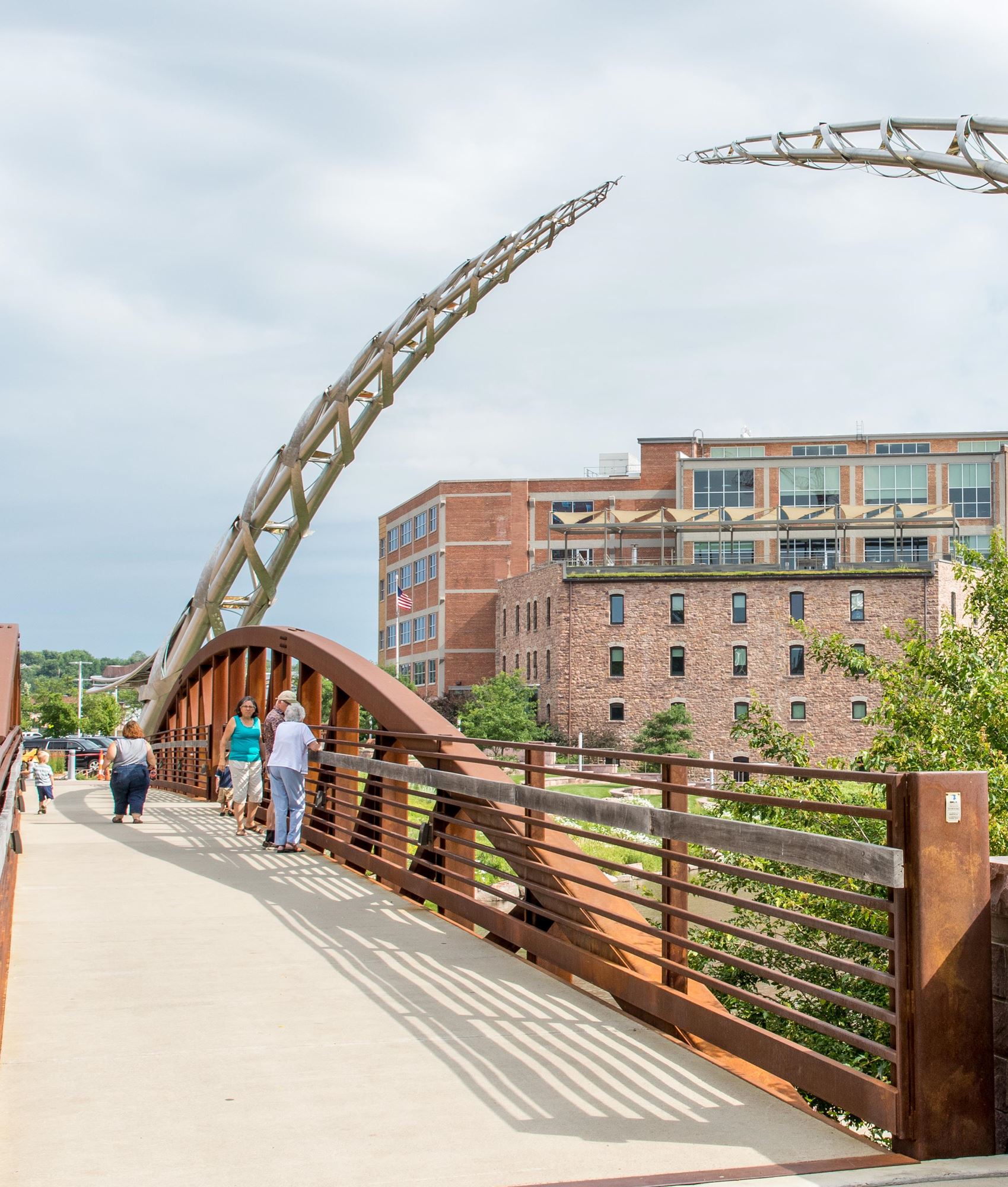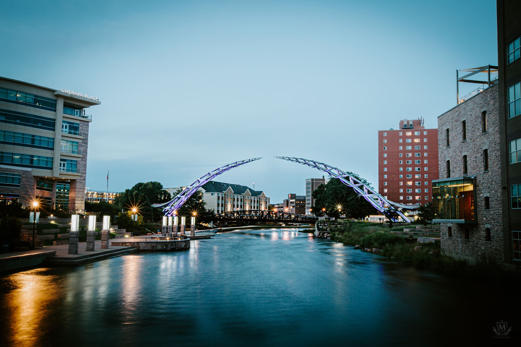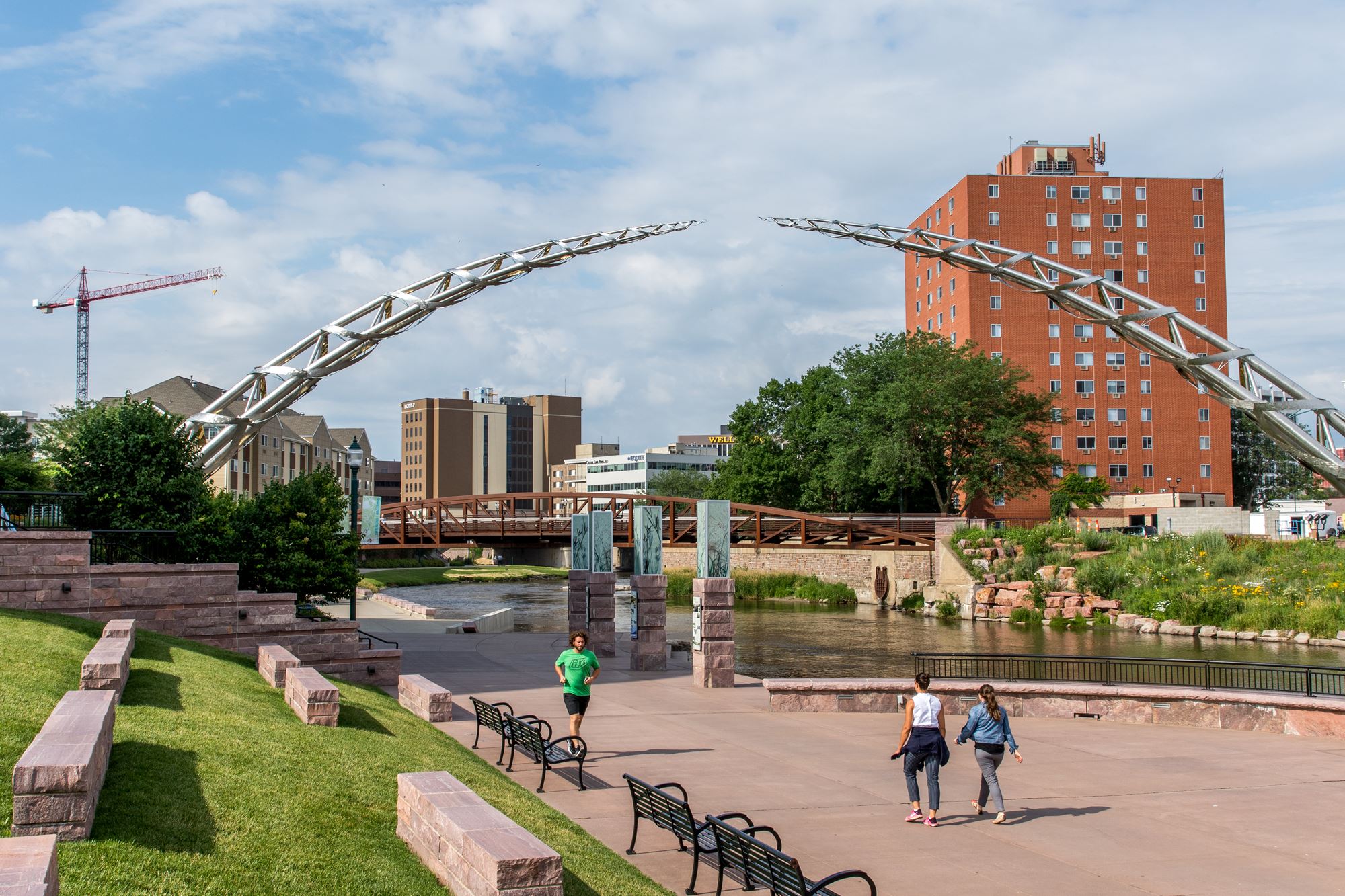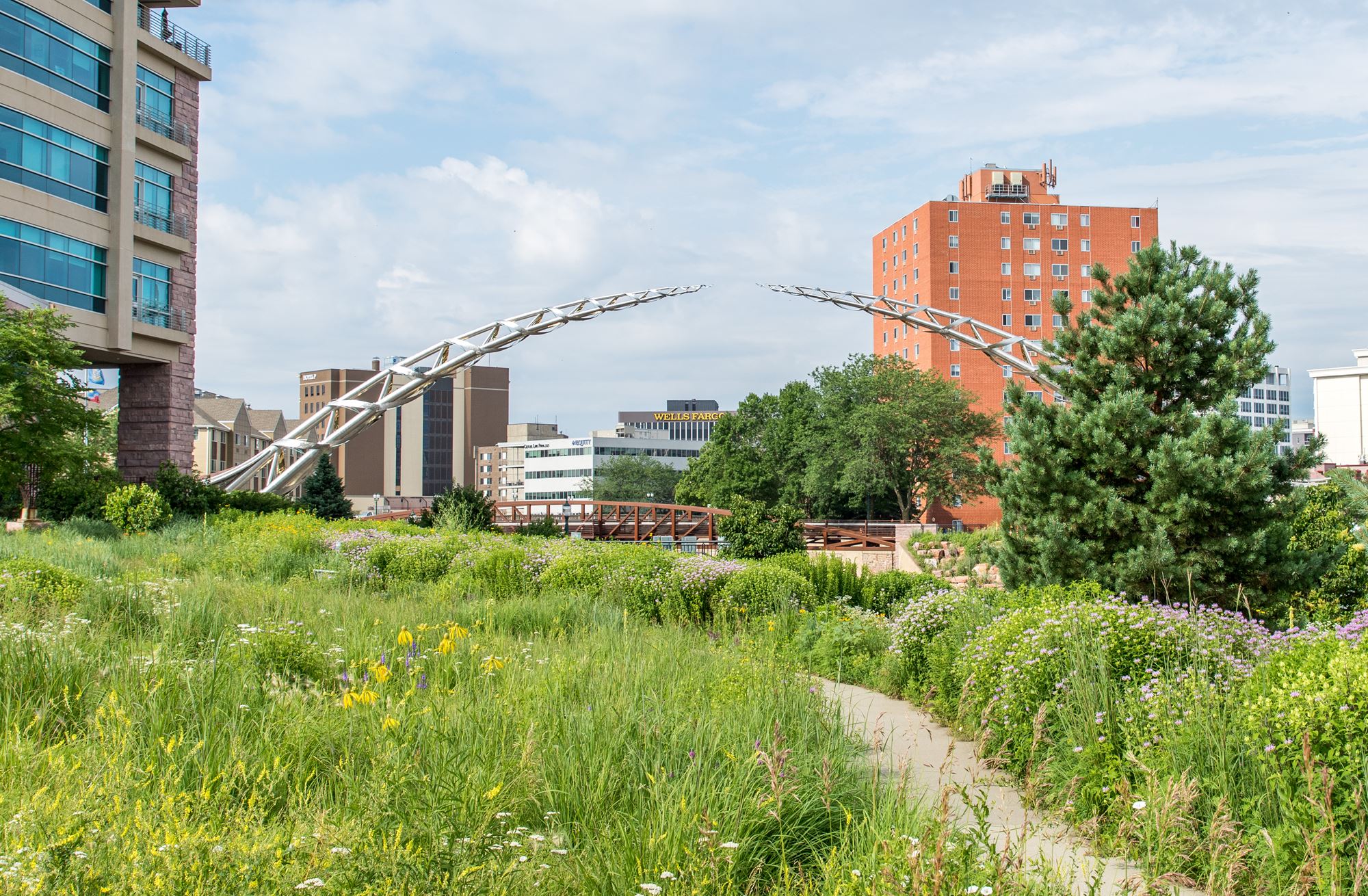 SculptureWalk selected Confluence to provide design services for site placement and donor recognition associated with a monumental sculpture project spanning the Big Sioux River and greenway in Downtown Sioux Falls. The Arc of Dreams was designed by South Dakota’s Artist Laureate, Dale Lamphere. A small plaza was created at the base of each of the two sculpture segments, one at Cherapa Place on the east bank and the other at Raven Industries Corporate Office.