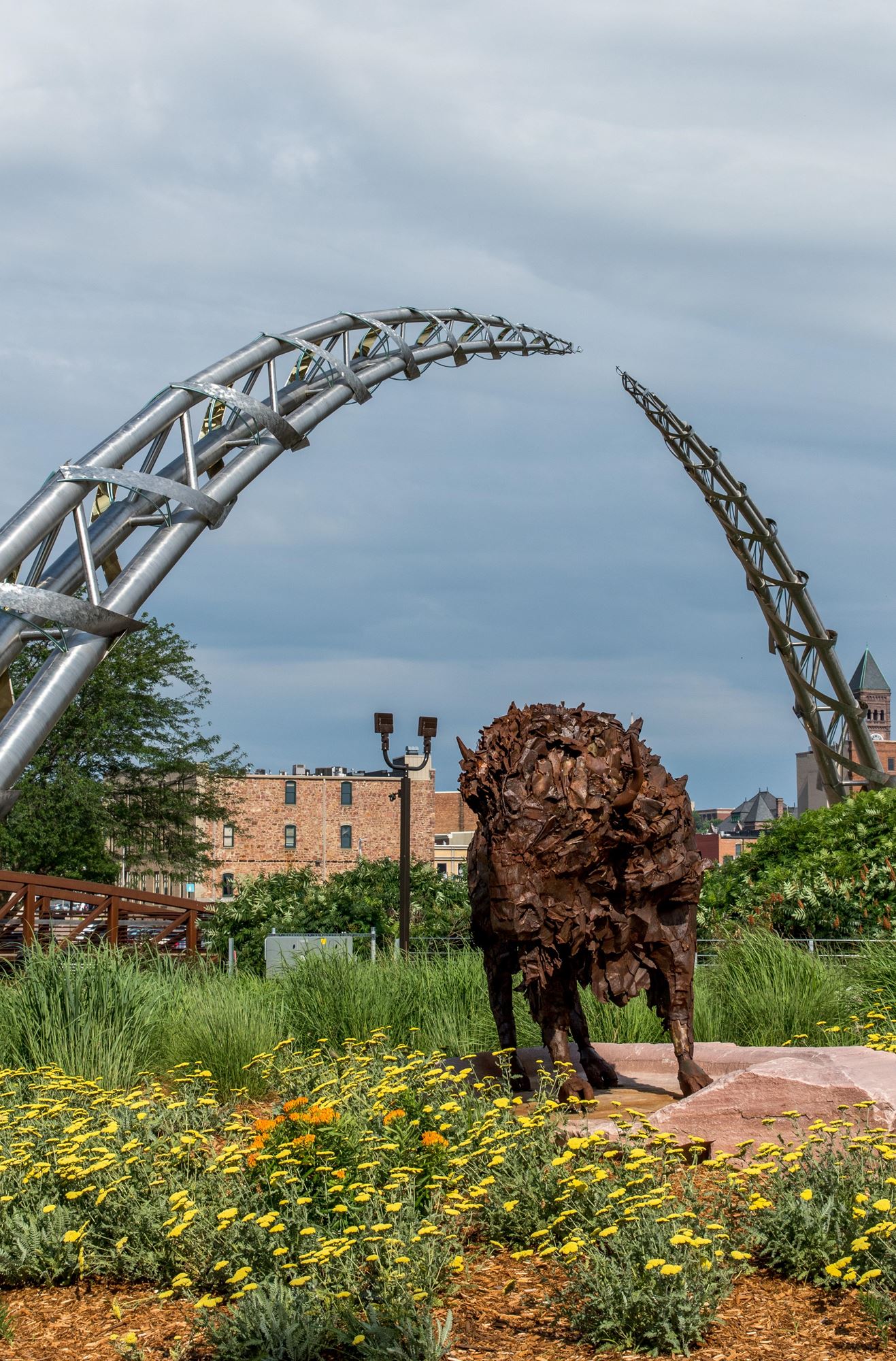 This new monumental sculpture stands 70 feet tall and 240 feet wide above the Big Sioux River, creating an artistic attraction for residents and visitors.