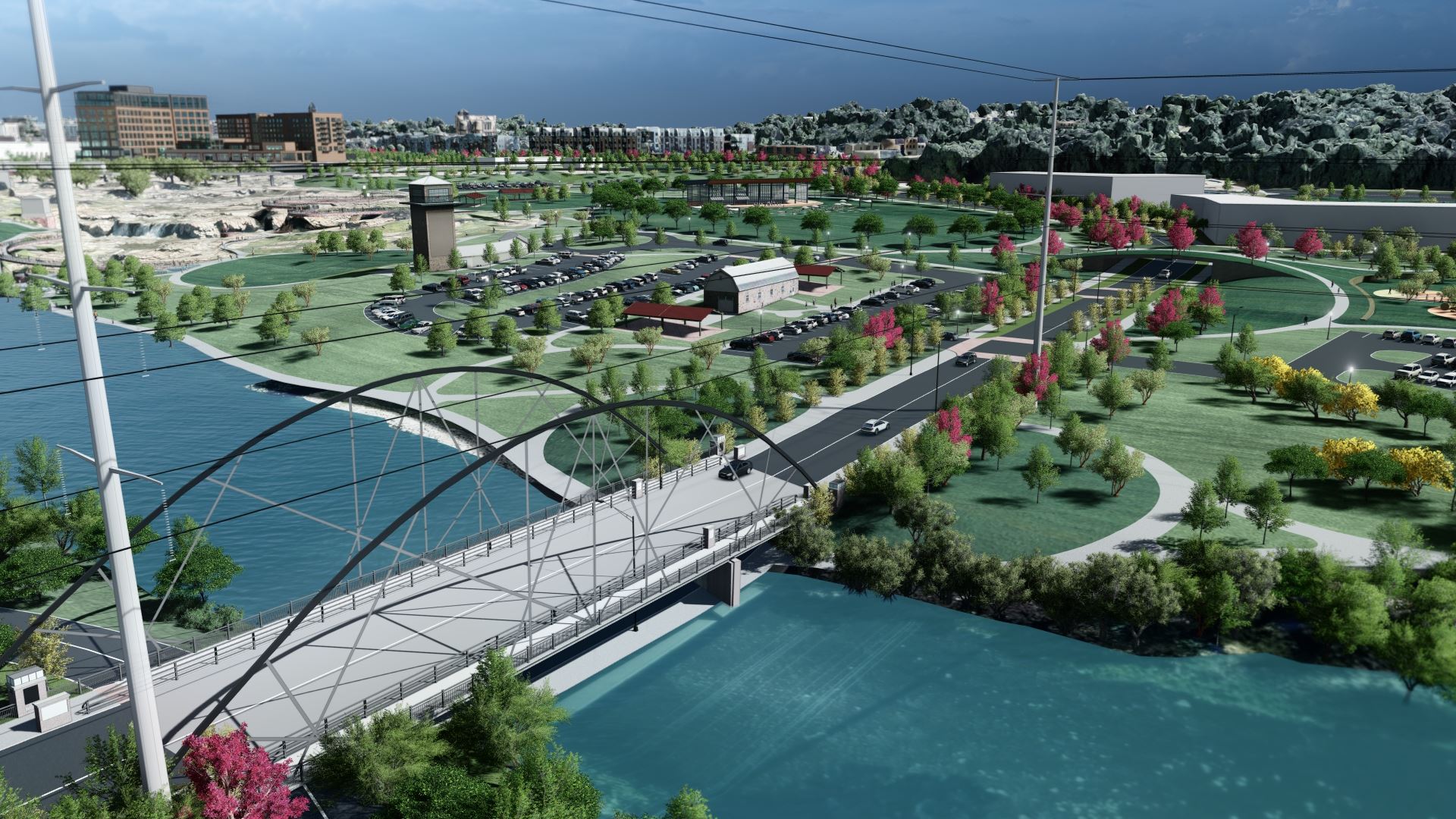 The winning design envisions positioning Falls Park to better connect with the adjacent Downtown district, and collectively to serve as the cultural, civic, retail and economic heart of the City. This vision included realigning vehicular corridors adjacent to and through the park, eliminating barriers to pedestrian circulation throughout the entire park environs, and creating significant long-term opportunities for economic development via new housing and commercial opportunities within and adjacent to the park area.