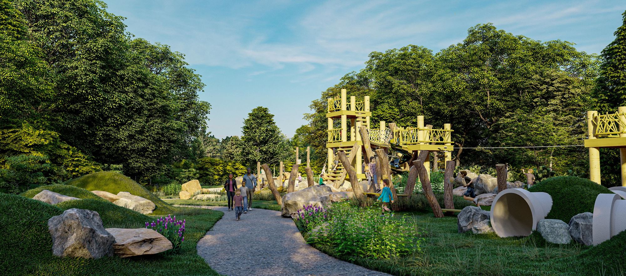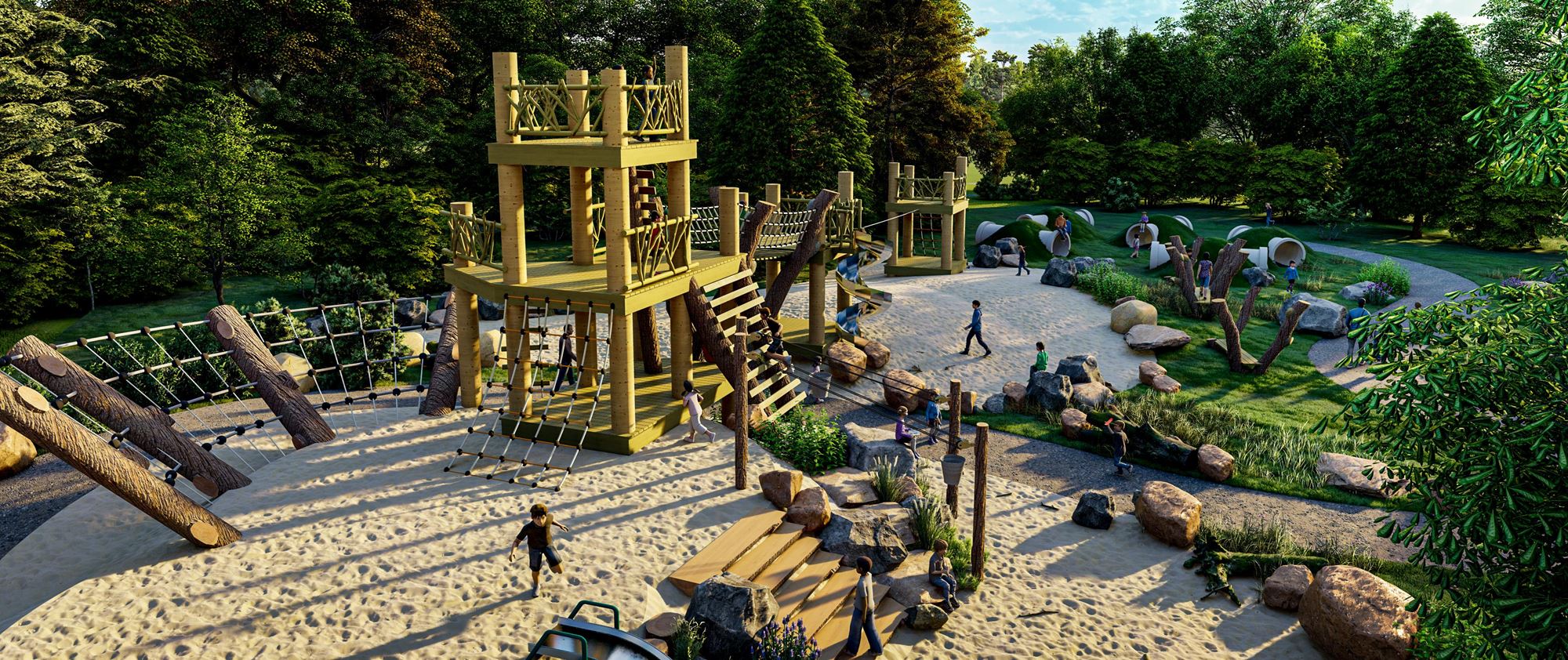 This whimsical four-season playground will use boulders, trees, shrubs, logs, rocks and water to provide open-ended, physically challenging and unstructured play opportunities.