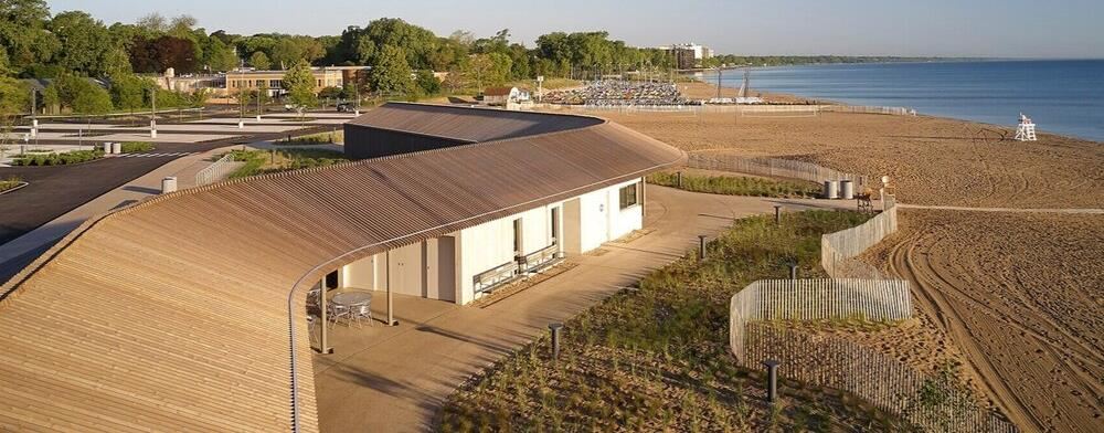 With the demolition of the existing beach house and parking lot, a decidedly lighter, more transparent design was imagined by the architects to leave the panoramic views of the Lake Michigan shoreline as unimpeded as possible. Our team designed a dune landscape to envelop and complement the graceful new architectural design, selecting native plantings suited to the sandy conditions. Drifts of seasonal color are woven through the masses of marram grass providing ecological diversity to harmonize with the surrounding Gillson Park.