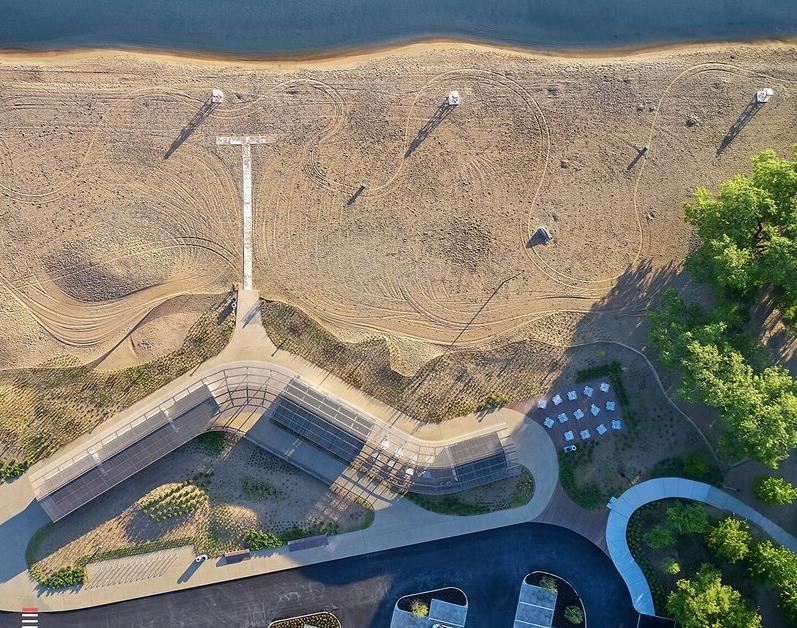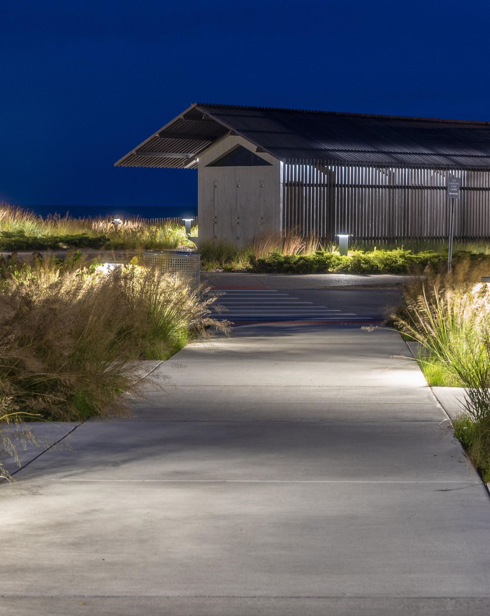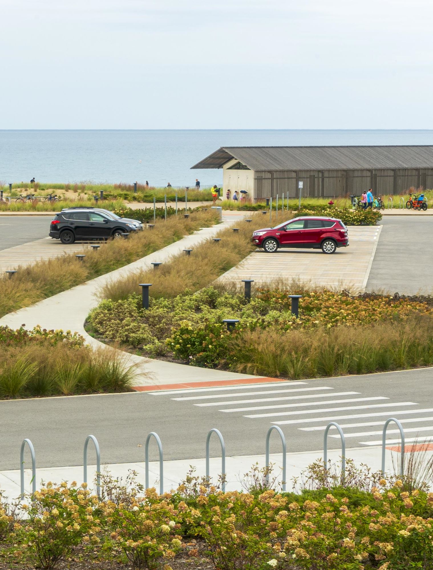 A 325 car surface parking lot was also developed as part of the new beach house. Light colored pervious pavers were used in parking areas, with shade tree and ornamental grass filled bioswale planters artfully arranged throughout the lot to choreograph views to the lake, treat surface runoff, and satisfy the local landscape ordinance. Colorful, yet sand-tolerant, plantings billow alongside bike and pedestrian paths that enter the site, providing a welcoming experience for visitors.