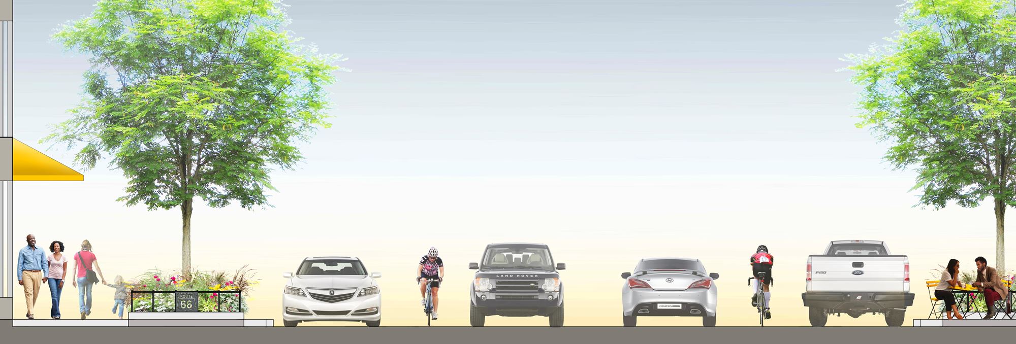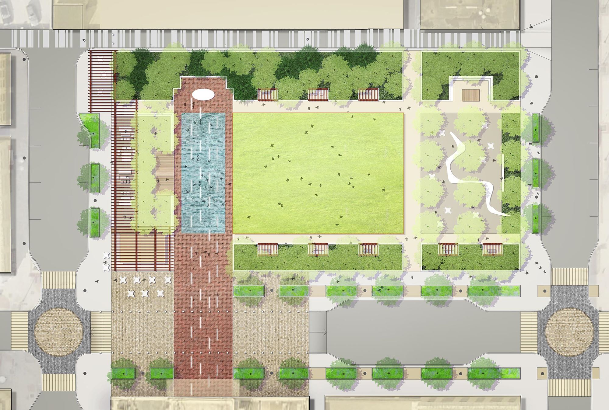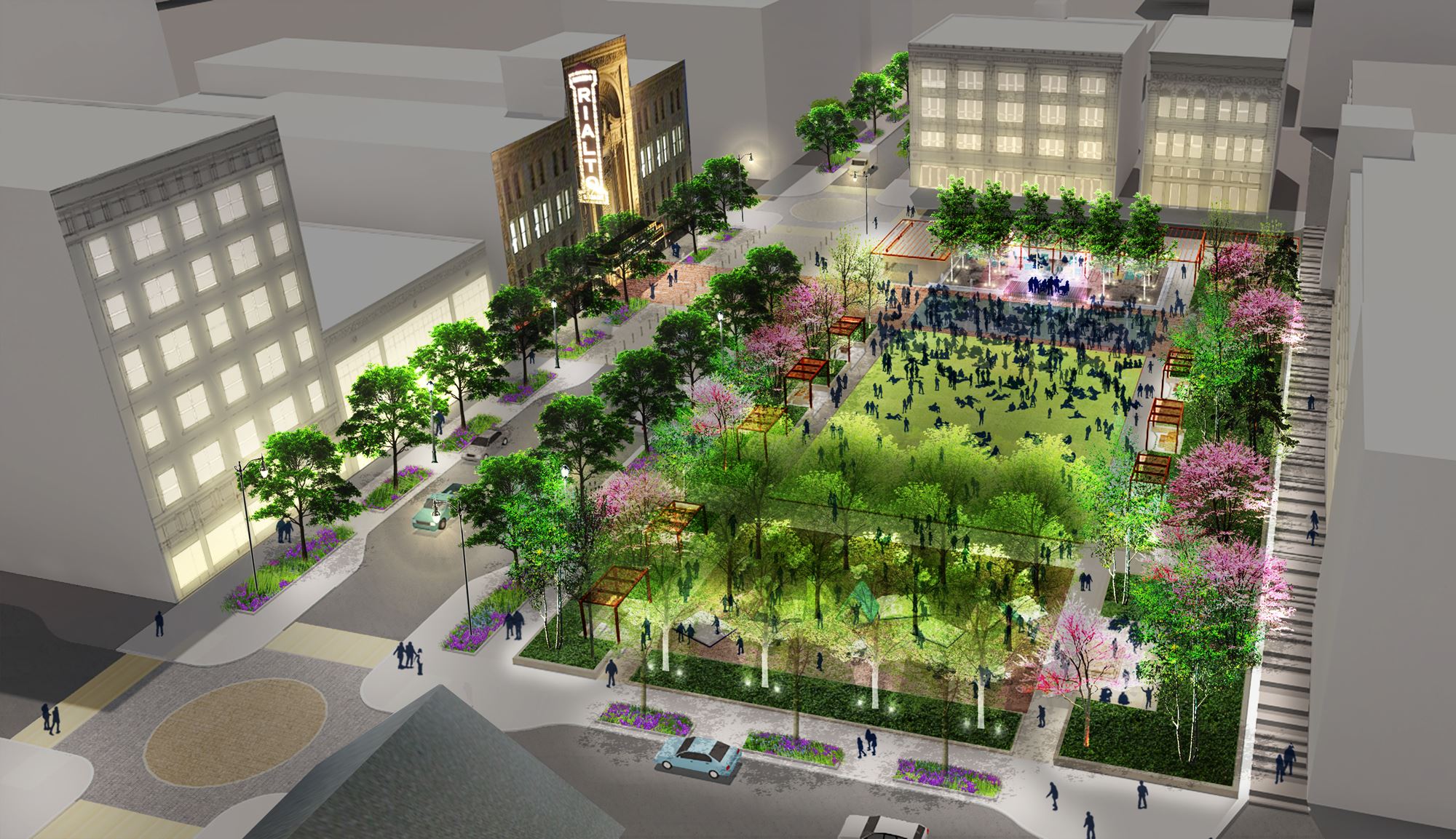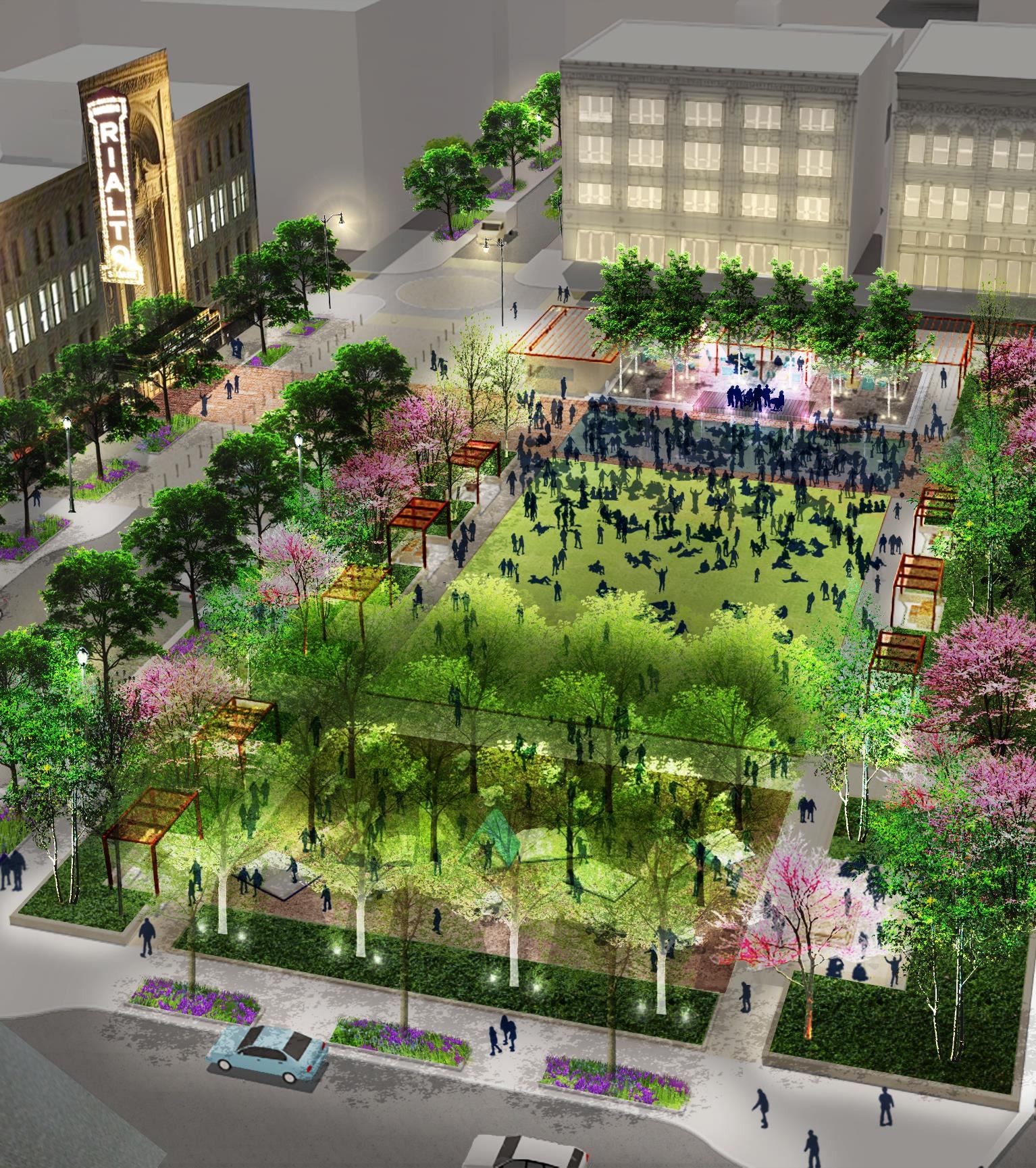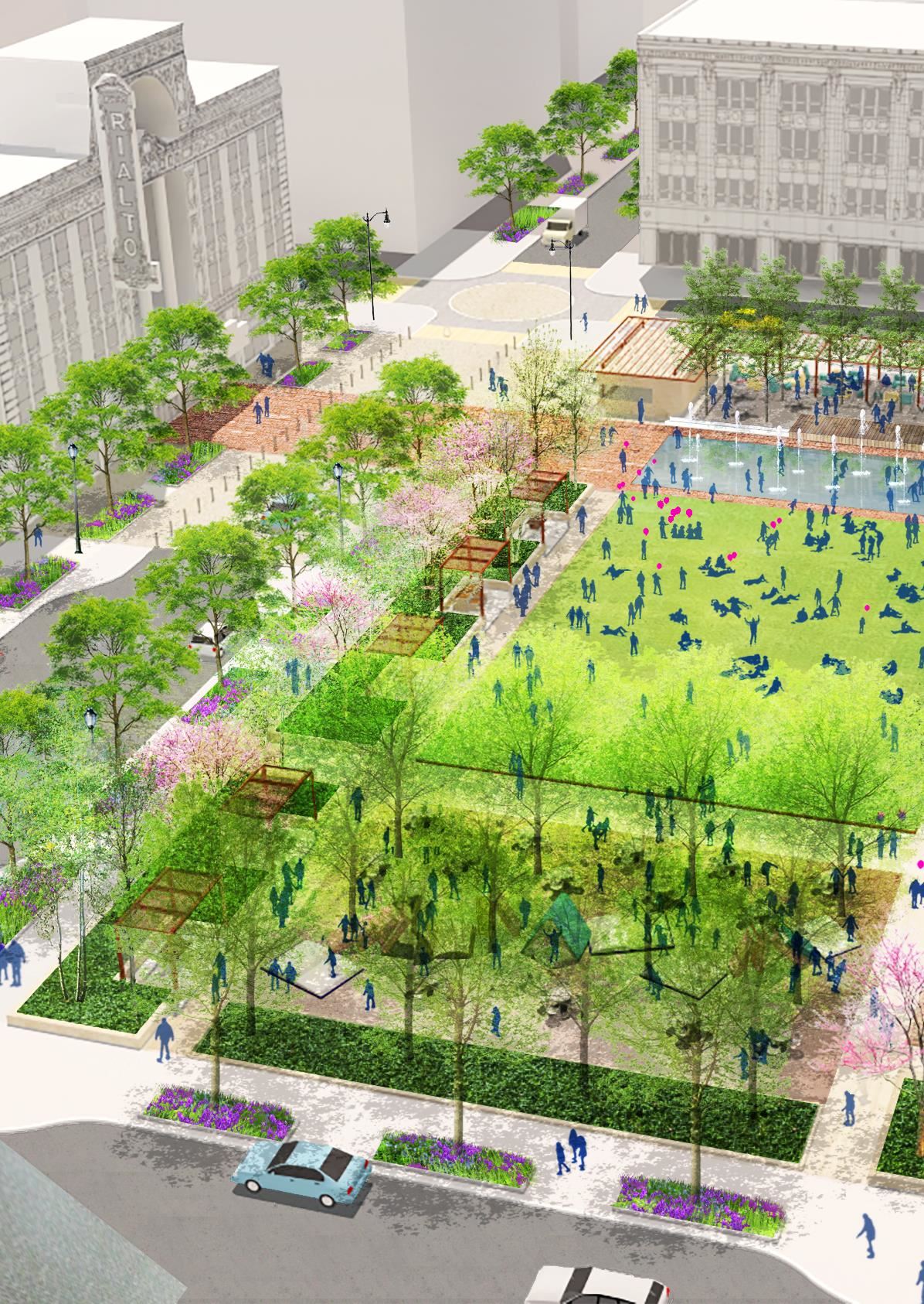 Our team worked collaboratively with the community to craft a Master Plan for the proposed City Square and the adjacent Chicago Street (Historic Route 66), proposing a design with a series of distinct outdoor rooms as settings for diverse experiences. The design has classic bones and a contemporary skin, providing a front yard for locals and a welcome mat for guests with elements such as a red carpet plaza extending into the site from the Rialto Theater, and a thematic garden associated with the Joliet Public Library.