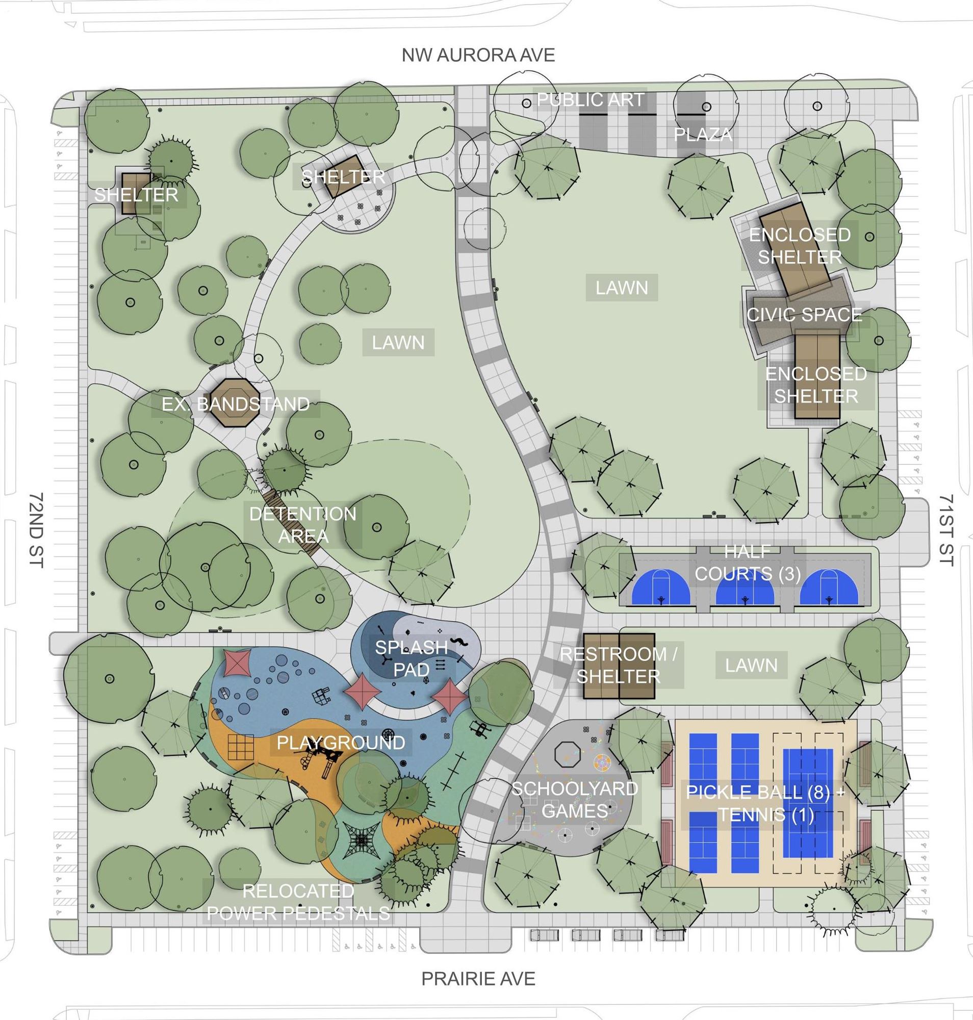 This iconic park boasts numerous mature trees and hosts the City's annual 4th of July festivities for the entire community. The site also contains a softball field used by the Urbandale High School girls team as their home field. The new plan sets a path for the City to move forward with more immediate additions including a splash pad and conversion of tennis courts for pickleball facilities, while creating a longer-term opportunity to relocate the local high school girls softball team from this park to a new facility on school property to make way for new enclosed park building facilities, an expanded playground, and amenities to support additional community recreation activities,