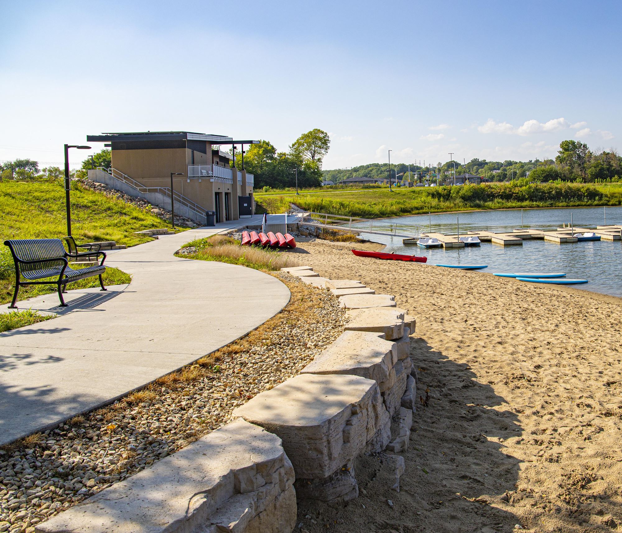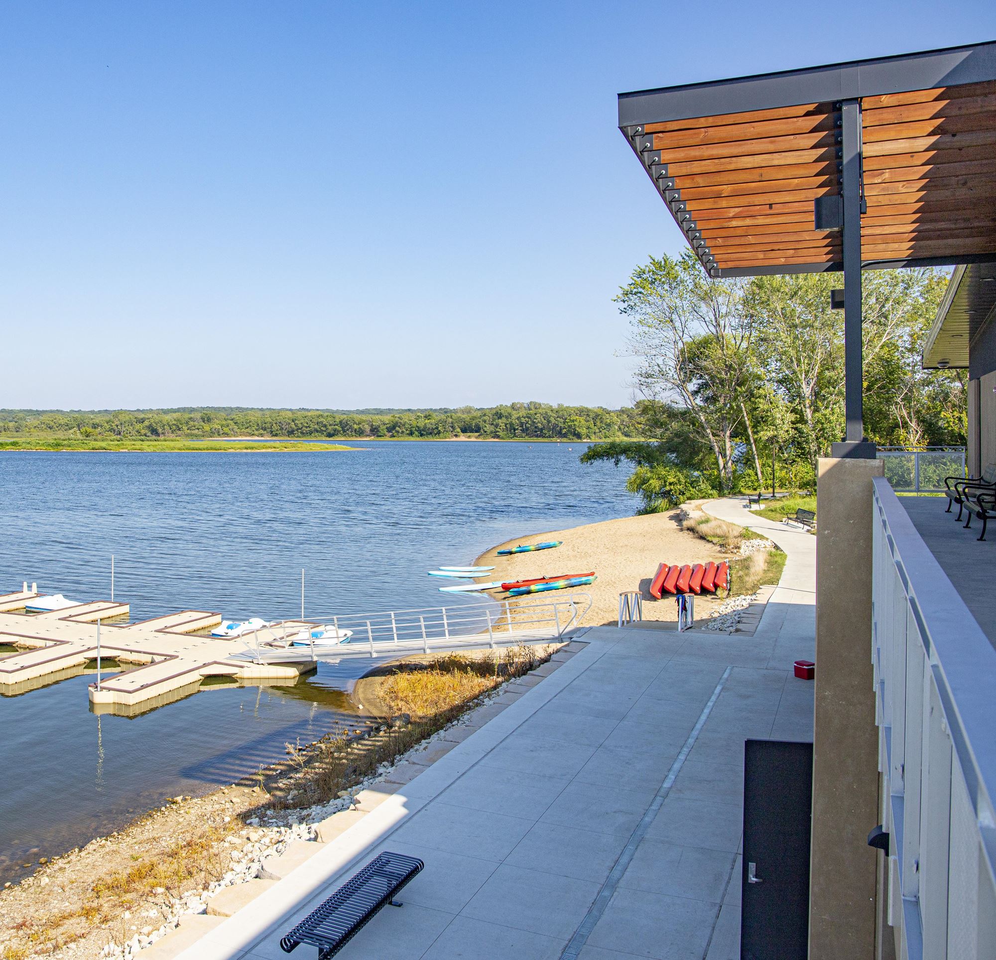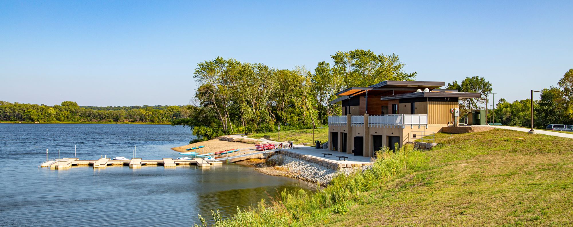 Confluence teamed with OPN Architects to provide site design and landscape architecture services for a new Boathouse to be located at Blue Heron Lake in West Des Moines, Iowa. The siting of structure was unique in that the entire lower story of the Boathouse is designed to withstand the intermittent flooding which occurs seasonally within the park. The lower story of the structure provides kayak and other small water craft storage which park users can rent. There is access to a dock with 12 slips, an accessible kayak launch, and gathering space where park staff can instruct small groups on the use of the various equipment available. The upper story of the facility, which is accessed by stairs as well as an accessible ramp system, provides a rental and concession area as well as restrooms for the facility user. An upper terrace provides an area where park patrons can relax and the view the park users enjoying all that the lake has to offer. On-site personal kayak storage, bicycle racks and a boat ramp is also available.
