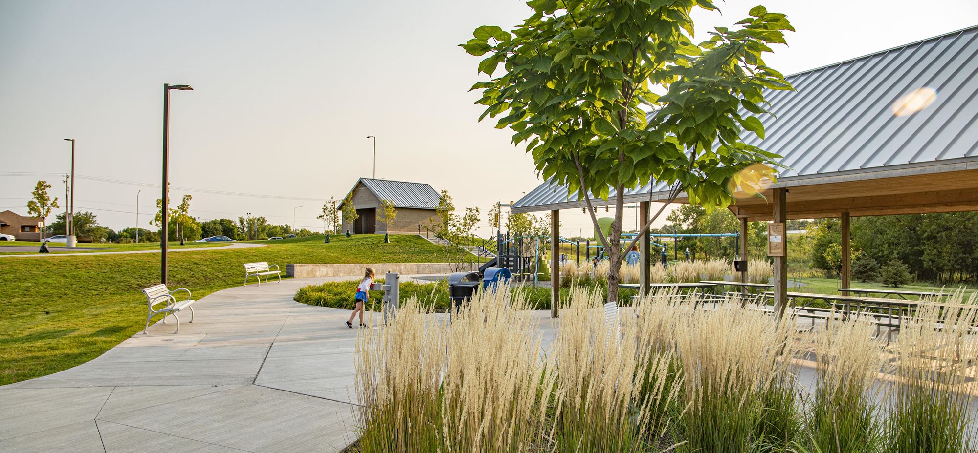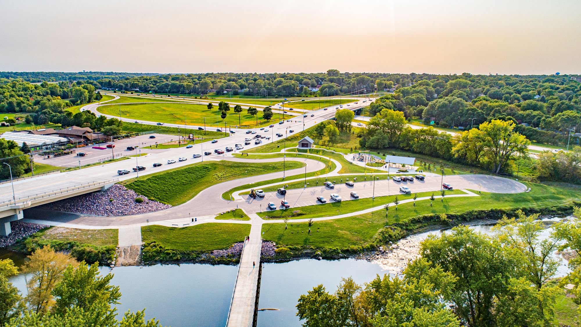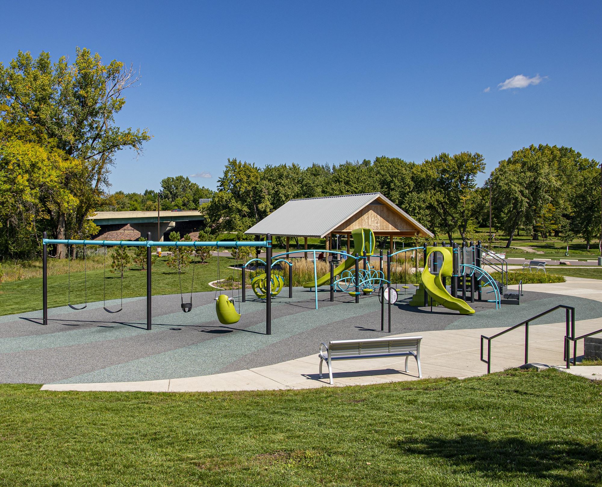 With changes to the road alignment and elevations, the existing park on the east bank of the river was no longer be accessible by vehicle so a new park and parking lot were constructed on the west bank. Built in conjunction with the City of Sioux Falls, the project includes a new pedestrian bridge across the Big Sioux River to link the new improvements to the existing bike trail and park. New park improvements include a playground, picnic shelter, restroom building, site furnishings, interpretive signage, water fountain, canoe drop off area, landscape and tree plantings.