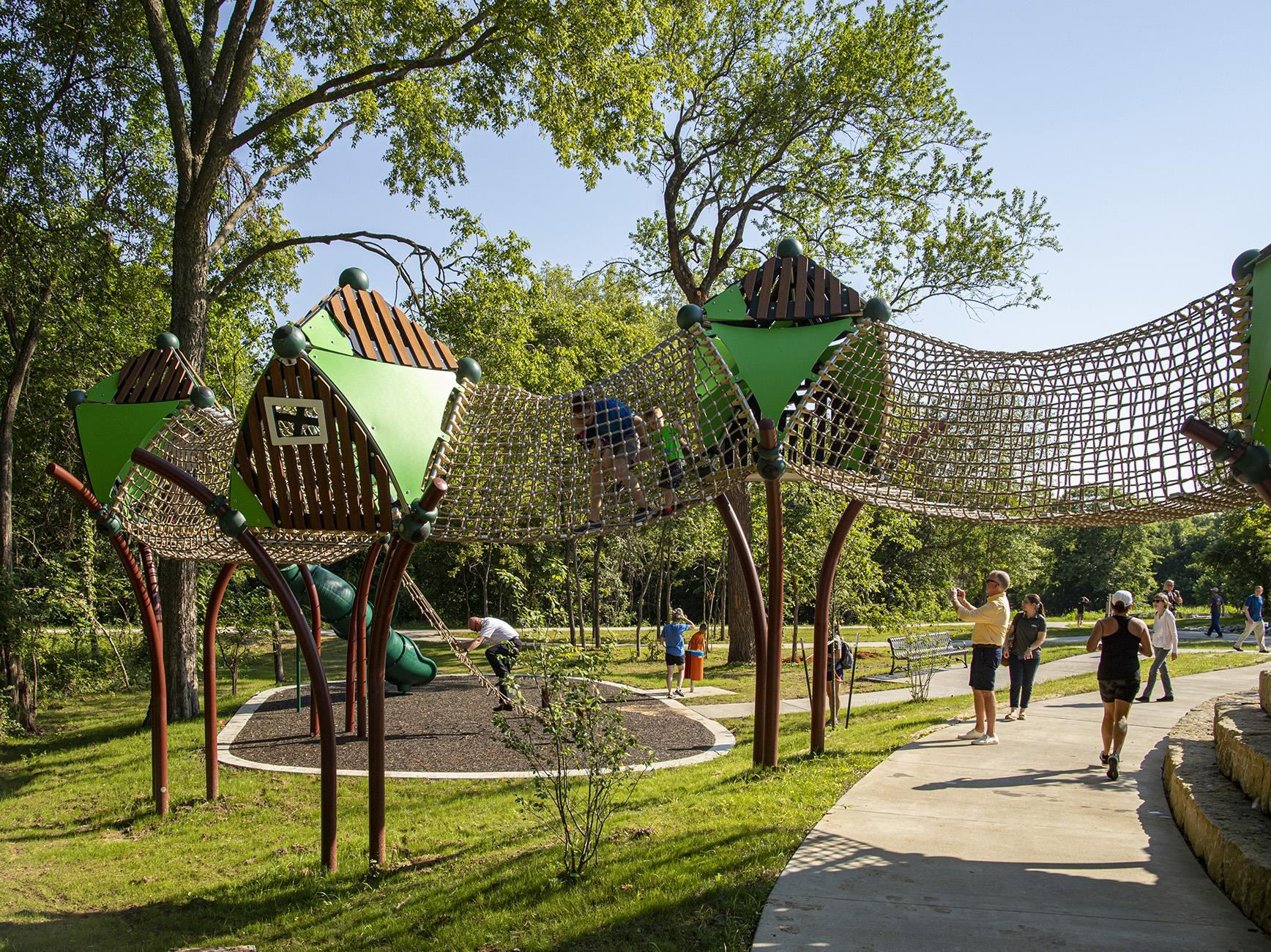 The adjacent tree-top playground provides elevated rope tunnels that pass over a park walkway below and into the existing tree canopy, eventually sliding down to an additional wooded play space below. The park structure includes ample family seating, restrooms and a wood-burning fireplace. Stormwater is captured to replenish the existing water table while integrating into the context of the surrounding native landscape.