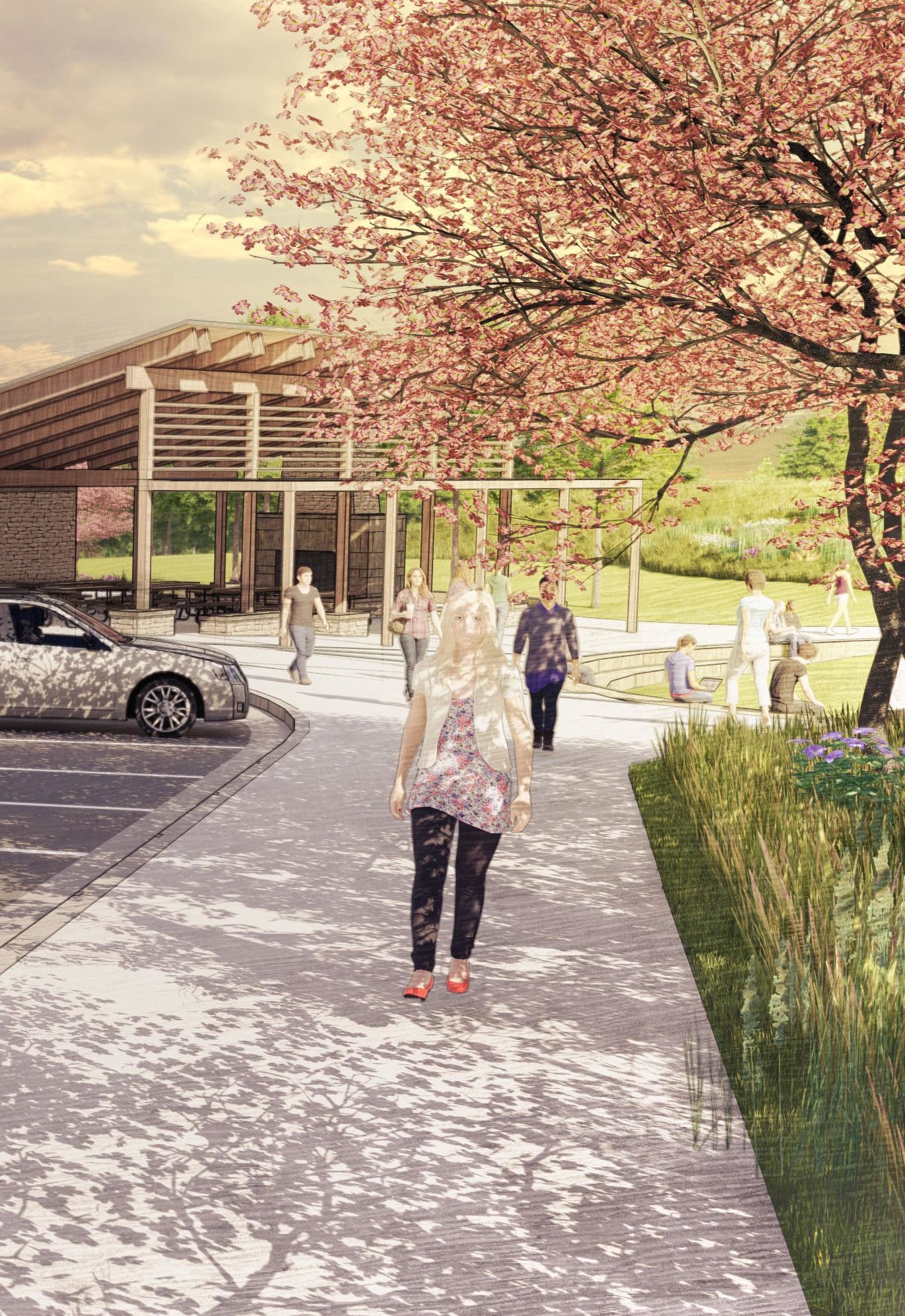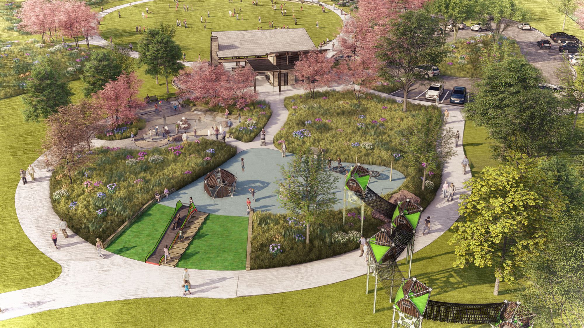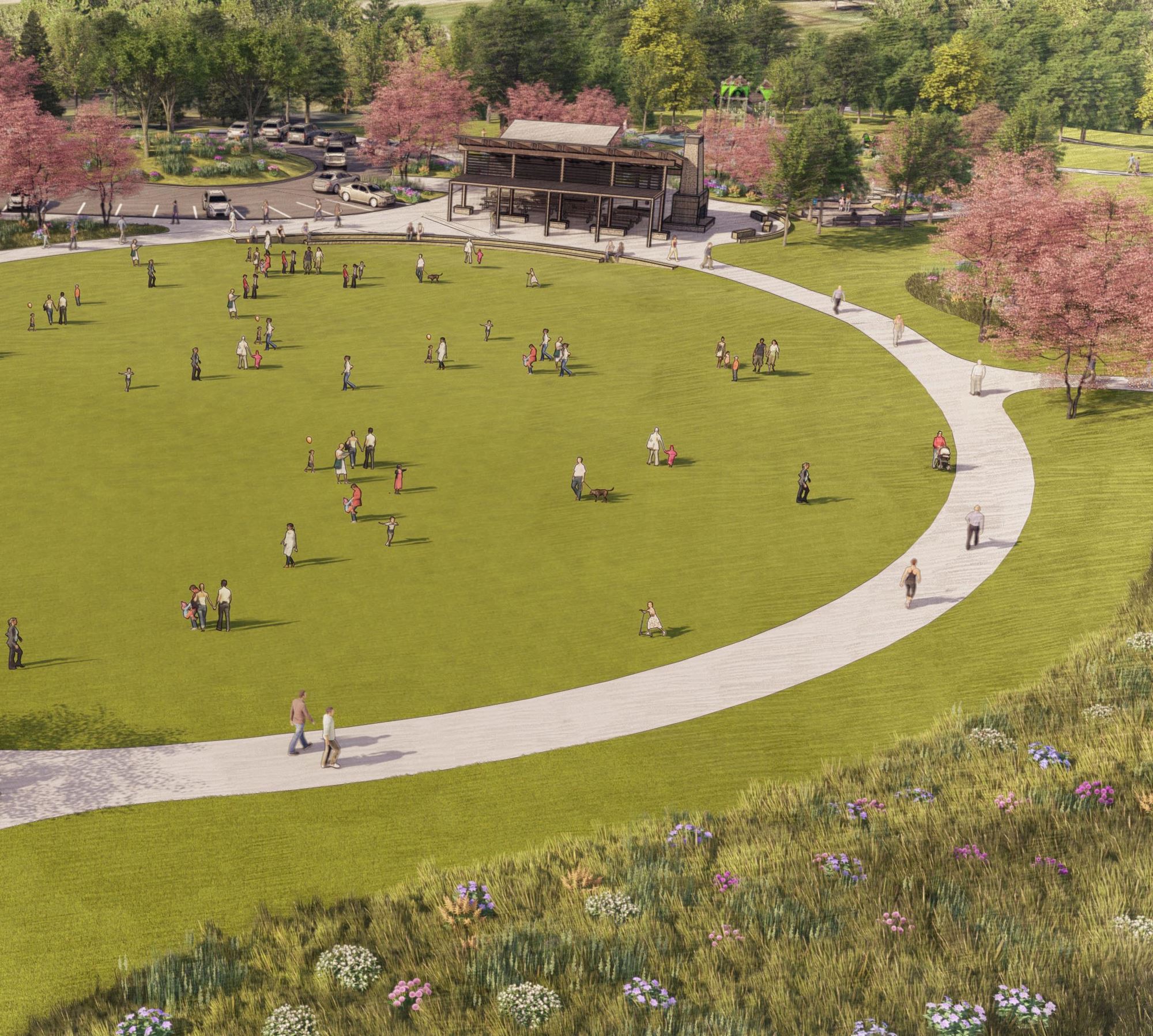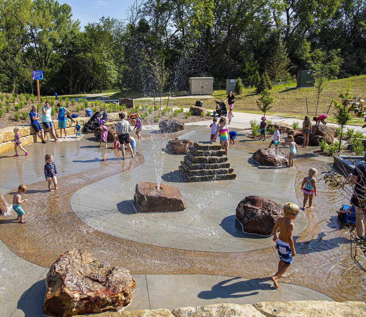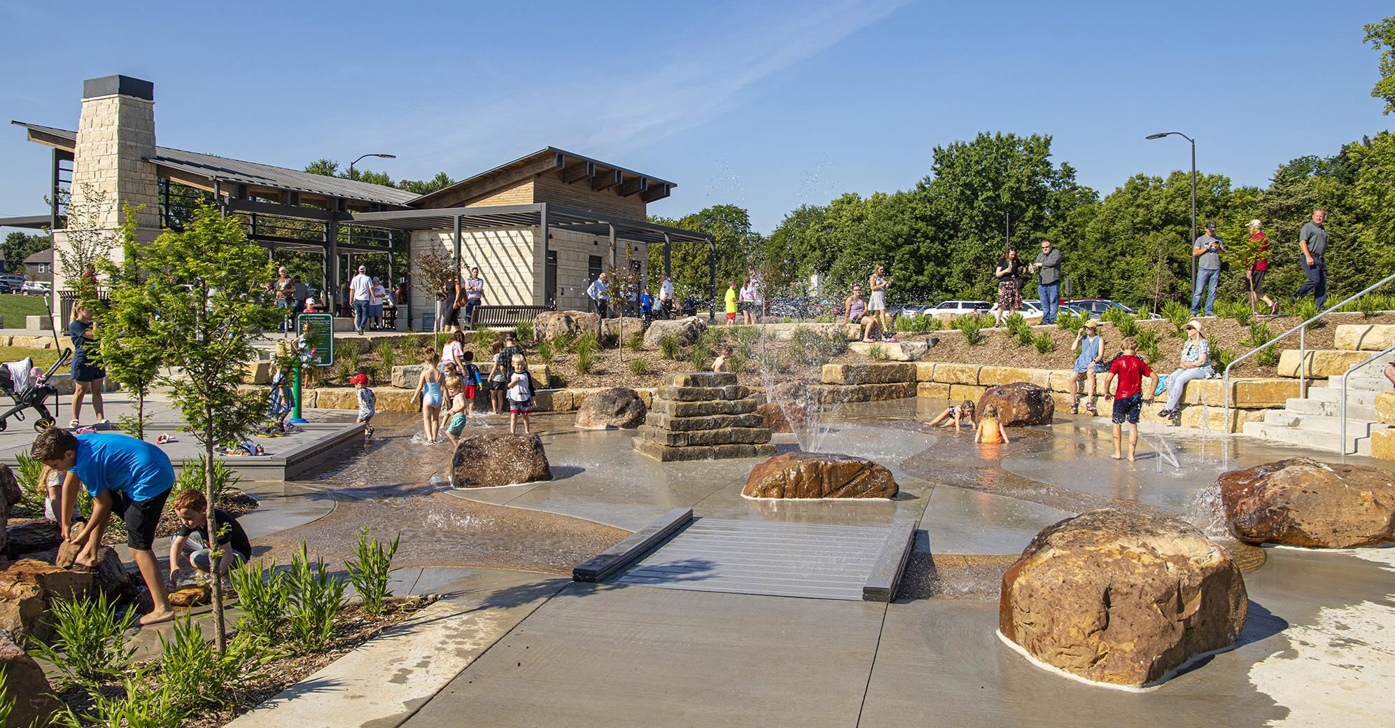 The design includes a winding park entry drive passing through "The Bluffs” with views to a defined park green, eventually arriving into the heart of the park containing a water play area. Children can engage with two water streams and boulder fountain sprays that send water skyward.
