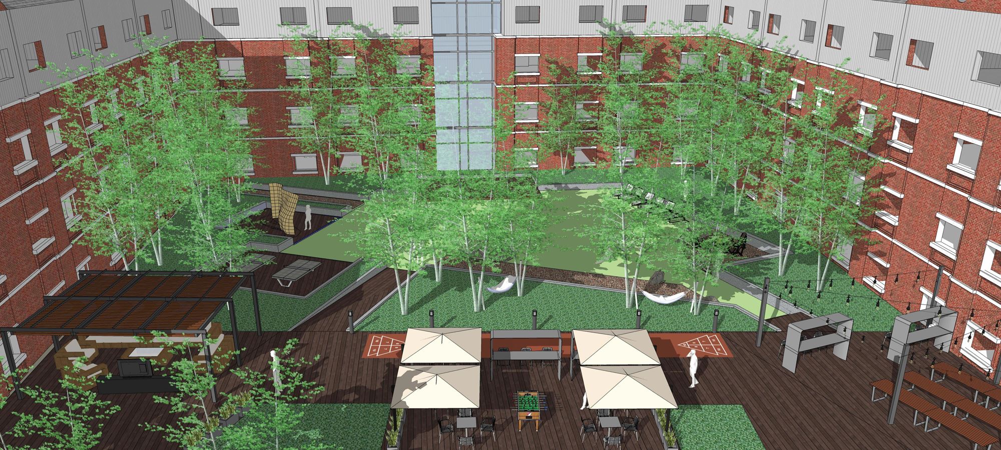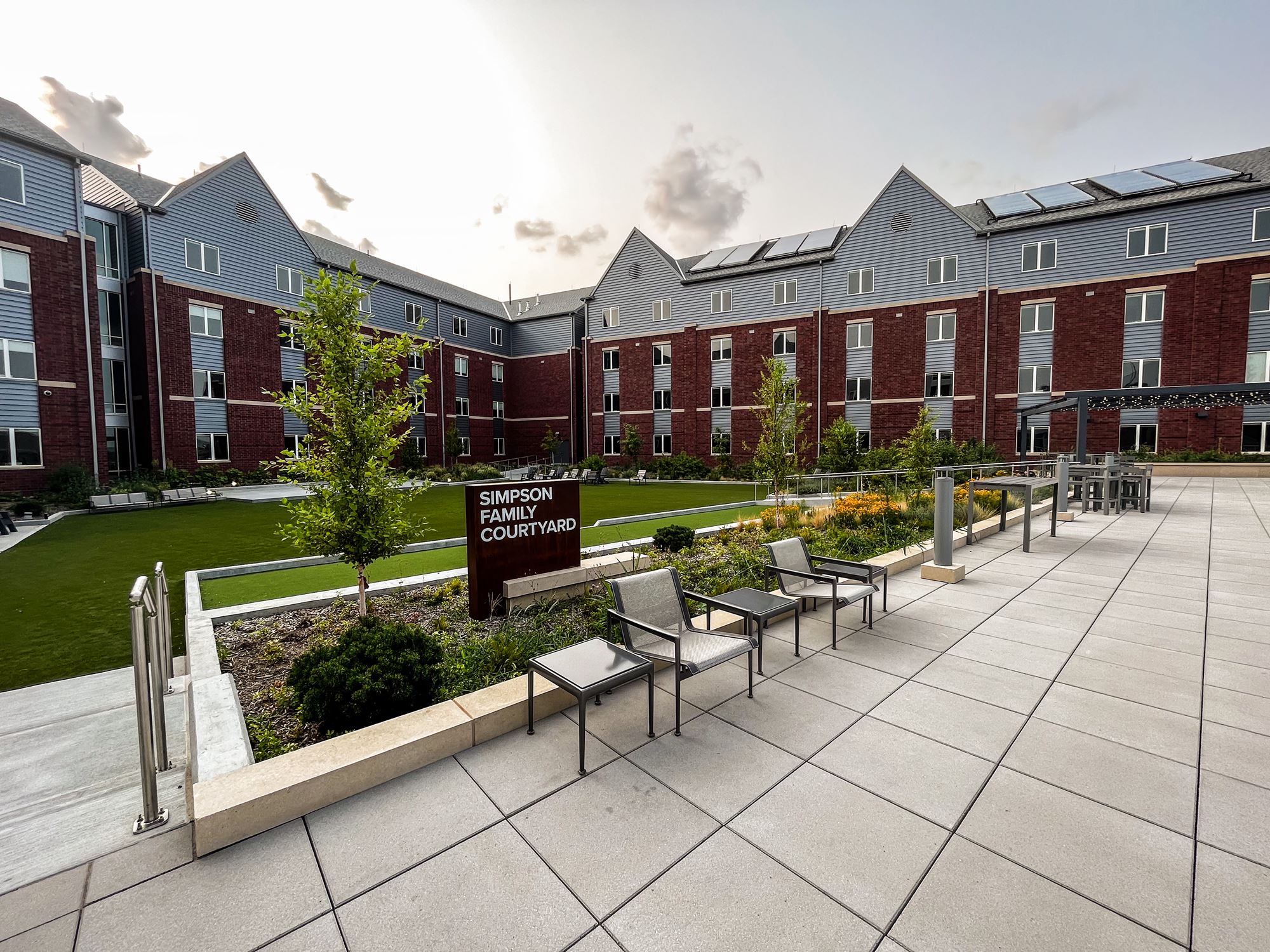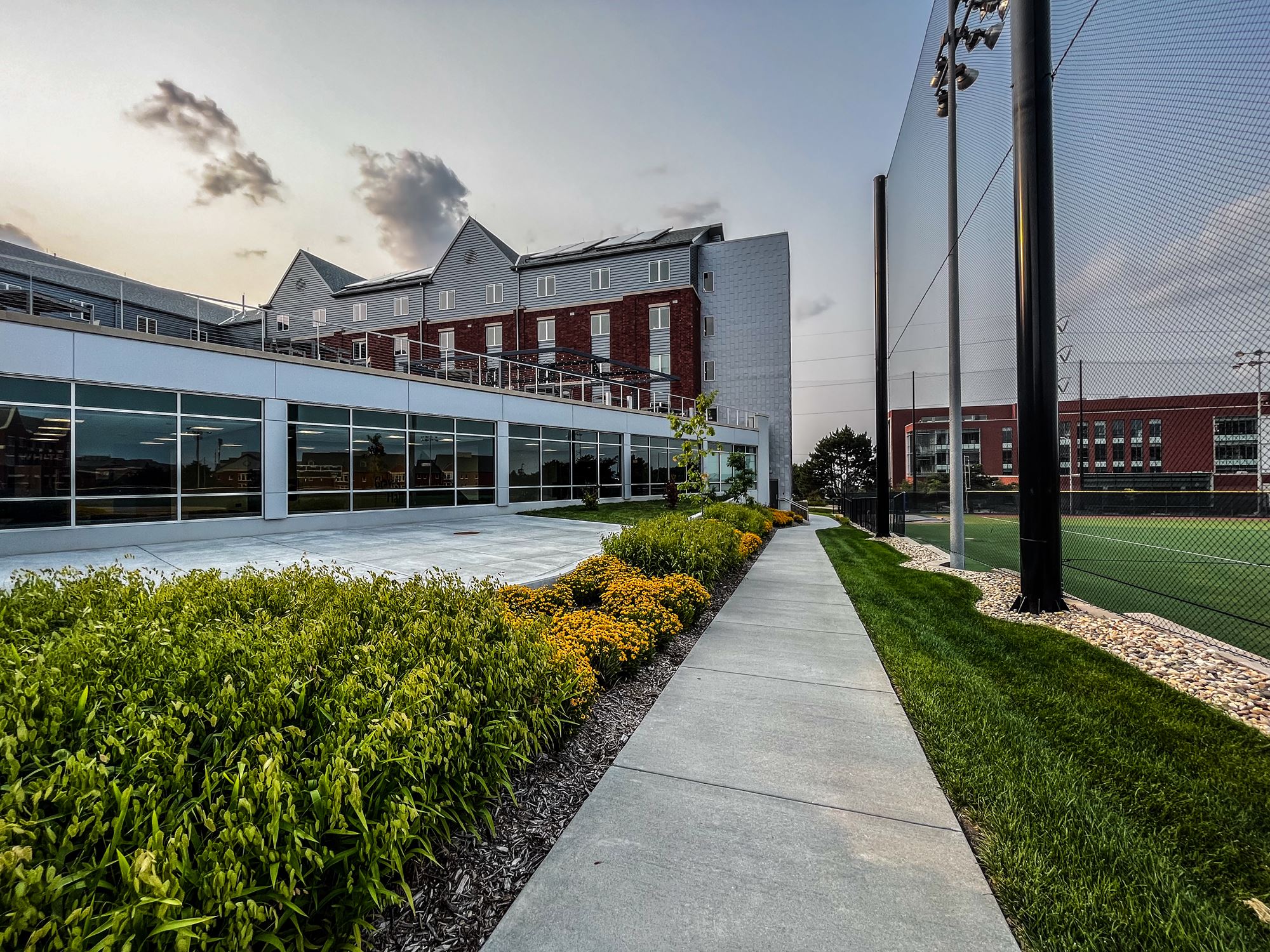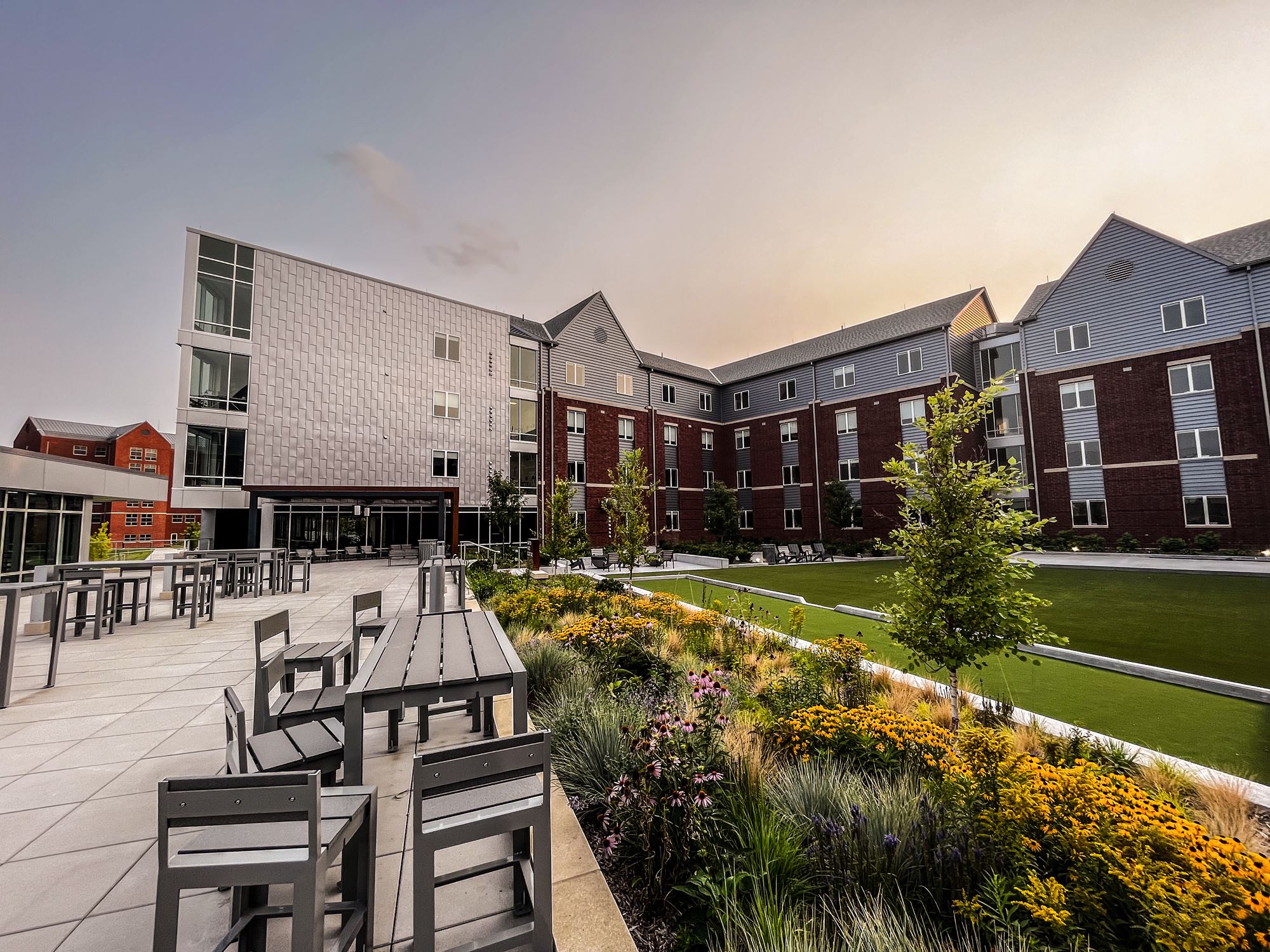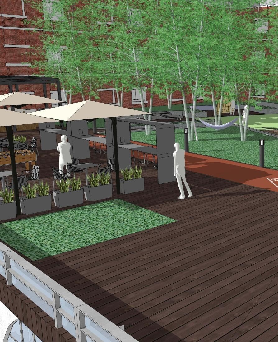 In alignment with our Campus Master Plan, future additional residence halls will be constructed and configured to frame a new main residential quad. Quality outdoor space is a primary campus focus and the rooftop deck provides a wide variety of active and passive spaces for students.
