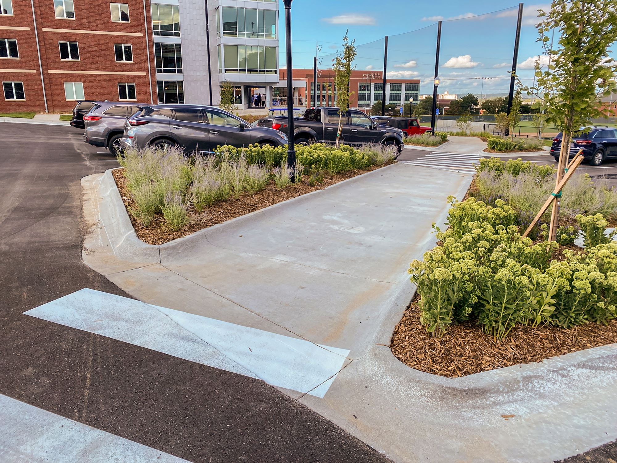 This residence hall provides incoming freshmen students a home with a mixture of study and living spaces, as well as convenient parking and a chic, rooftop amenity experience. Confluence collaborated with University Staff and the design team to place the building in a prime location overlooking the existing multi-purpose athletic field.
