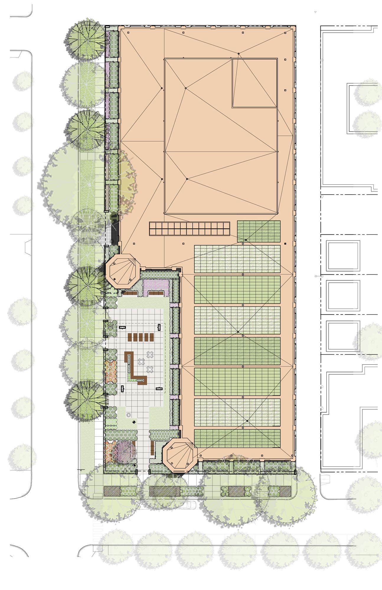 free-standing benches and adjacent companion seating are located along paved areas and around the perimeter. The planting design and plant palette were focused on hardiness, durability, seasonal interest, and low maintenance with simple horticultural requirements. The building also utilizes an integrated green roof.