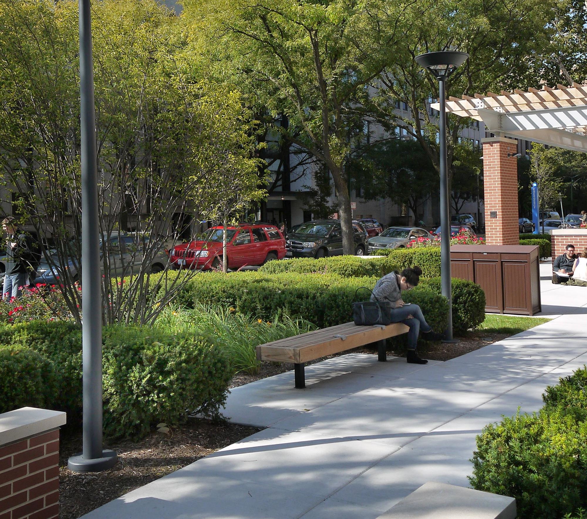 Due to pedestrian traffic generated by the building and its location within the DePaul Campus, this popular space is an attractive and well-used outdoor amenity - transforming an area which previously had little useable outdoor space. The central focus of this park-like campus addition is an overhead trellis structure which provides shade, a canopy overhead, and a pedestrian-friendly scale for this space - as it is adjacent to the new four-story building.