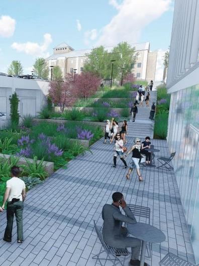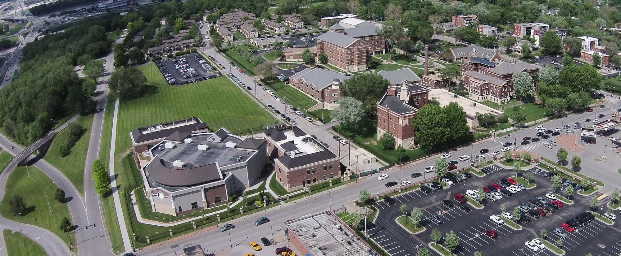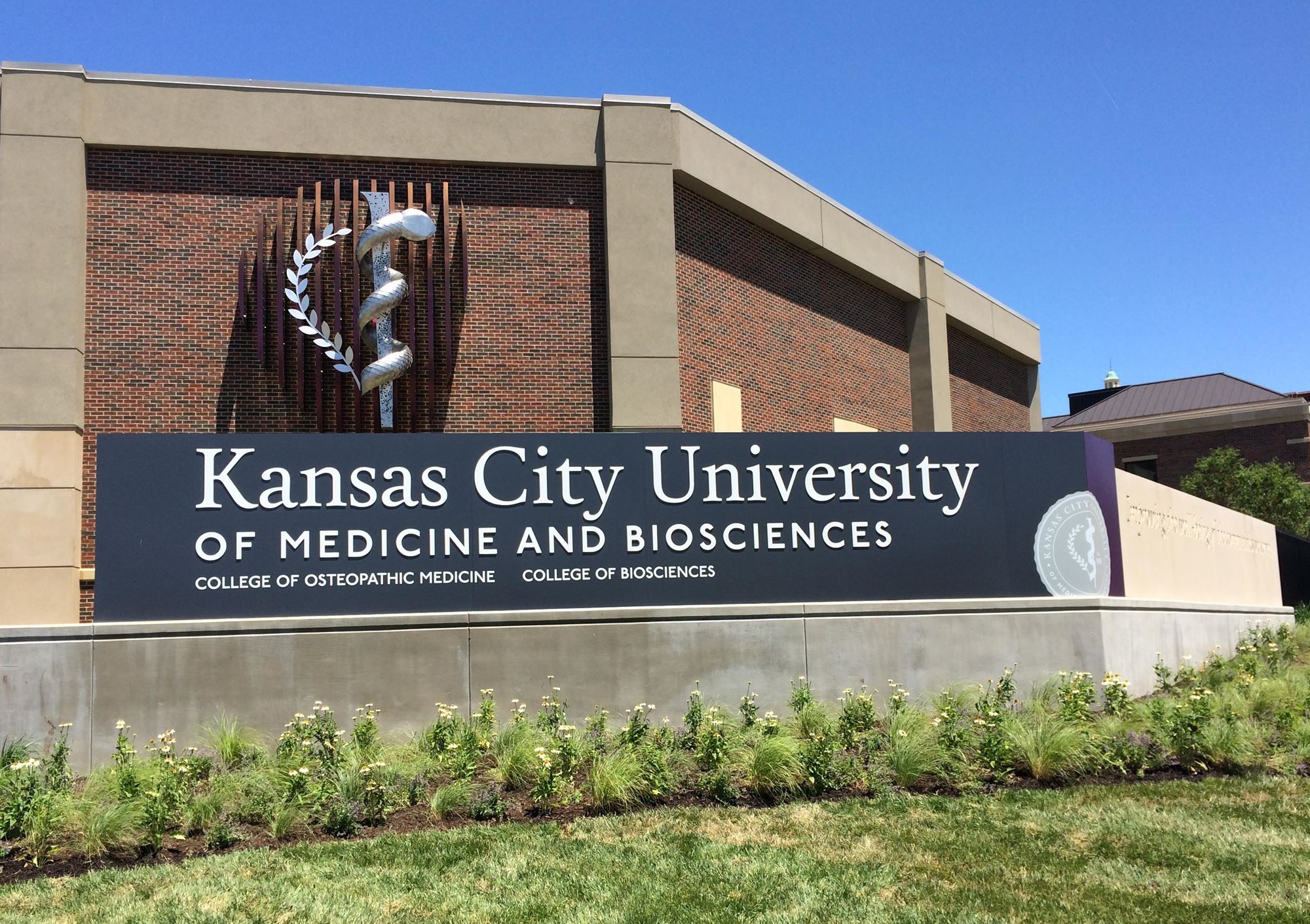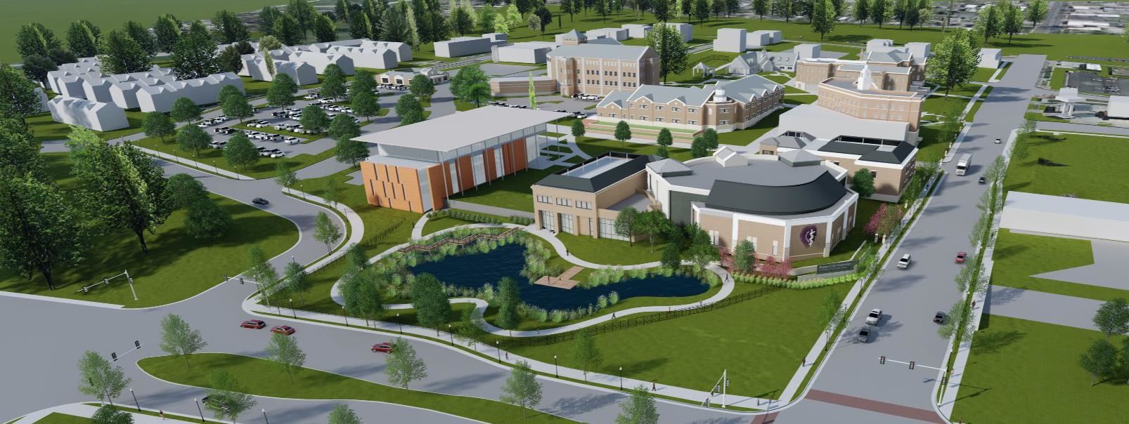Our team has also been instrumental in several master plan implementation projects. These include a new primary campus identification sign supporting KCU's new brand, campus expansion through new property acquisition, construction of a new $35M Center for Medical Education and Innovation facility adjacent new campus quad space, and planning for a regional stormwater treatment feature (in partnership with the City) to remove the entire campus from the City's combined sewer overflow system.