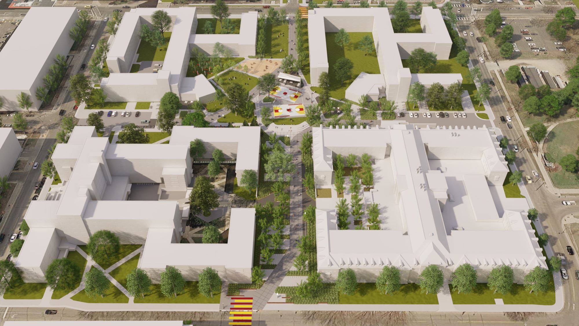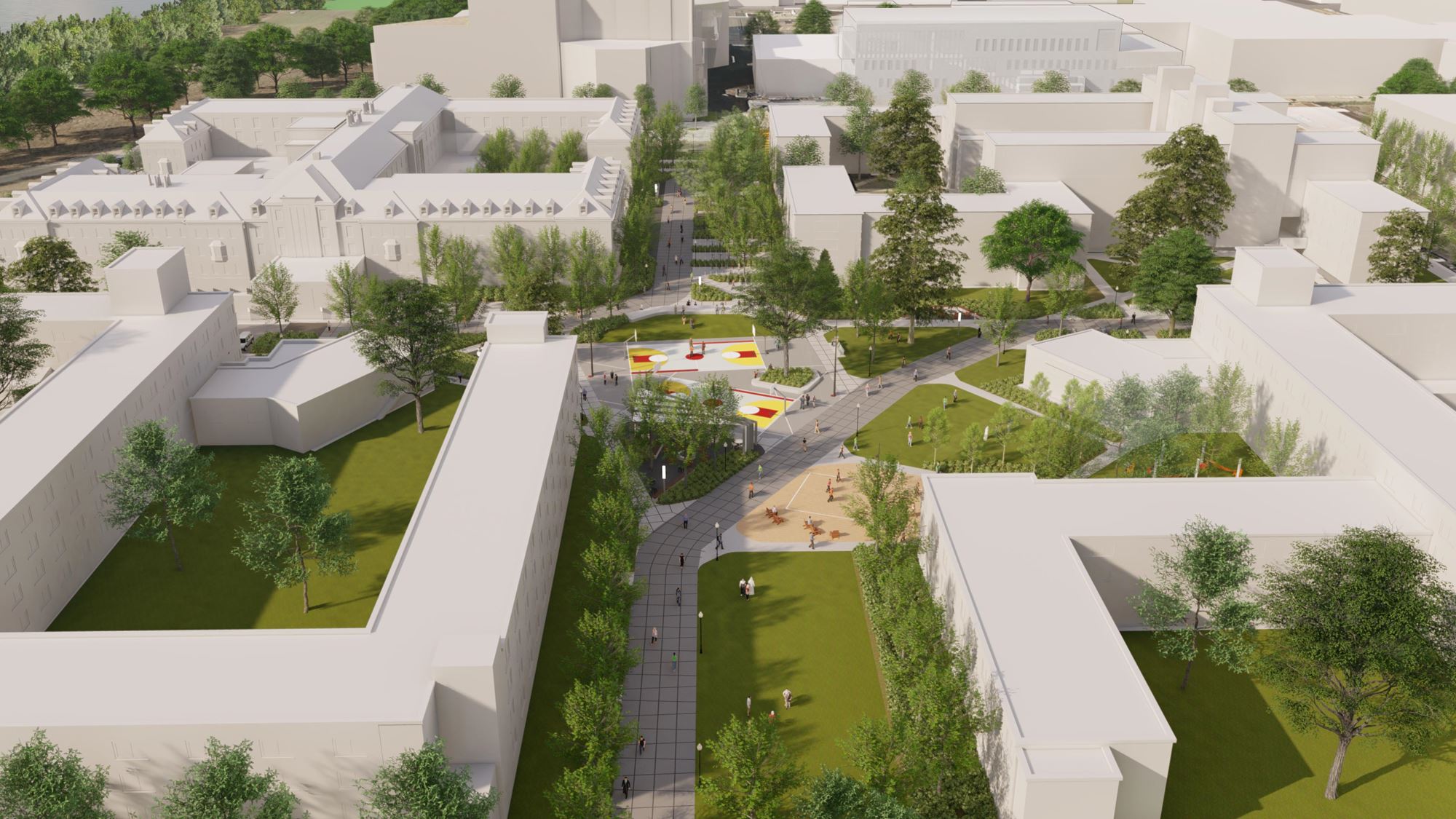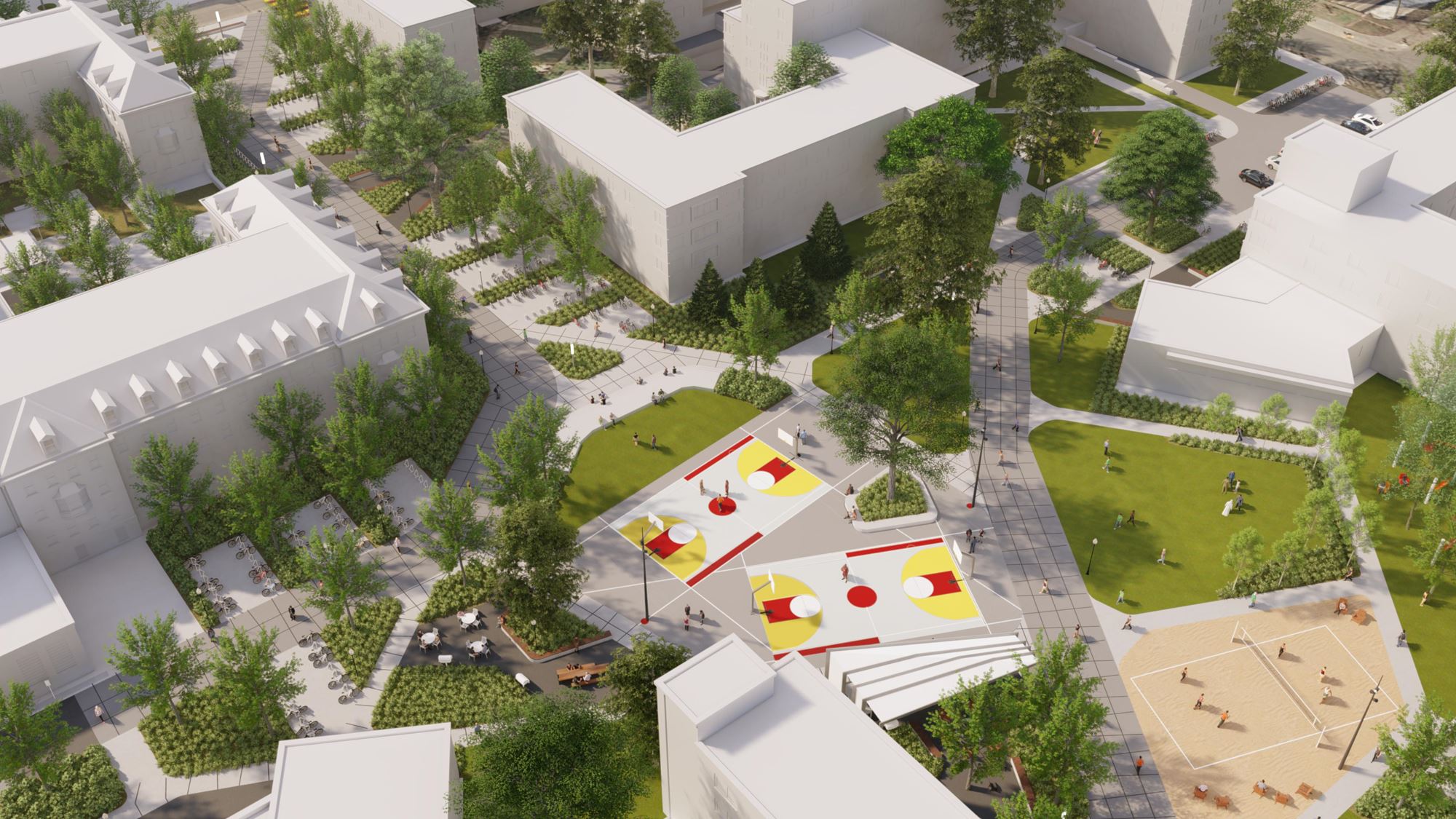 The redesign of the Superblock prioritizes the pedestrian through the Essex Corridor and invites students to congregate, socialize, play and relax.
