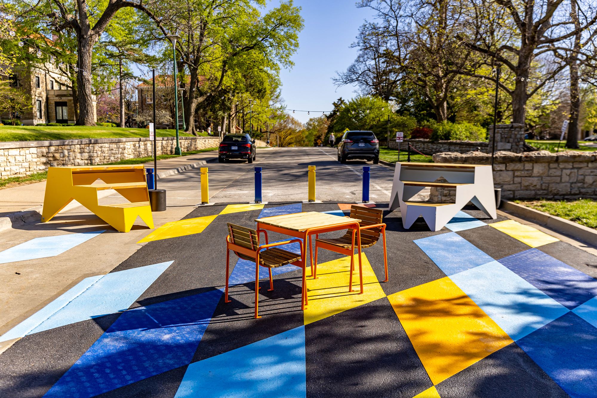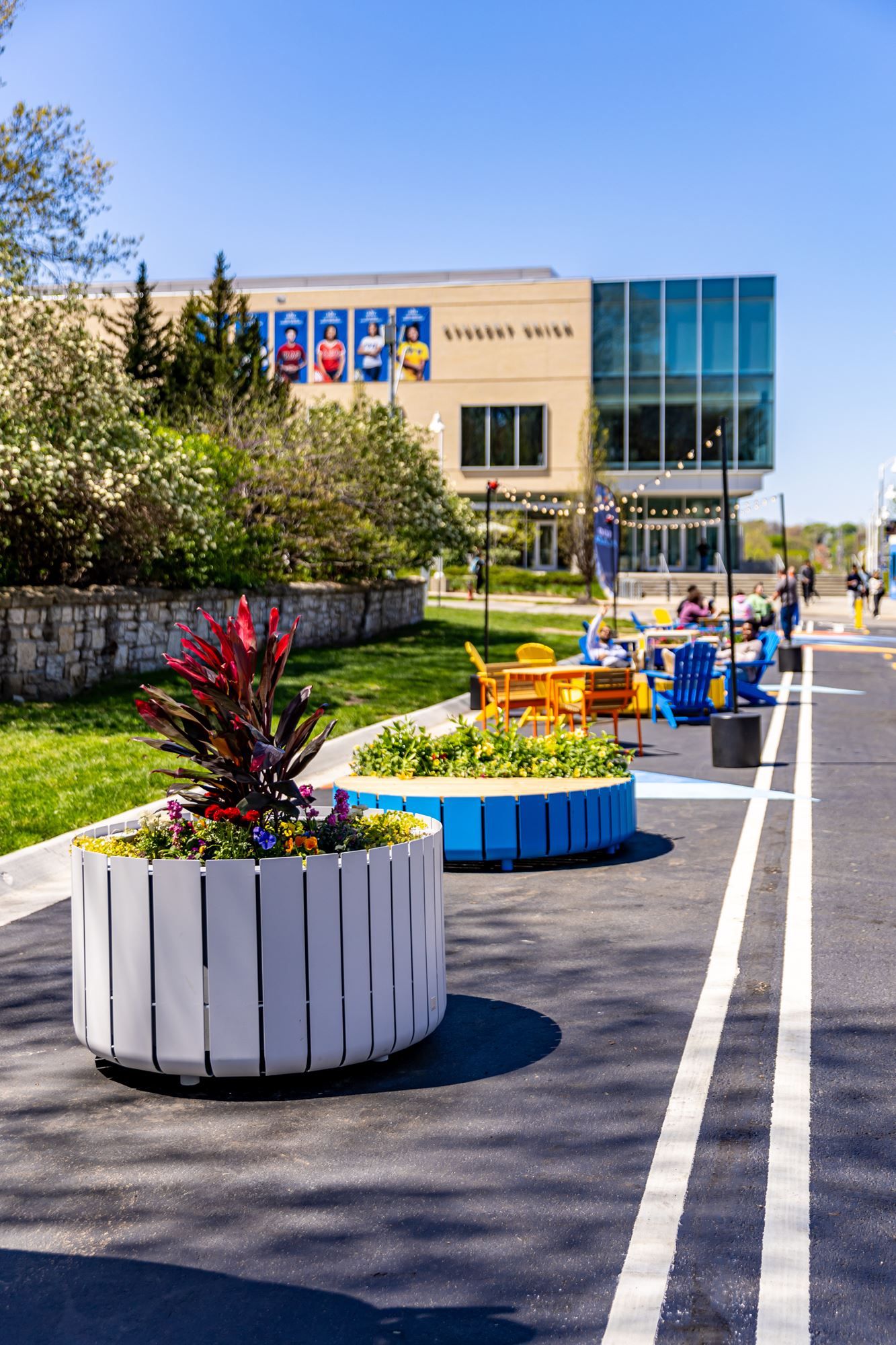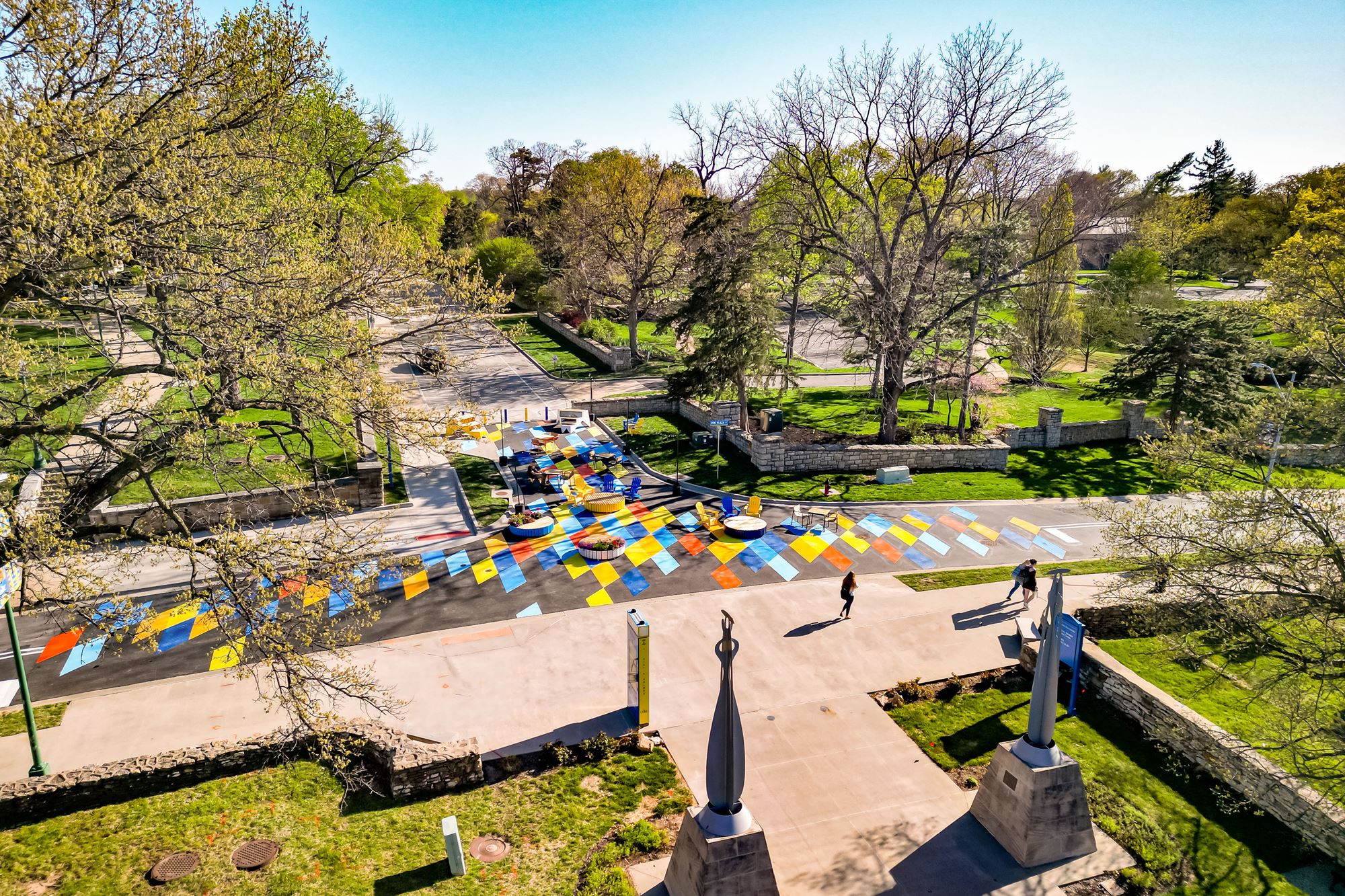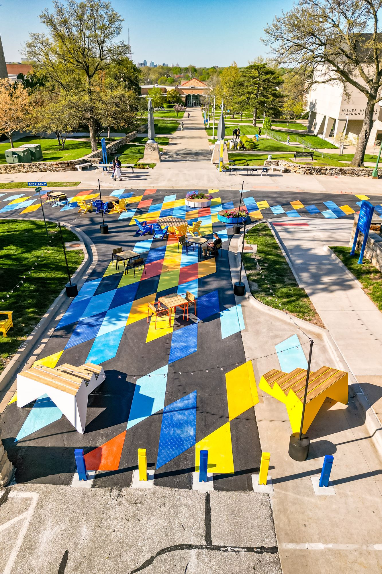 A major factor in the project’s success was Linda Hall Library vacating half of 51st Street, allowing the University to utilize the roadway and adjacent greenspace fully. The design limits vehicular access to UMKC maintenance crews, deliveries, and emergency services. Inspired by tactical urbanism, the improvements emphasize flexibility and low-maintenance features such as paint striping, bollards, a dedicated bike lane, yard games, string lighting, and site furnishings.