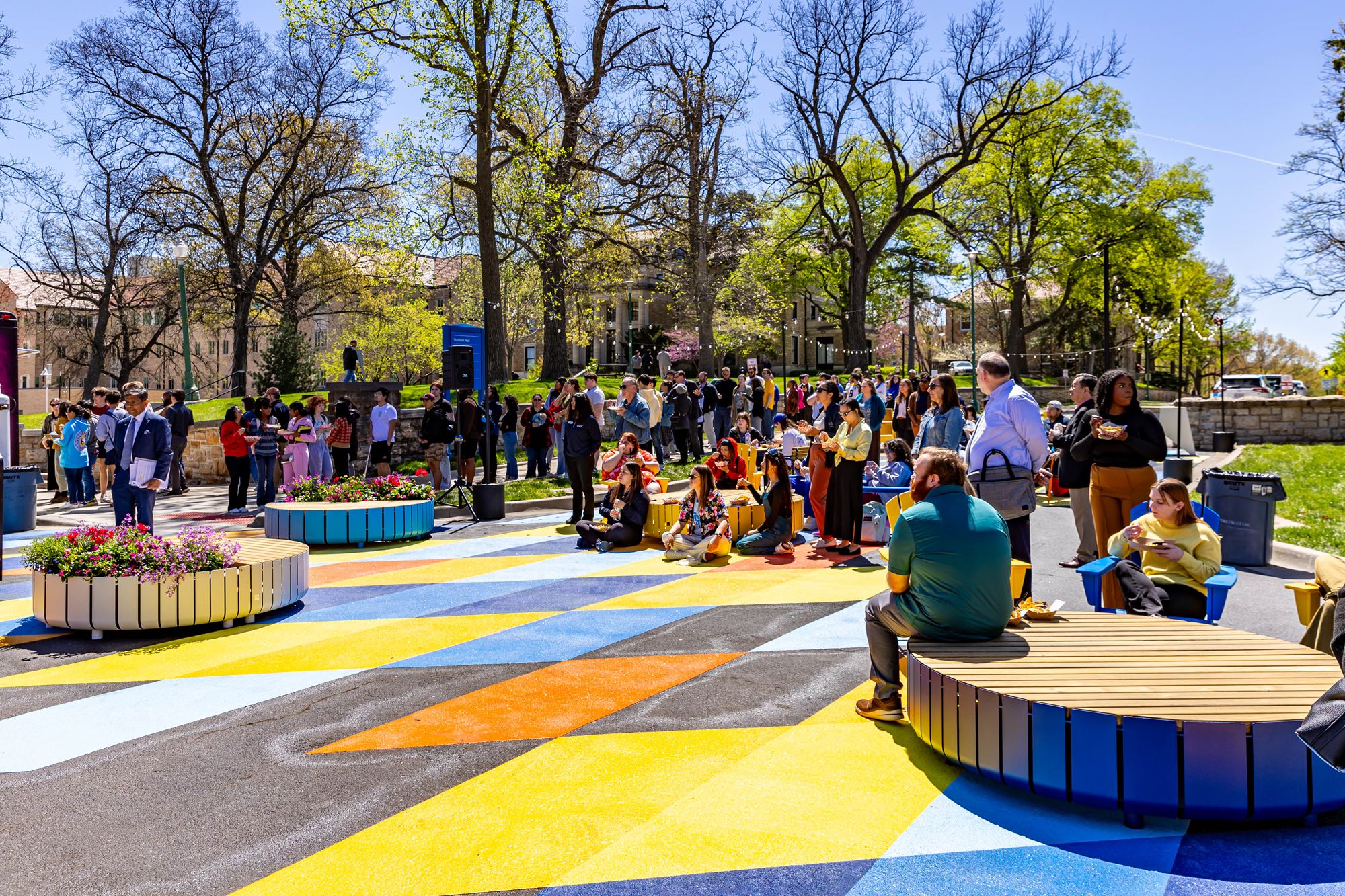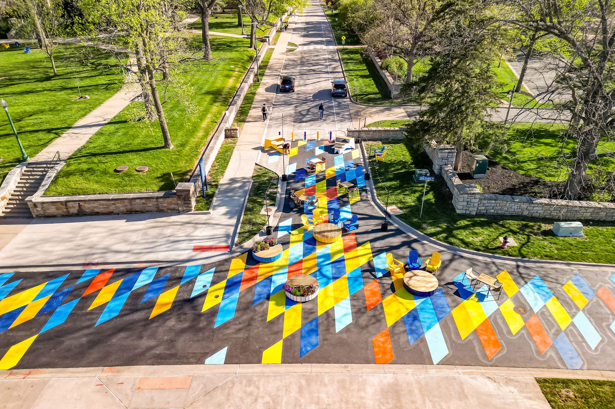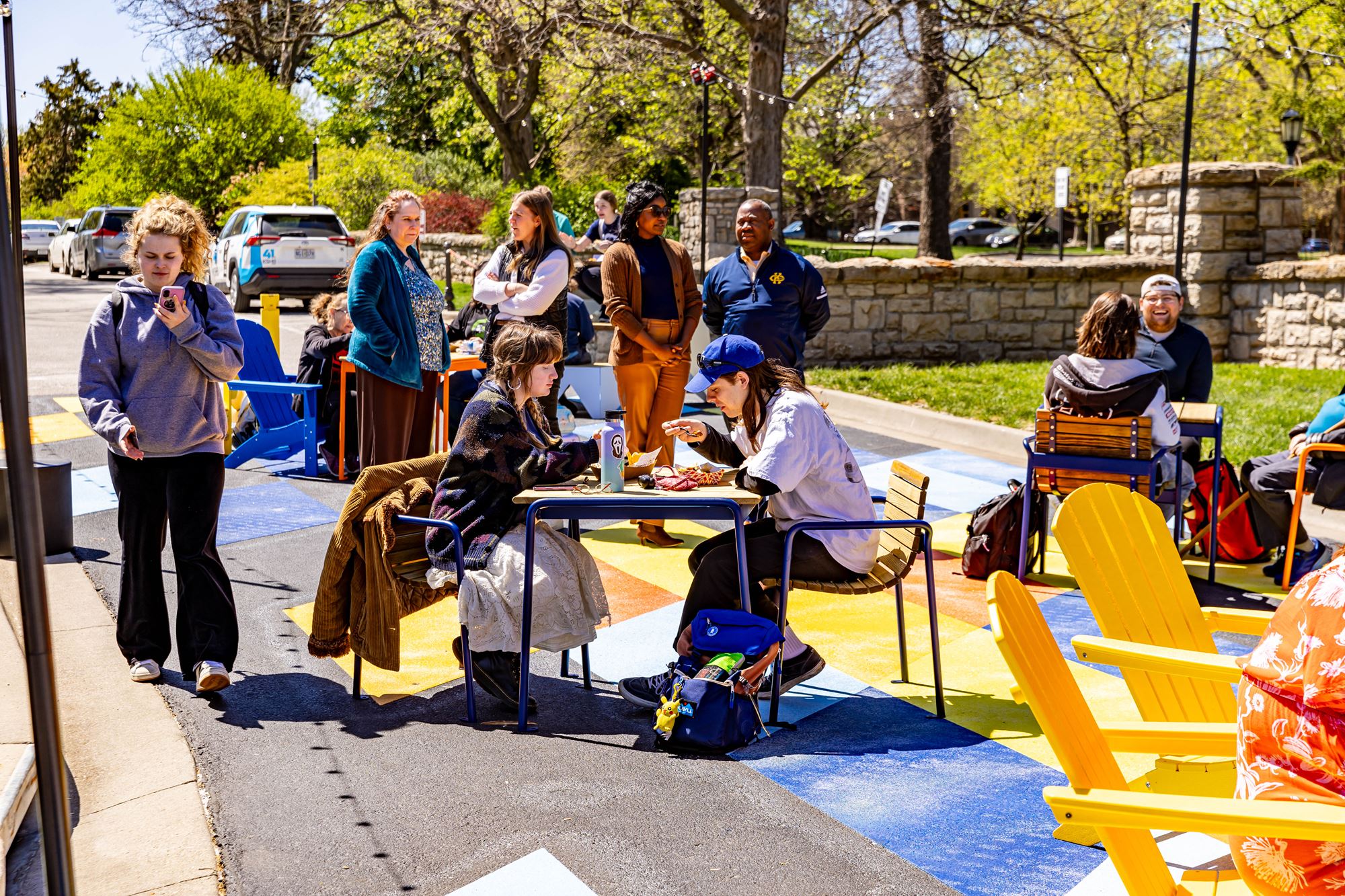 A major factor in the project’s success was Linda Hall Library vacating half of 51st Street, allowing the University to utilize the roadway and adjacent greenspace fully. The design limits vehicular access to UMKC maintenance crews, deliveries, and emergency services. Inspired by tactical urbanism, the improvements emphasize flexibility and low-maintenance features such as paint striping, bollards, a dedicated bike lane, yard games, string lighting, and site furnishings.