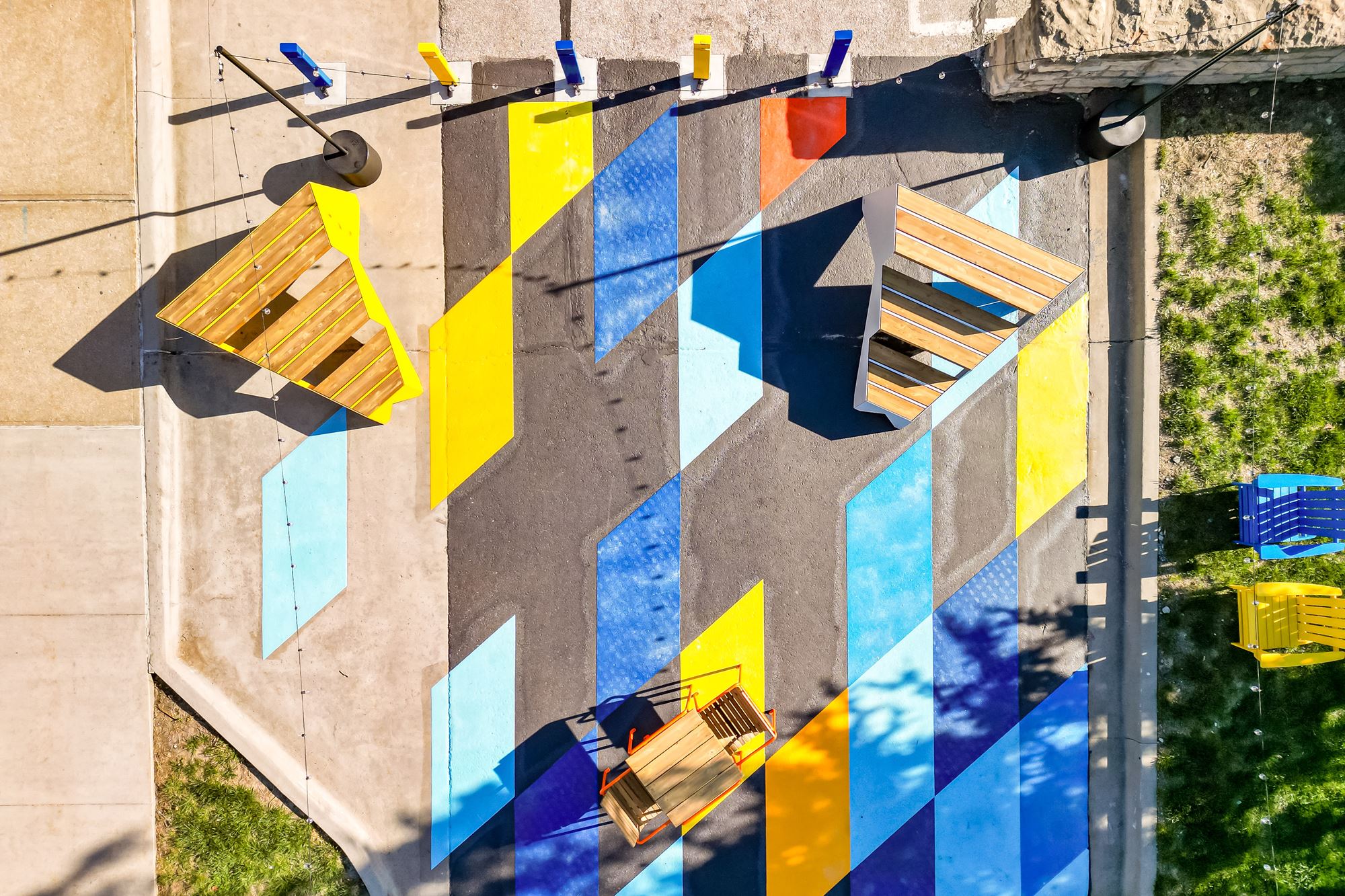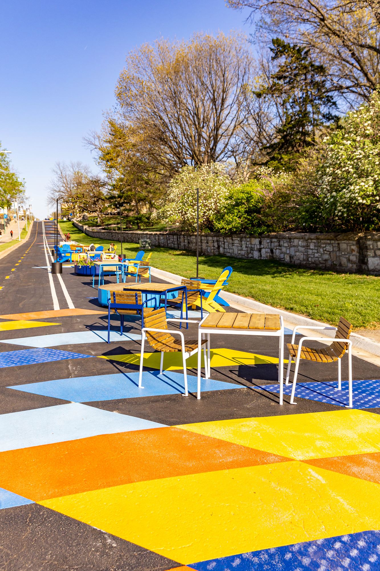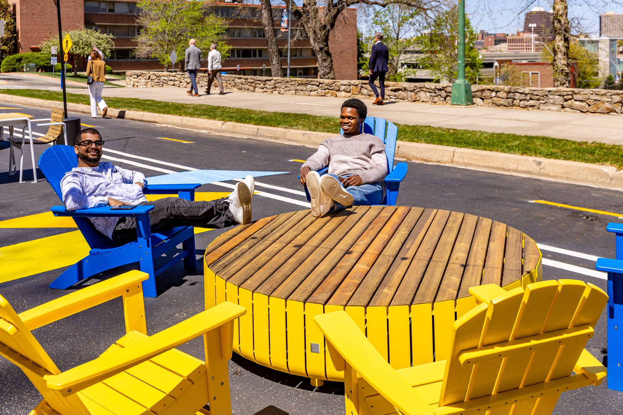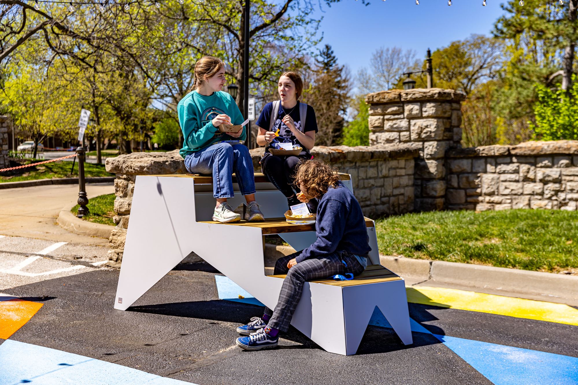 A major factor in the project’s success was Linda Hall Library vacating half of 51st Street, allowing the University to utilize the roadway and adjacent greenspace fully. The design limits vehicular access to UMKC maintenance crews, deliveries, and emergency services. Inspired by tactical urbanism, the improvements emphasize flexibility and low-maintenance features such as paint striping, bollards, a dedicated bike lane, yard games, string lighting, and site furnishings.