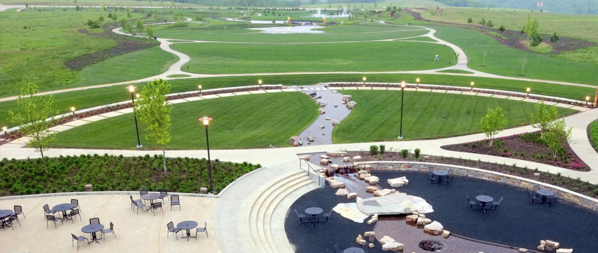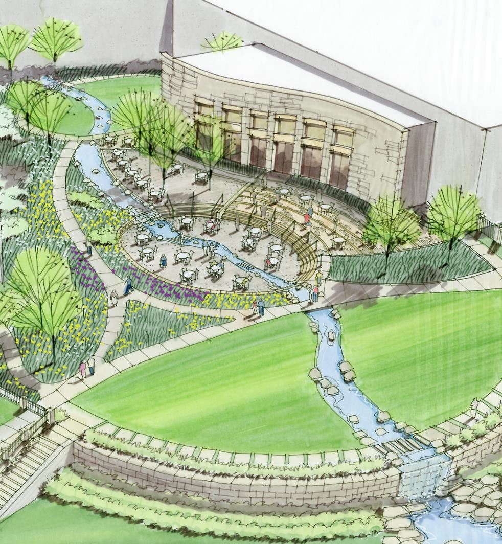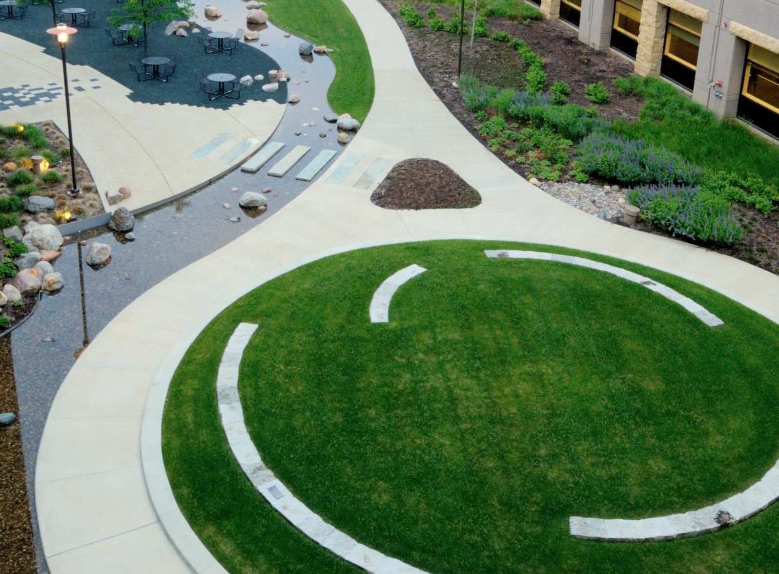Employee-based amenities were a vital component of the design vision - leading to the creation of features such as a dining terrace, an outdoor amphitheater, a lawn space for recreation and tented activities, and a series of attractive garden spaces.