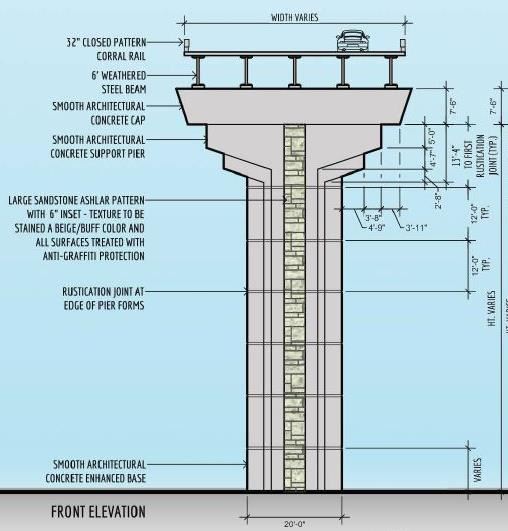 Enhancements include art deco profiles for all bridge piers, aesthetic treatments for bridge railings and barriers, multi-modal bridge replacement, retaining wall enhancements, bridge lighting, open space and connectivity improvements.