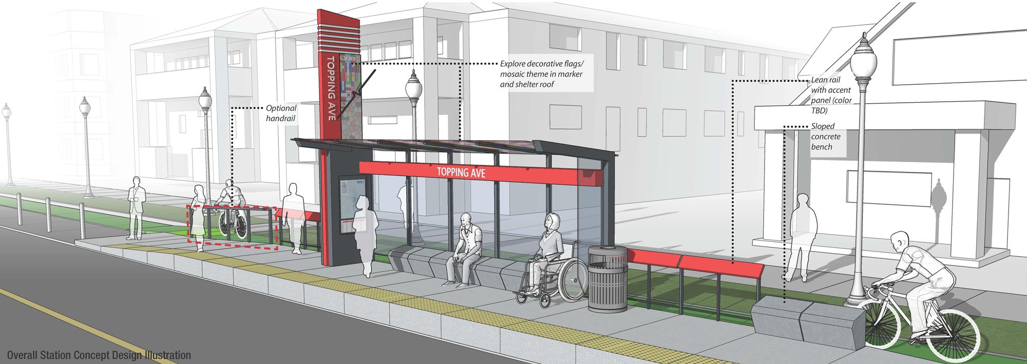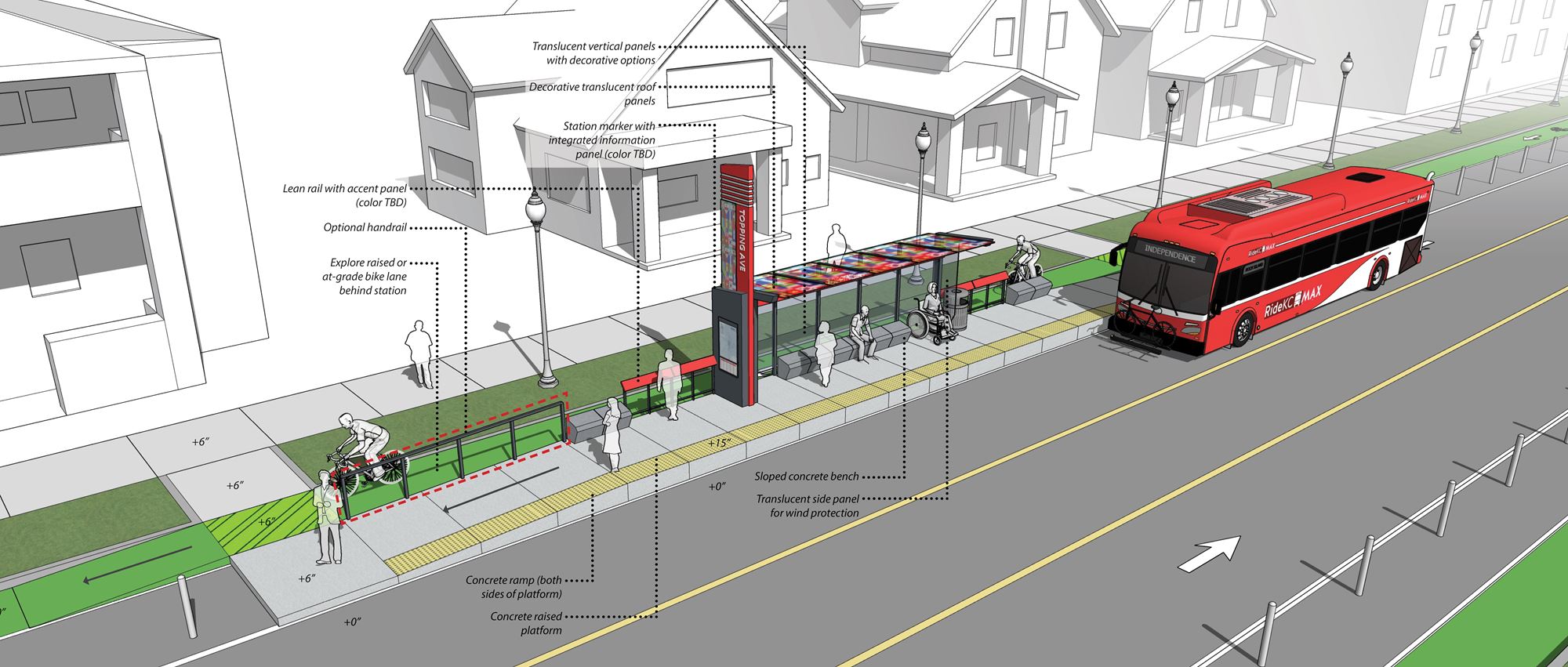 Building on the regional transit plan’s (Smart Moves 3.0) recommended mobility hub locations, our team also recommend BRT station locations to corresponde with potential transit-supportive redevelopment opportunities throughout the corridor. Confuence crafted station design prototypes to integrate new raised level-boarding platforms into the existing ROW while planning ahead for future bicycle lanes.