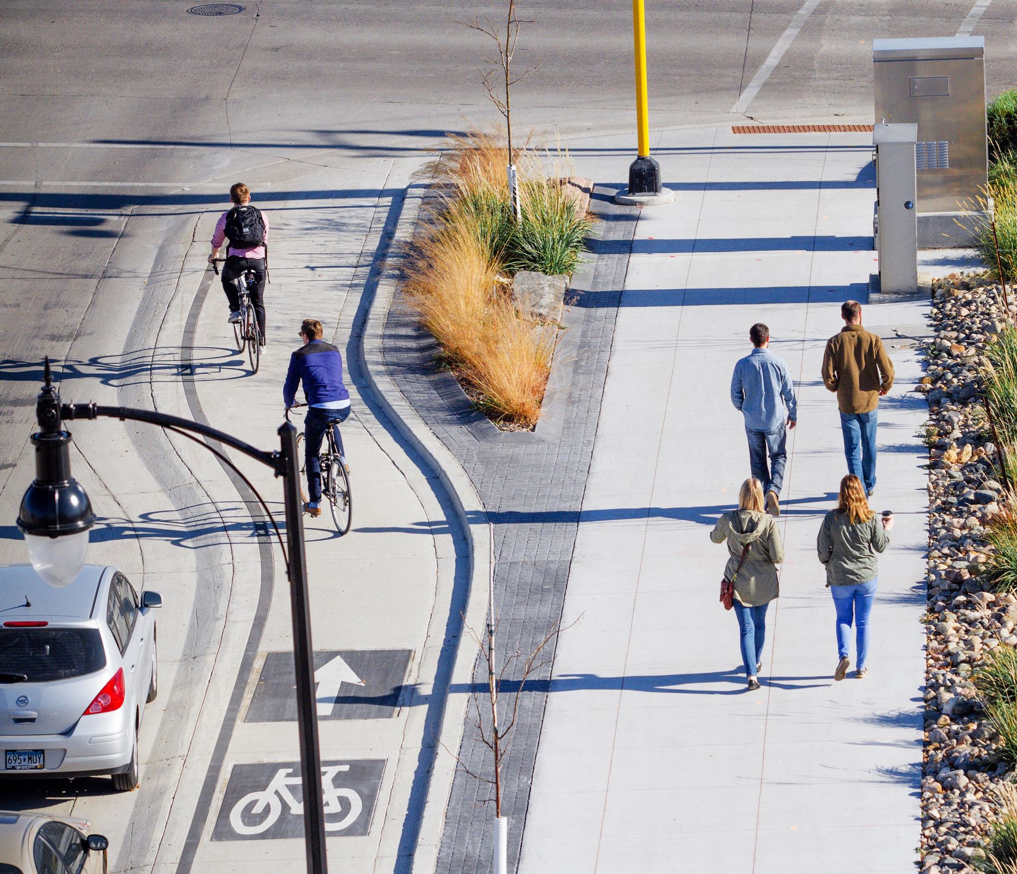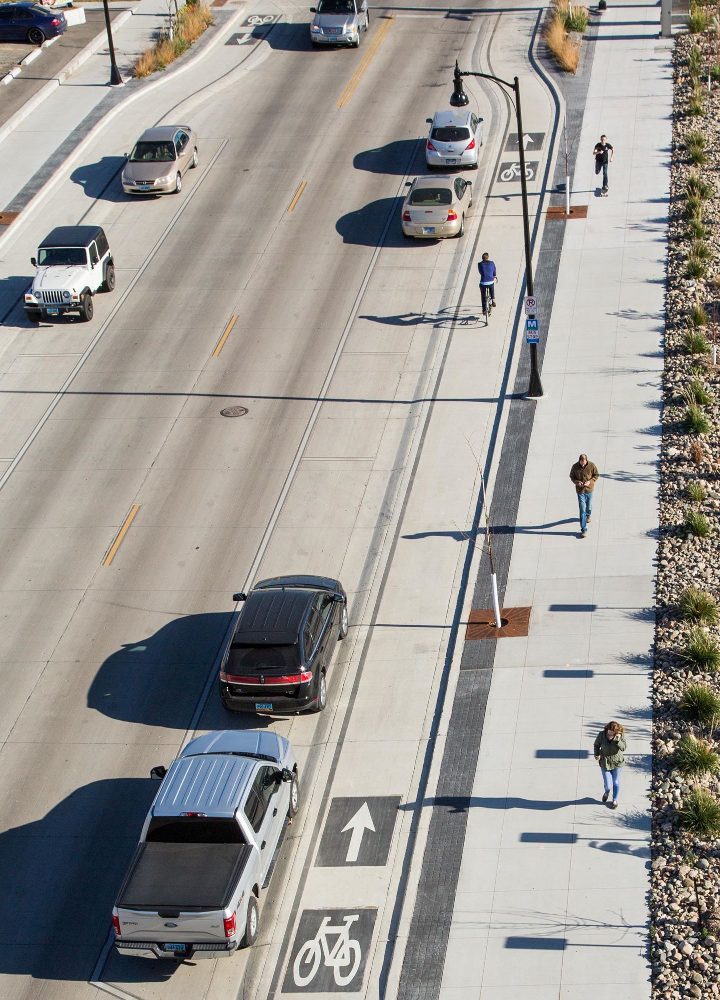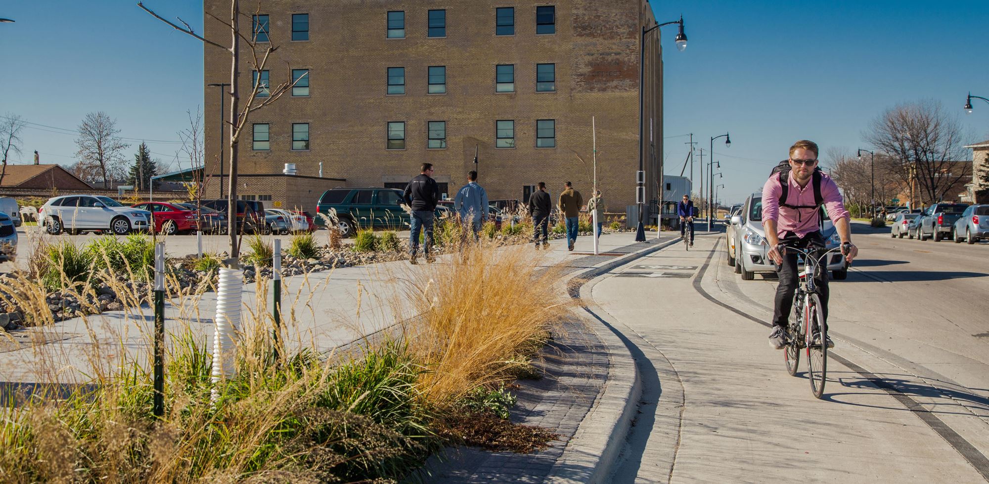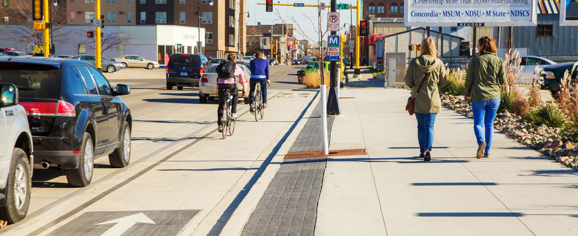 As Fargo's first complete street conversion project, these improvements also included the area's first elevated protected bike lanes.