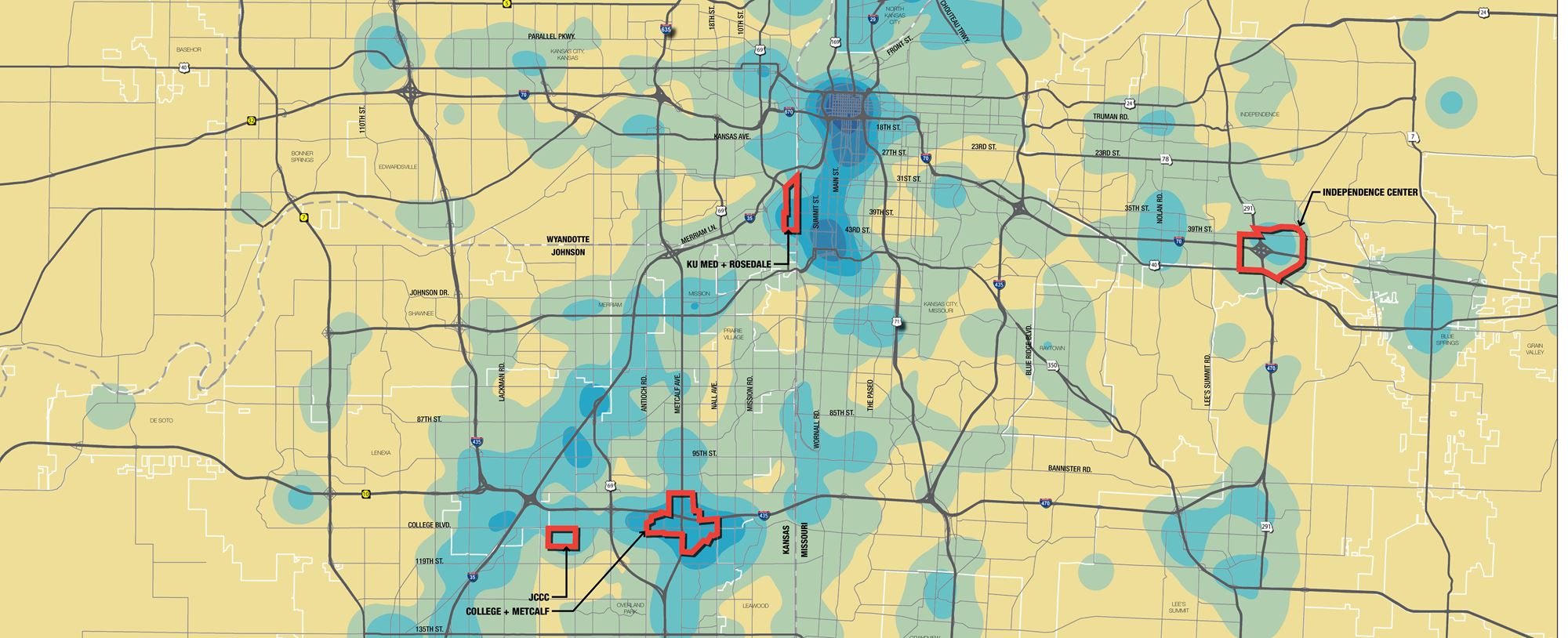 Confluence collaborated with a multi-disciplinary team and the KCATA, MARC, and regional municipalities to create a new regional long-range transit plan. According to a 2011 Brookings Institution report, only 18% of jobs in the region were accessible by transit in under 90 minutes. Our team was charged with doubling this access through a variety of recommended strategies, service enhancements, and the utilization of new and emerging rideshare technologies.