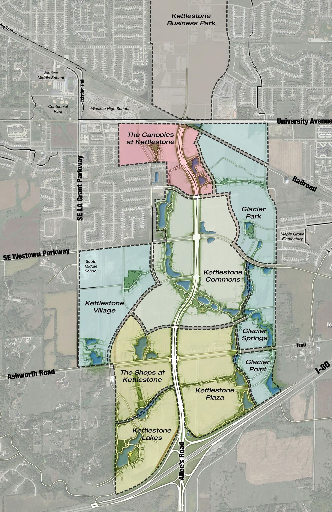 Strategically located on the western edge of the Des Moines metropolitan area, Grand Prairie Parkway has long been an economic development priority for the City. Confluence led a multi-disciplinary effort to craft a comprehensive Master Plan that knits the area together through connected open spaces, streets and trail networks. Our team also created a new identity for this entire district - Kettlestone. Based on a detailed market study, our team crafted land use alternatives and illustrated how the corridor could be developed to its full potential while achieving the City's vision and goals.