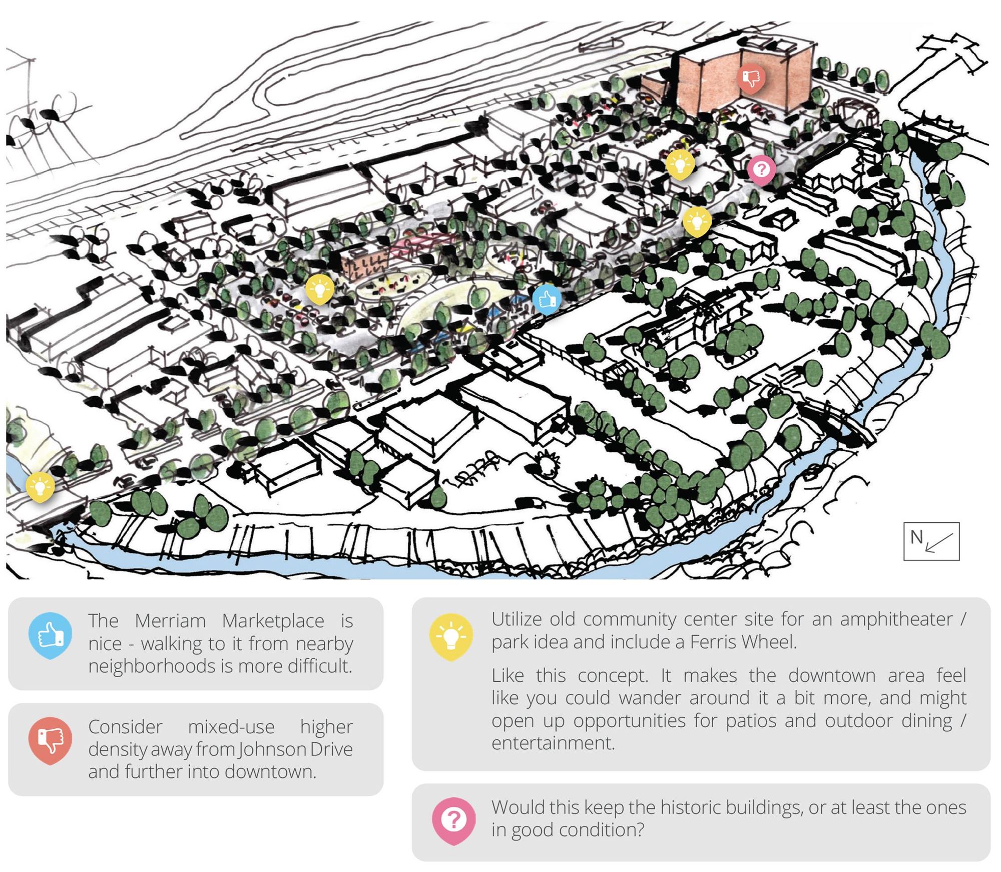 Three focus areas were included in the planning process, allowing our team to explore options with the community for redeveloping the existing Downtown area, the Merriam Town Center, and a former corporate headquarters site. Our robust online engagement provided insightful commentary and informed the recommendations outlined in the plan.