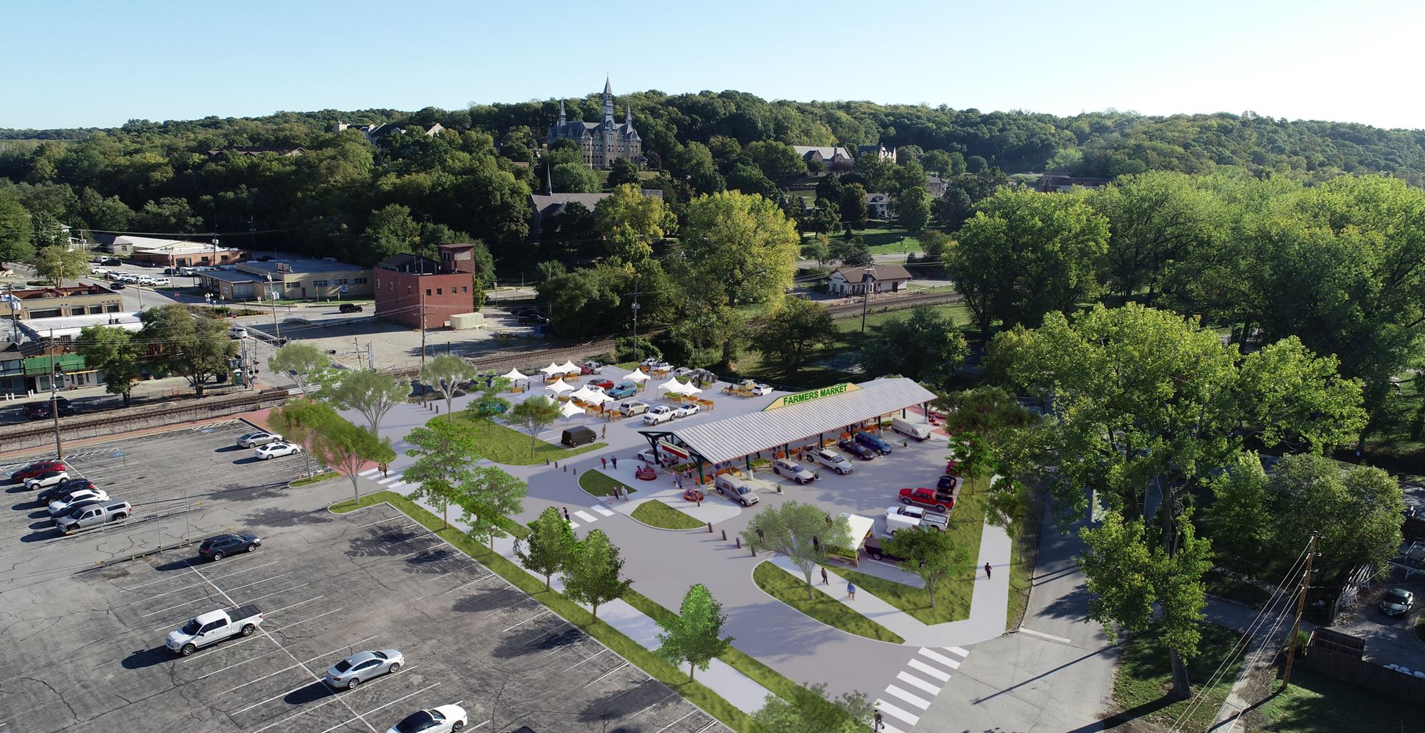 Using the input received, we developed a new Farmers Market concept including surrounding site improvements to better connect this facility into the urban fabric of Downtown Parkville. This included extensions of new sidewalks and streetscape, reconfiguration of the surrounding parking areas, and landscaped islands to protect the new structure.