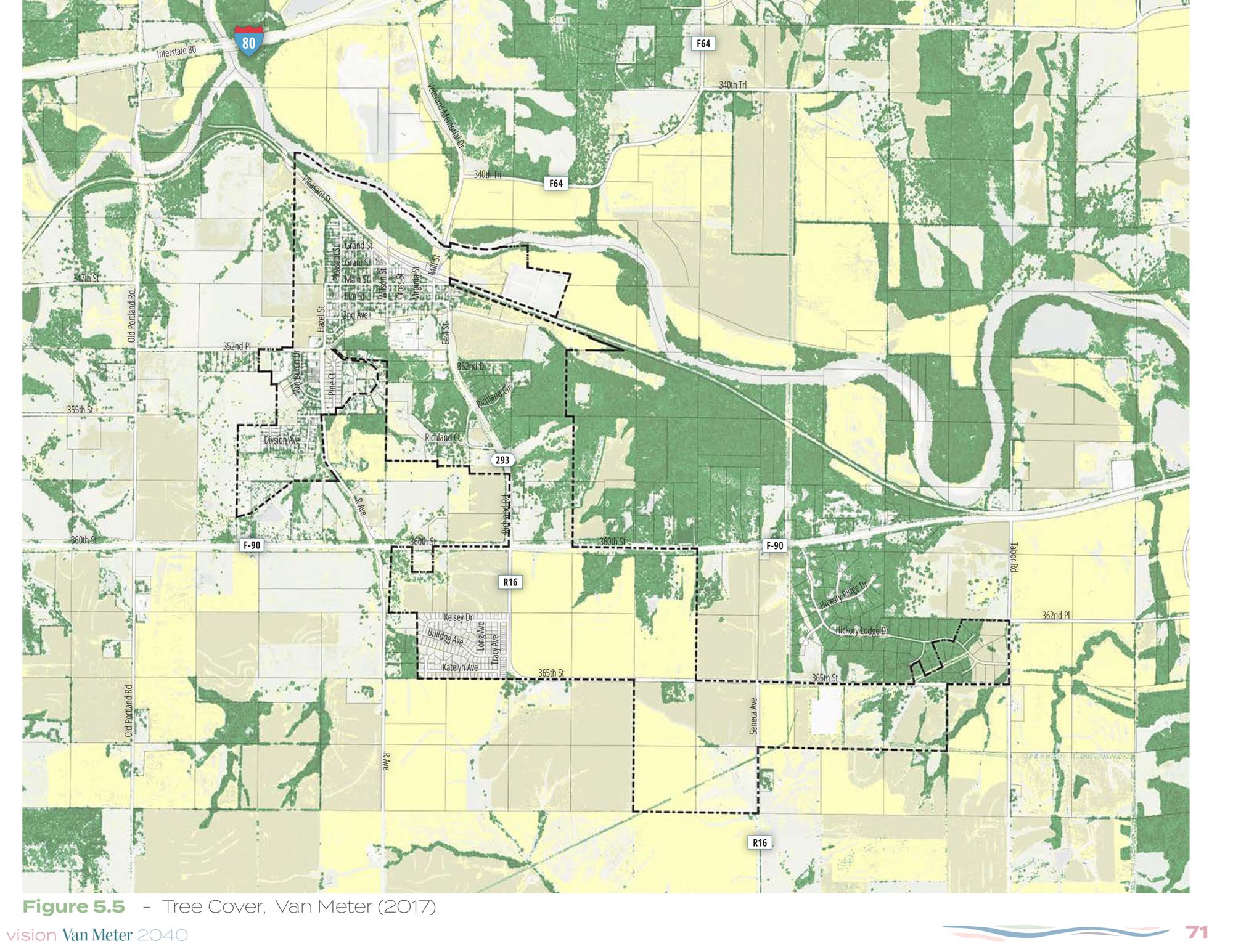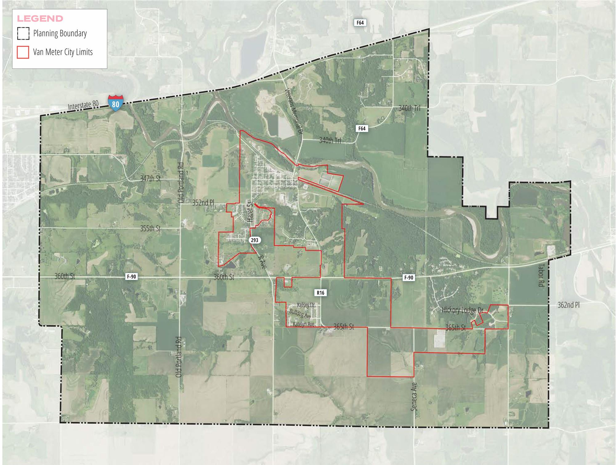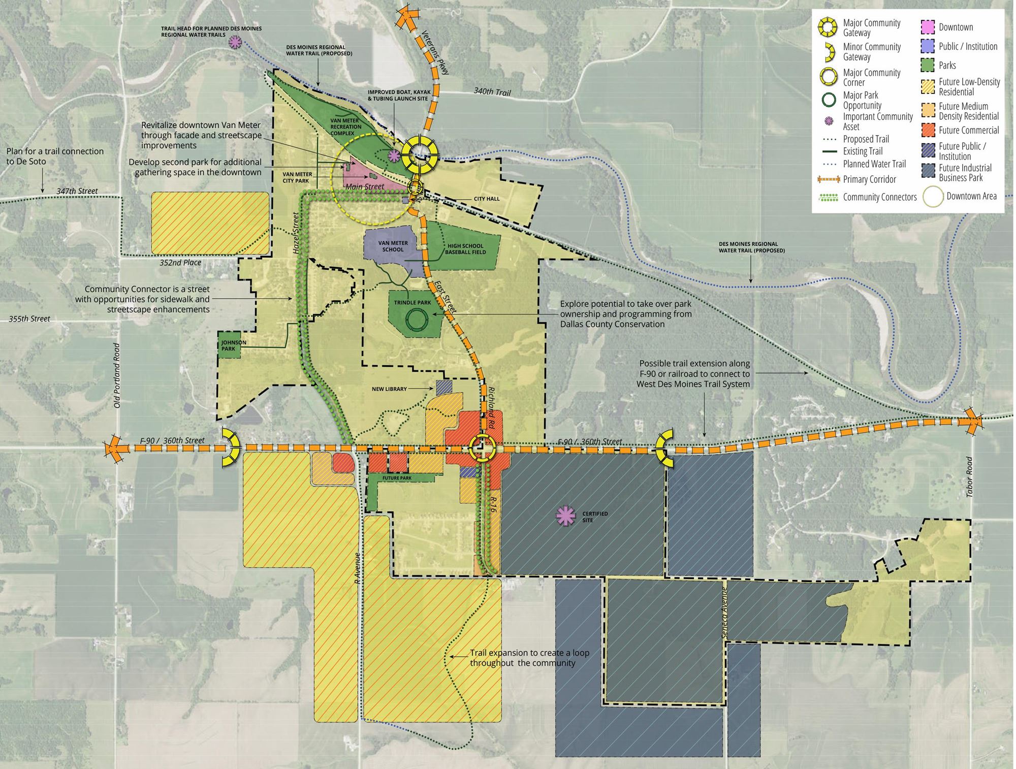 Van Meter is a small but growing community on the western edge of the Des Moines metro area. Nestled in the rolling hills of Dallas County along the banks of the Raccoon River, Van Meter has a long history as a rail community that was shielded from much growth in the past despite its proximity to Des Moines. However, the westward expansion of the metro combined with the natural beauty and strong school district have increased growth pressures on Van Meter.