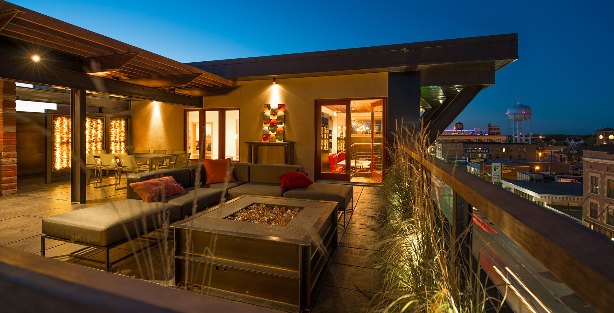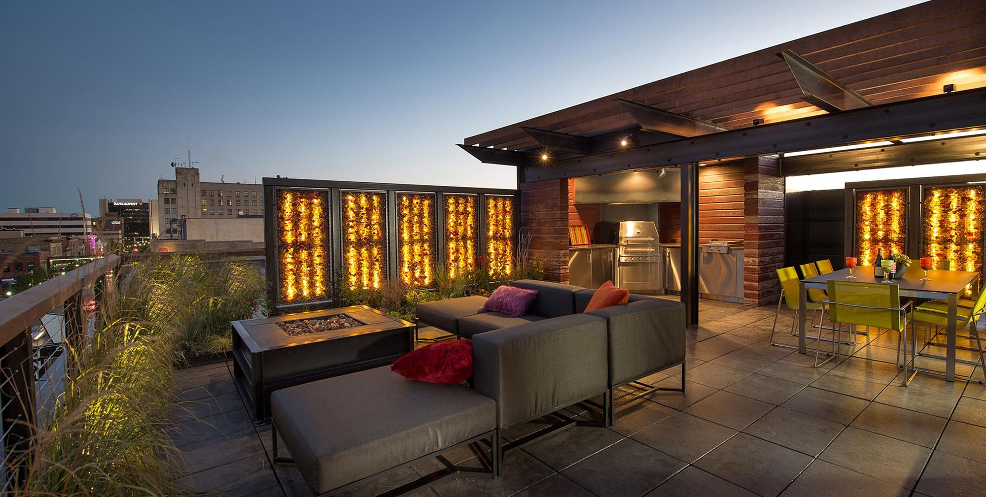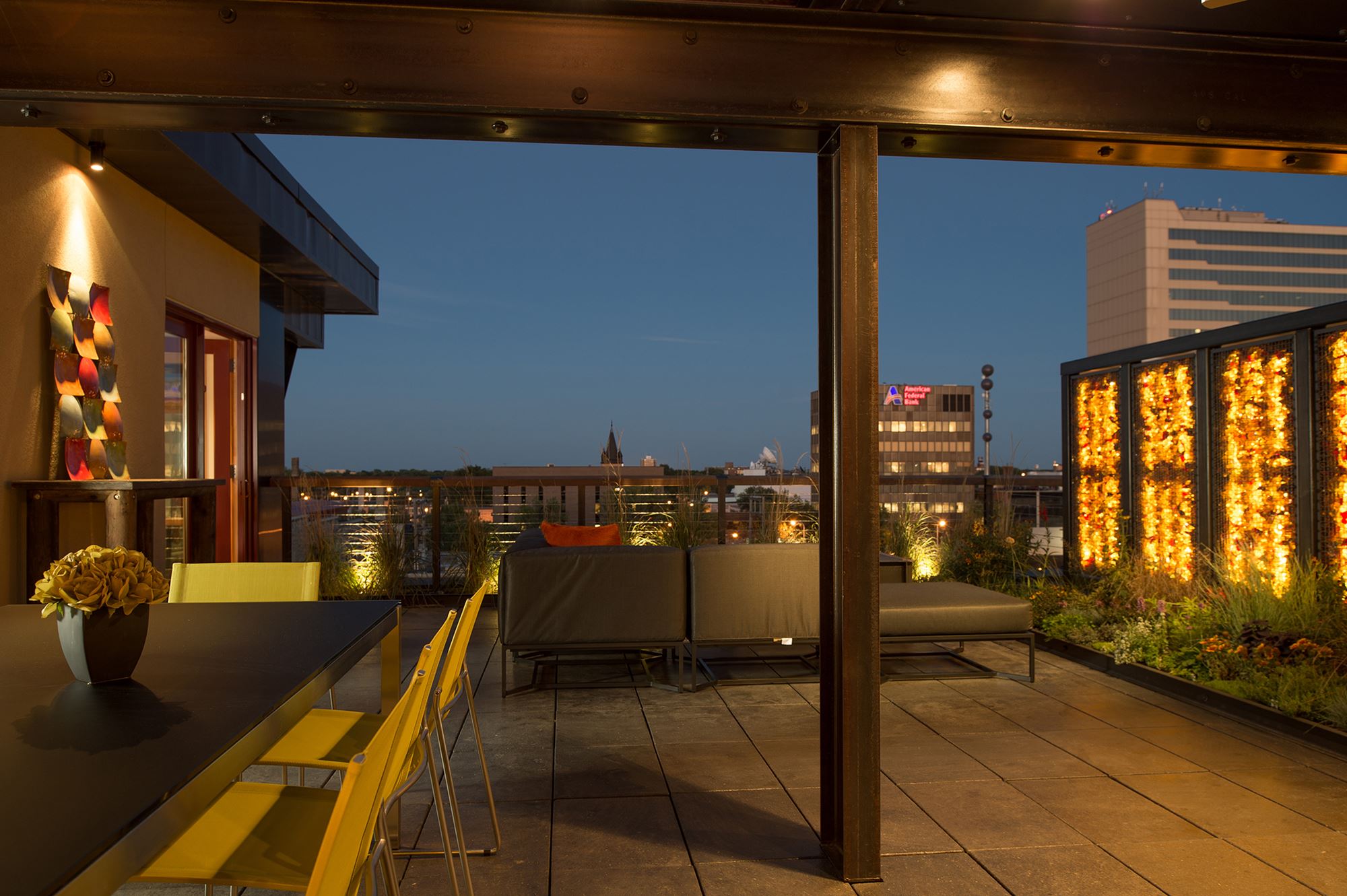 This outdoor room serves a private residence in the 300 Broadway Building - a creative component of an infill mixed-use development in Downtown Fargo.