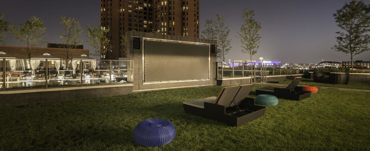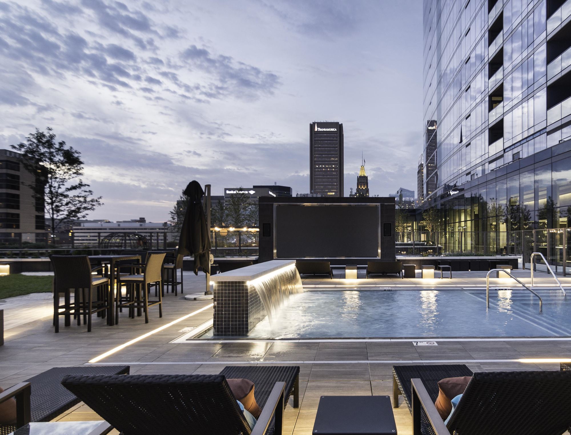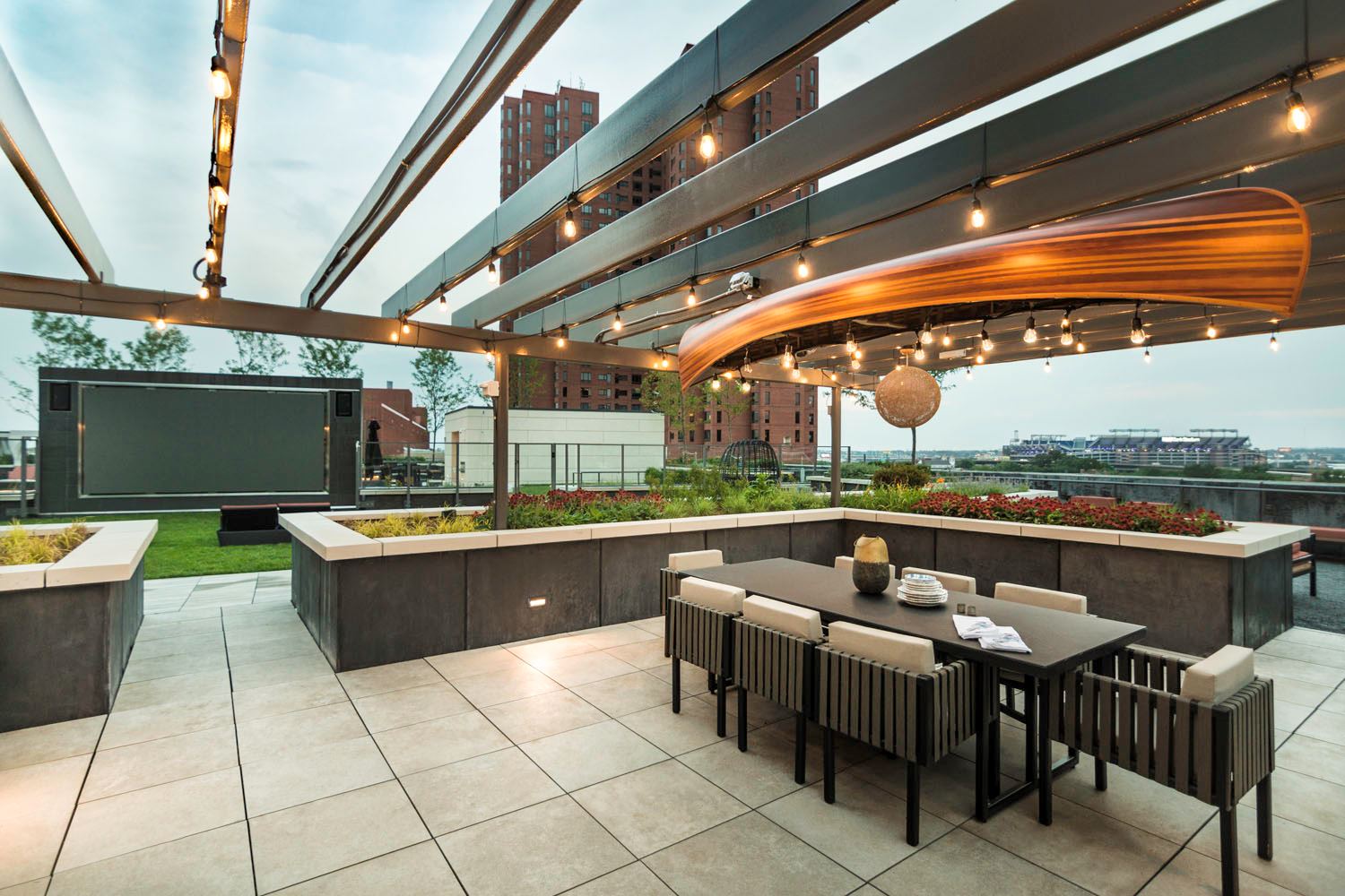 The building is not only a striking addition to the Baltimore skyline, but it also offers a sensitively designed pedestrian streetscape comprised of generous sidewalks, planters with large shade trees, and an expansive retail terrace allowing businesses to spill outdoors into the public realm. But the signature attraction is a nearly half-acre 7th-floor amenity deck furnished with all of the contemporary amenities high-end tenants expect: pool, resort-style sun shelf, spa, cabanas, herb and community garden, two-sided outdoor video monitor, “summer kitchen” with lounge, dining, and kitchen components, fire pit lounges, shade structures, a dog park and more. This project is helping to define an expanded upper end of the urban residential market.