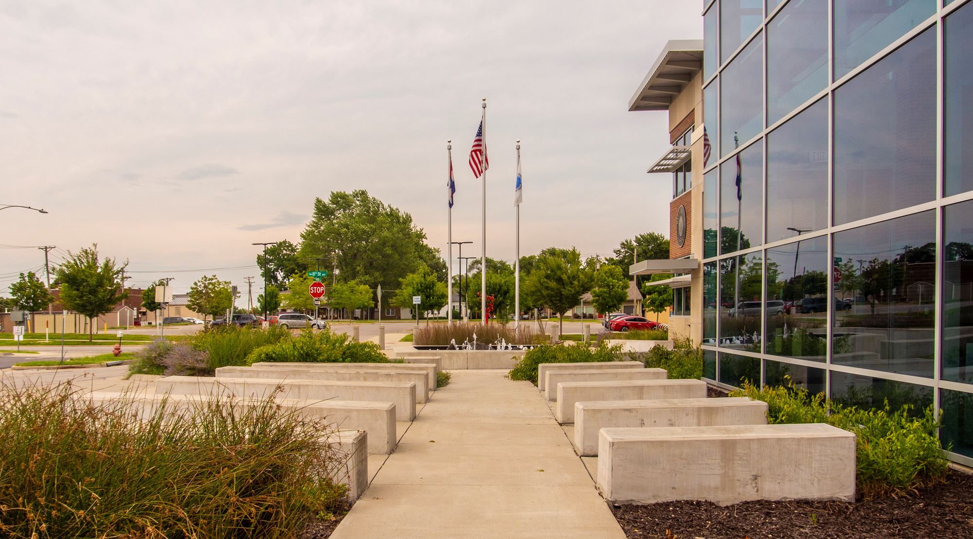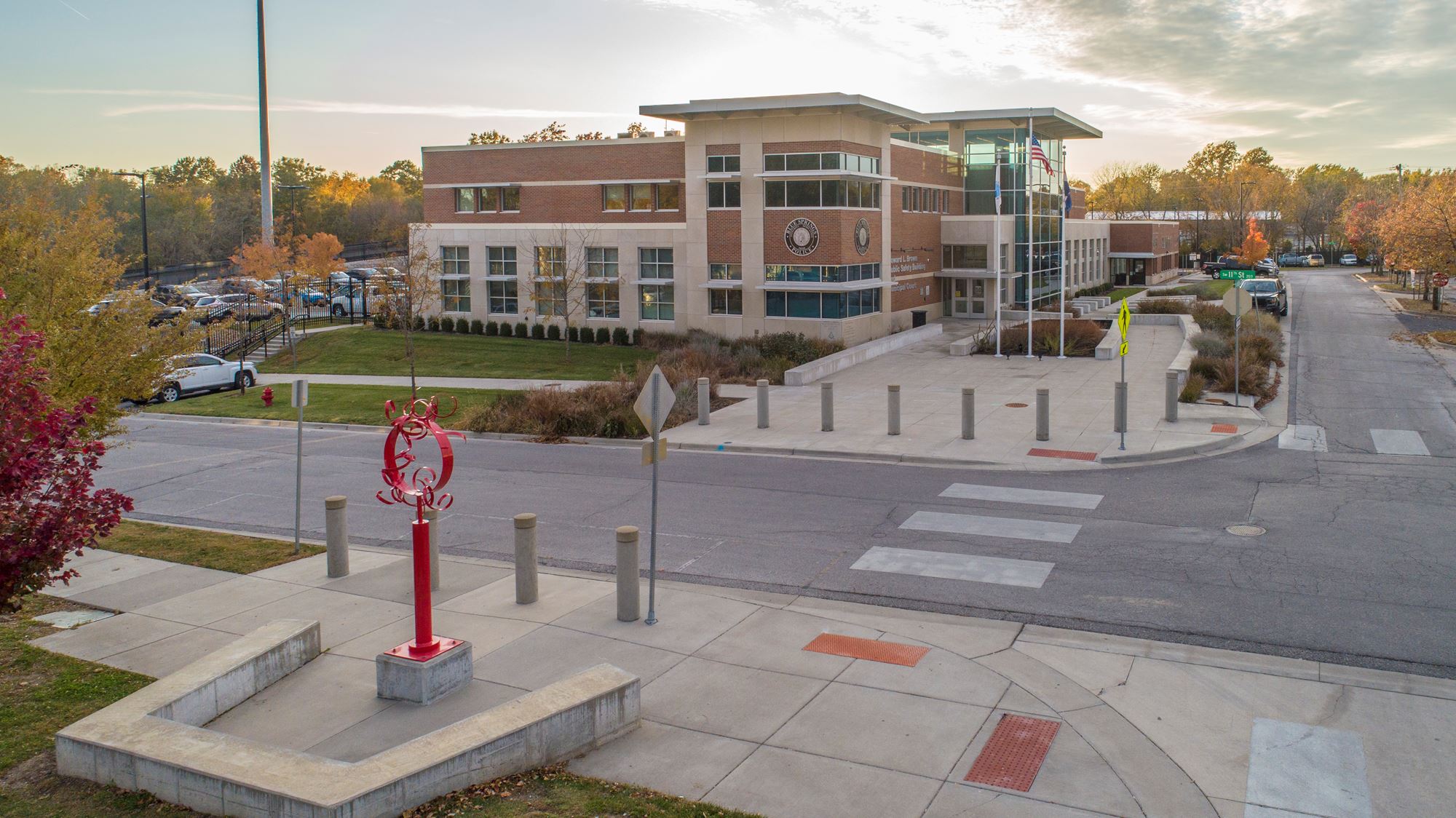 Confluence helped to shape the overall building complex to fit within the existing downtown context and the City's form-based code requirements. A new entry plaza with seating and sculpture connects the complex to a new shared parking area. This area was also designed to provide ample event space for the annual Fallen Officer Memorial Service and other events in the downtown area.