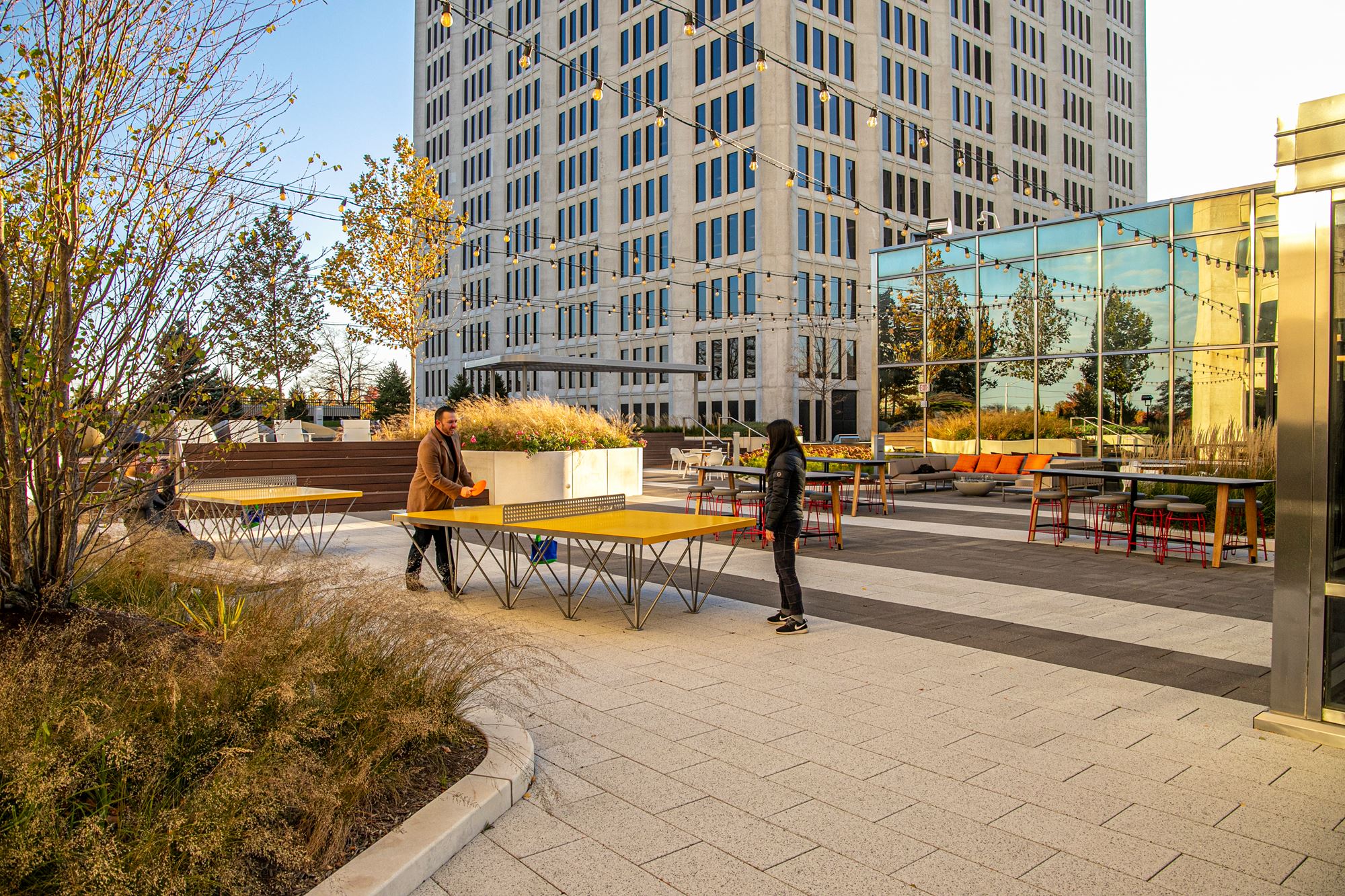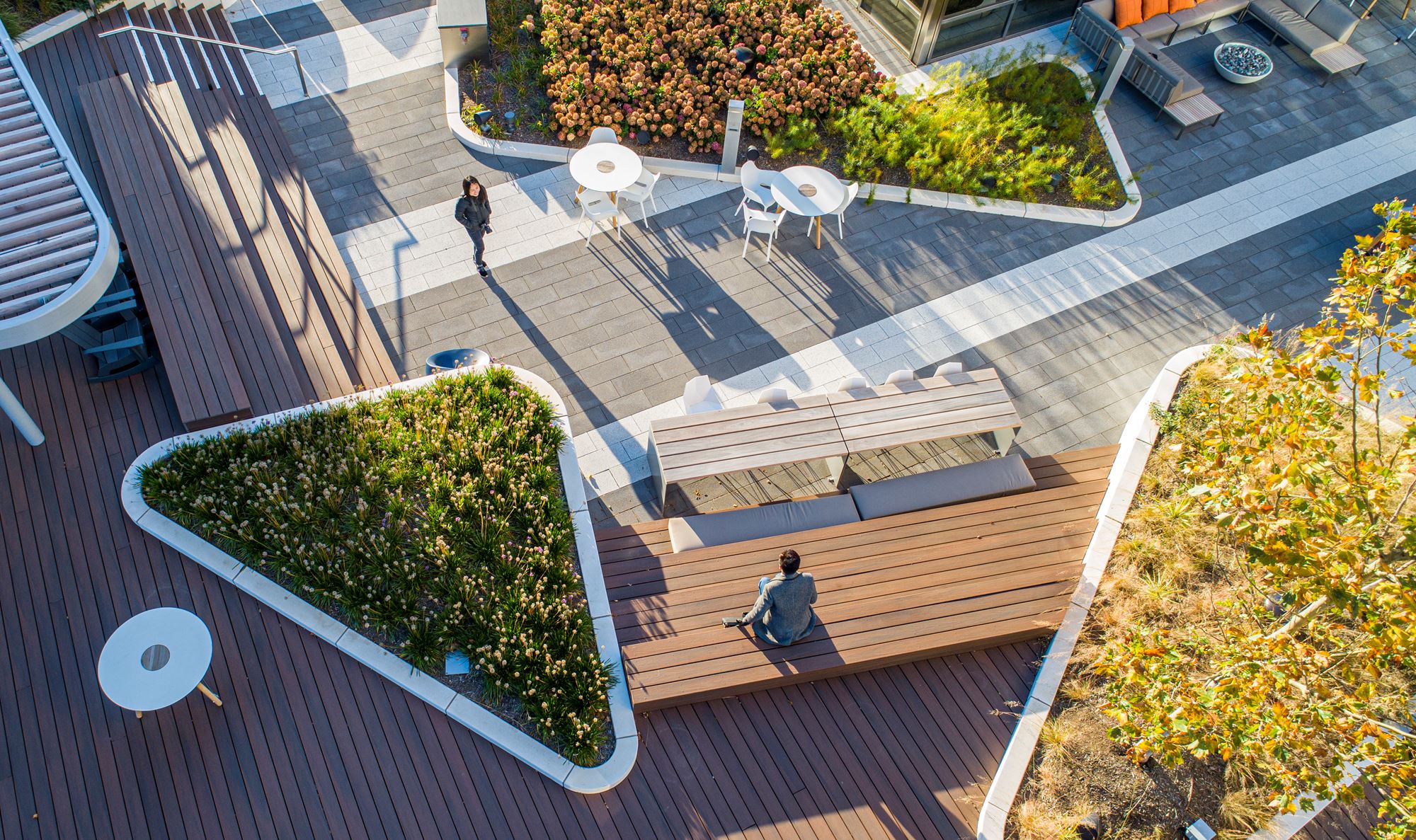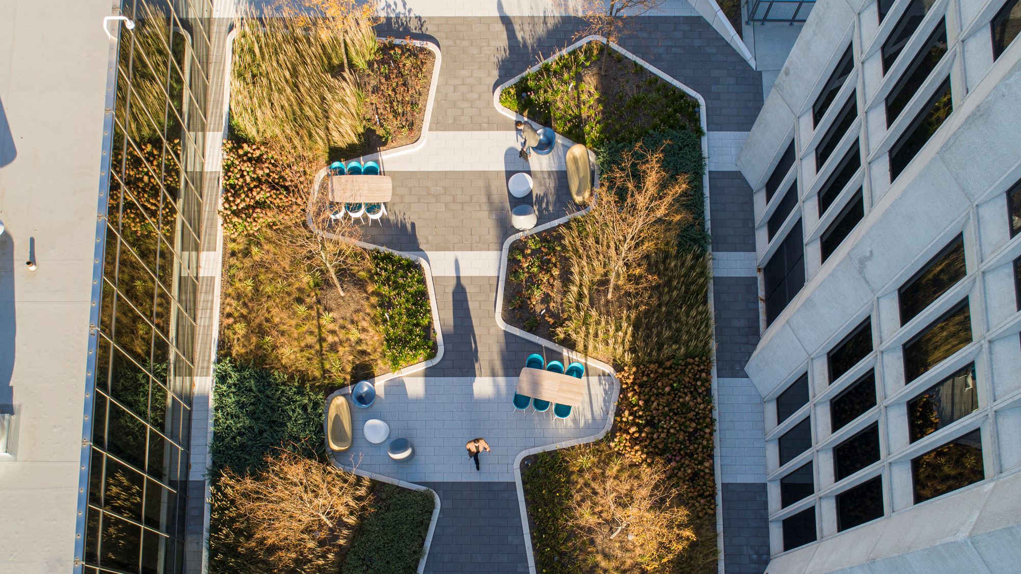 Given its dated interior and bleak existing concrete plaza space, the new owners engaged our team to reimagine the pedestrian plaza space and to transform the roofscape and site entry to create a greater sense of identity. The design program involved replacing gray with green, crafting an active oasis with a variety of spatial and social environments.
