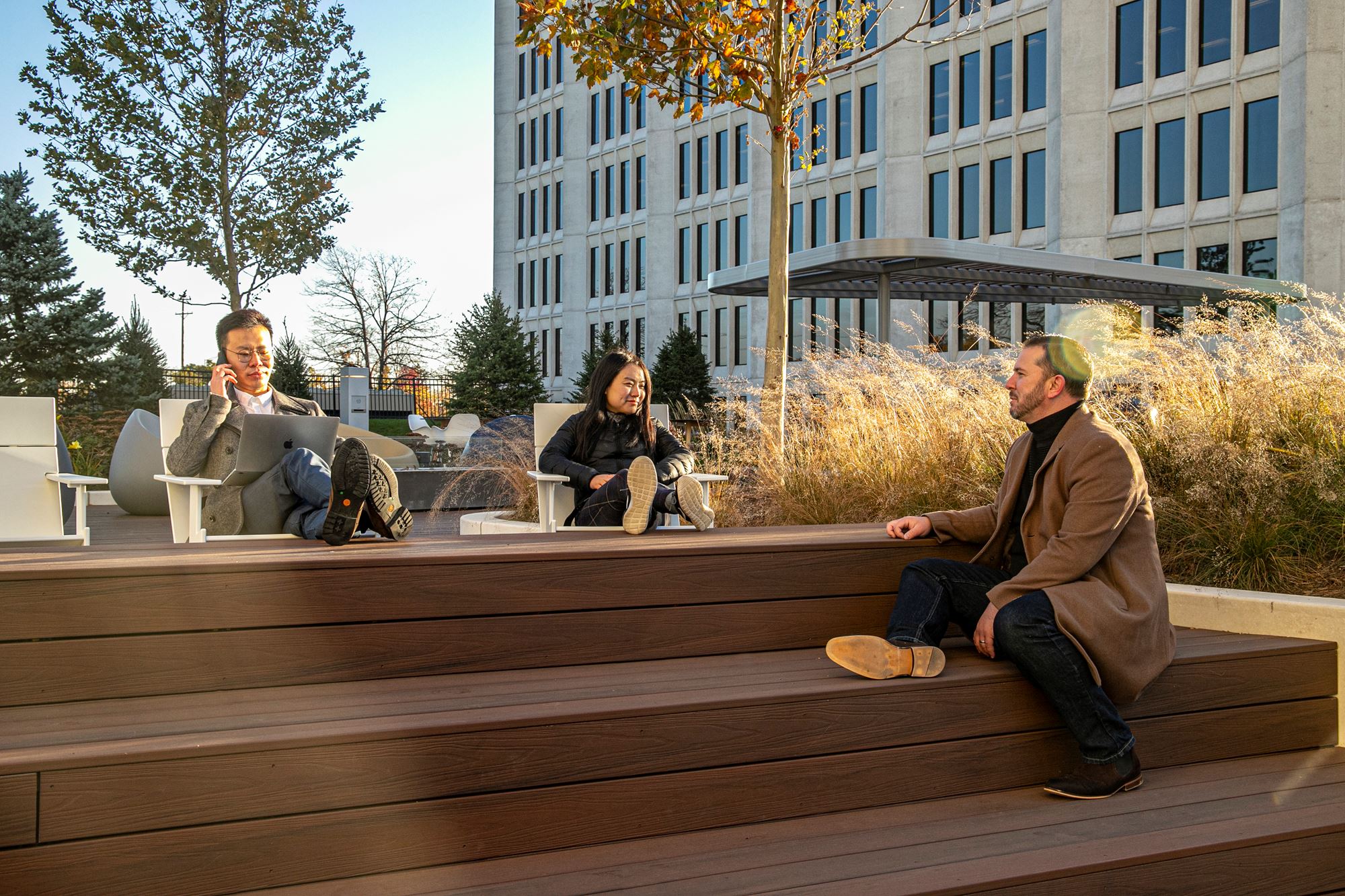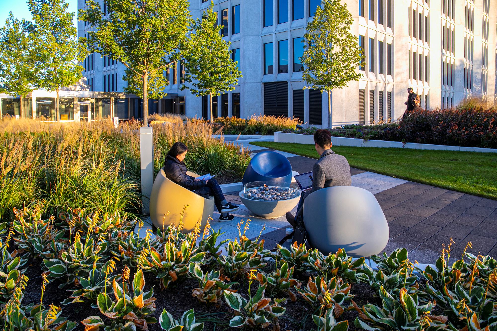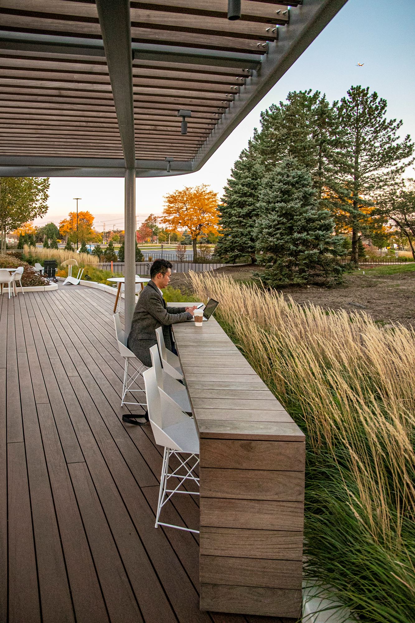 Given its dated interior and bleak existing concrete plaza space, the new owners engaged our team to reimagine the pedestrian plaza space and to transform the roofscape and site entry to create a greater sense of identity. The design program involved replacing gray with green, crafting an active oasis with a variety of spatial and social environments.
