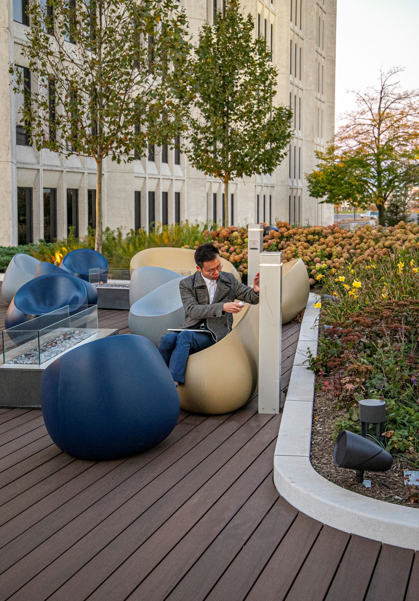 The informal language of arcs and tangents are weaved together by a striated carpet of paving. At the center of the space is a series of garden rooms that create a sense of decompression, leading the user to two plaza spaces. The west plaza is active and adjacent to the complex’s cafe space - featuring an elevated “porch” overlooking game tables, a media wall, a grill area, fire pits, outdoor work stations, an array of seating, and an overhead canopy of string lights. The east plaza is decidedly more passive, with a large multi-use lawn space dotted with chaise lounges and Adirondack chairs.
