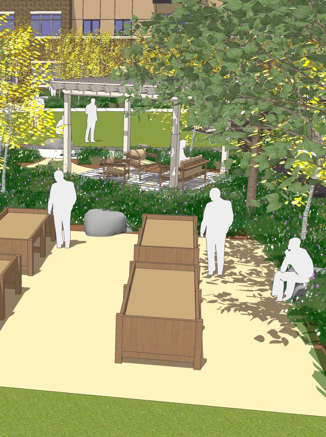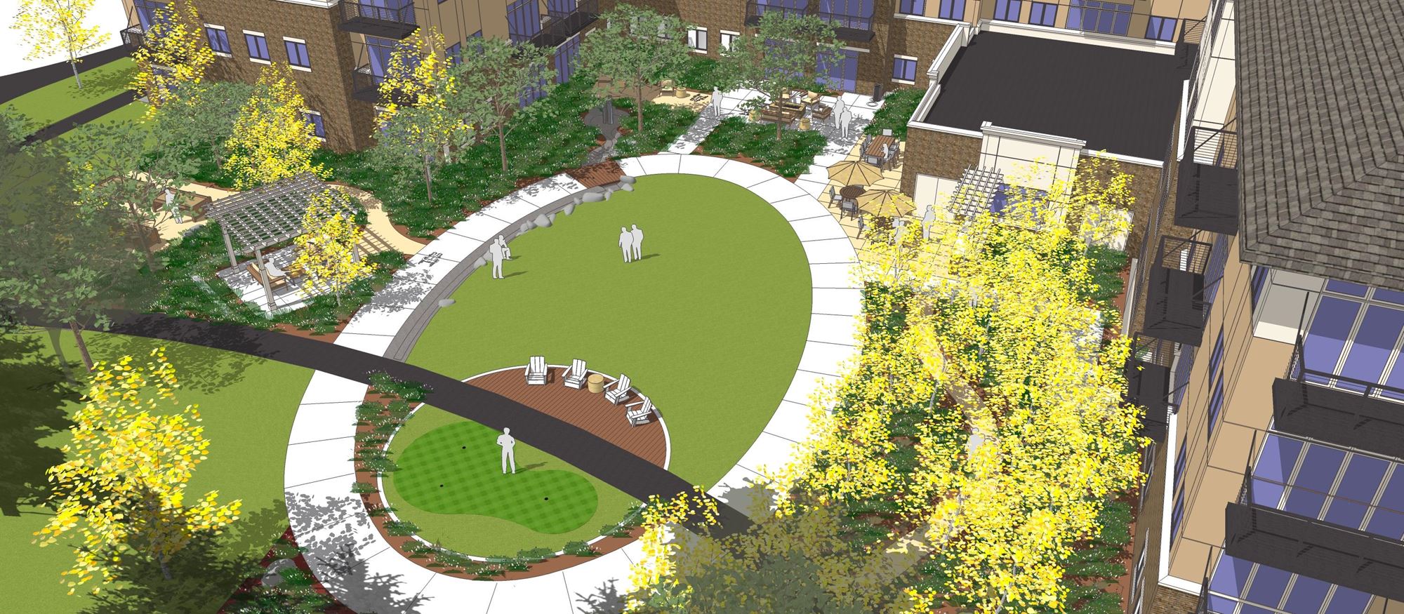 The project site was designed for senior users in consideration of safety, provision of cognitive and visual cues, and addressing residents of varying physical abilities. Smooth transitions allow for an experience that easily transitions between areas while providing focal points for orientation. The walking loop path allows for exercise and circulation around the site, while other amenities such as an outdoor lounge are placed near building accesses.