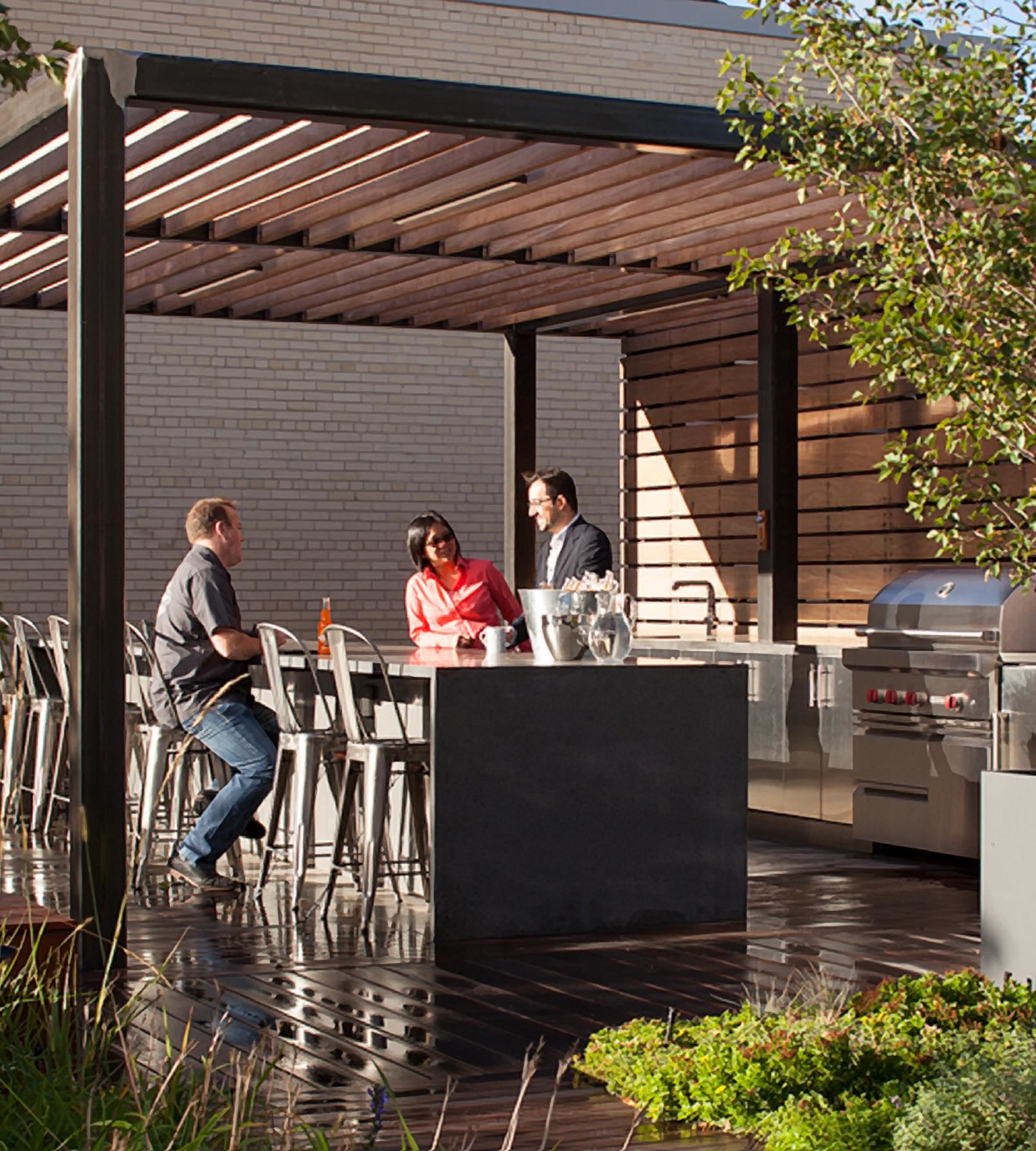 Our team crafted design details for construction in collaboration with the building architect and the roof's structural capabilities. The final design accommodates all of the Owner's desired uses and program elements, including providing a variety of spaces for formal and informal meetings, company gatherings, and areas for socialization and relaxation. Features include an outdoor kitchen with a communal harvest table, a fire pit with dynamic views of the Downtown skyline, and two shade structures that create the feeling of outdoor rooms.