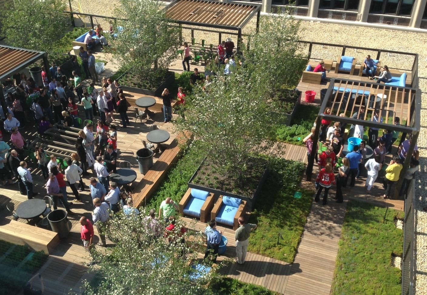 As part of Hillshire Brands' move from the suburbs to this renovated office building in Chicago's West Loop district, this rooftop deck space provides a welcoming outdoor amenity area for employees.