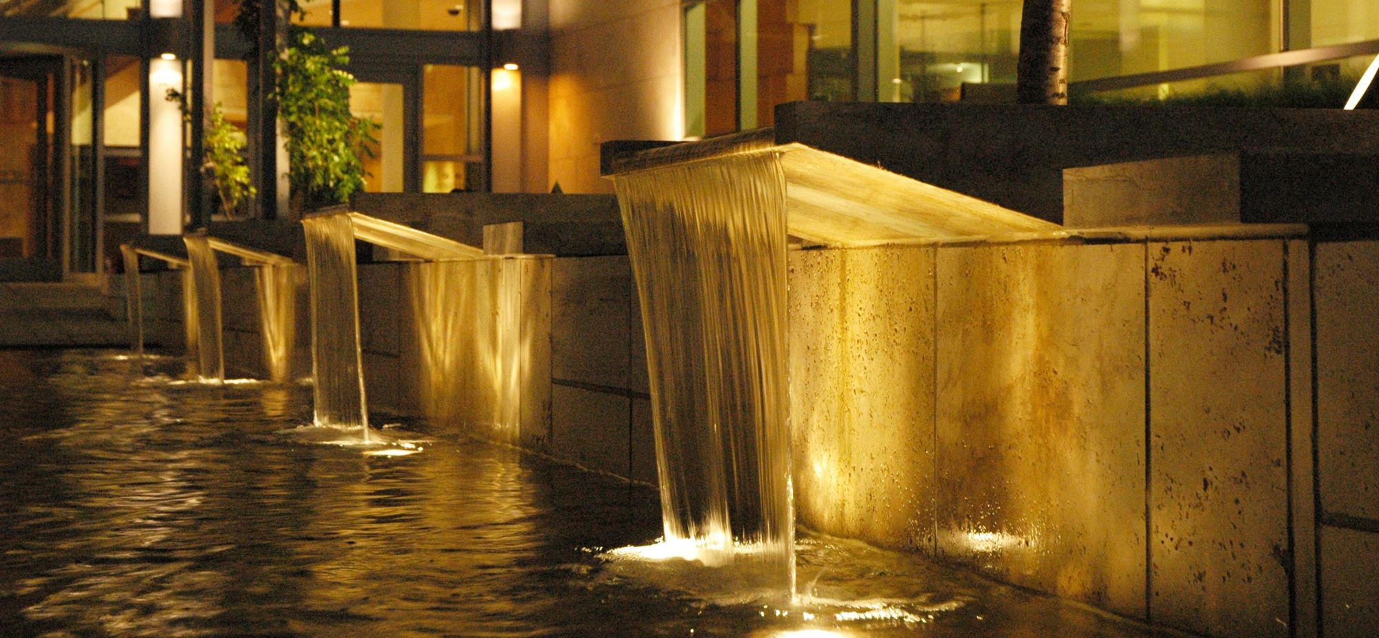 A large water feature functions as the focal piece of this space and is overlapped by a simple square arbor that has been adopted by the company as a “living logo.” Covered with vegetation, this arbor feature provides visual contrast with the muted natural tones of the paving - becoming a highly visible green square when viewed from the offices above.