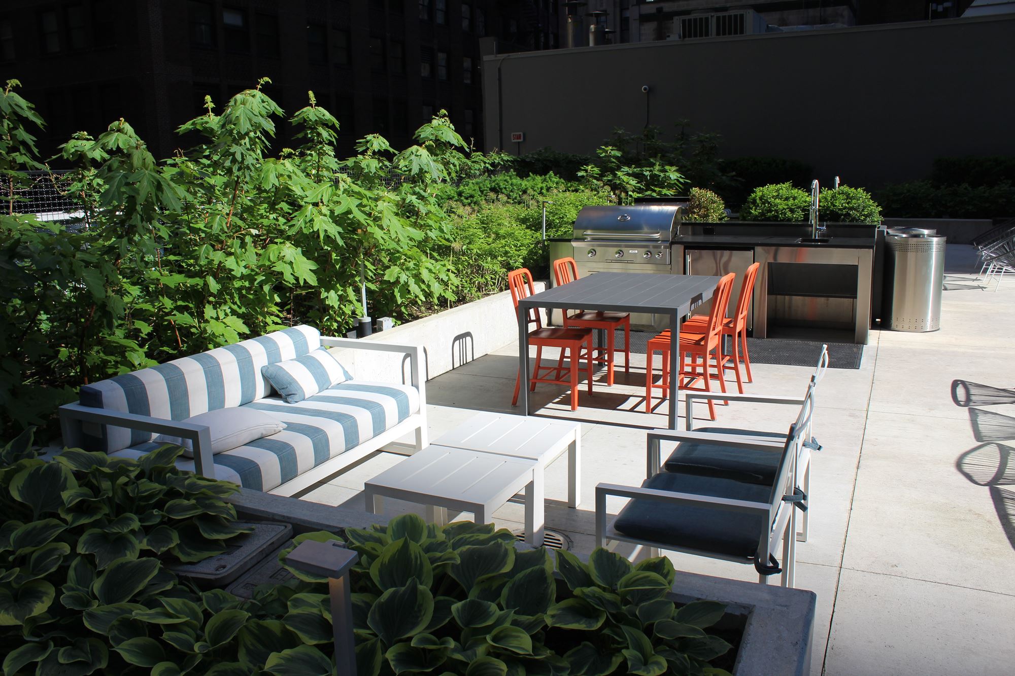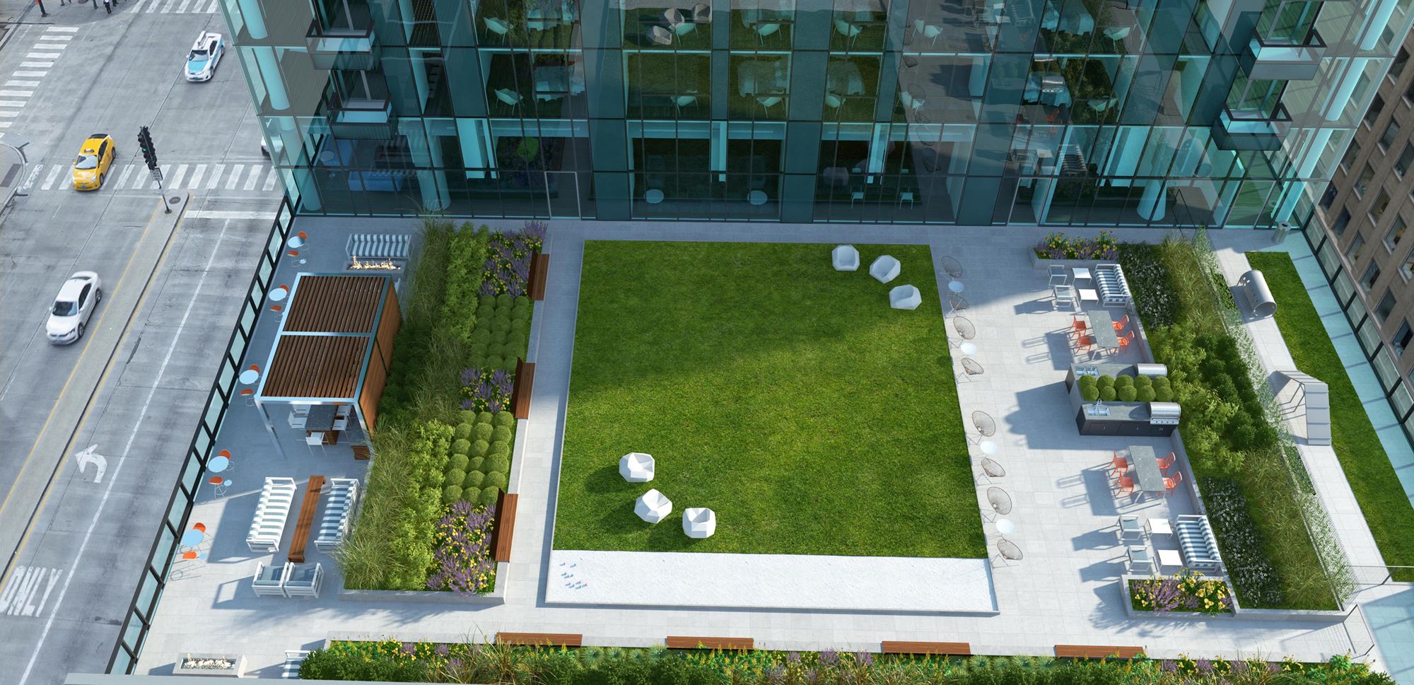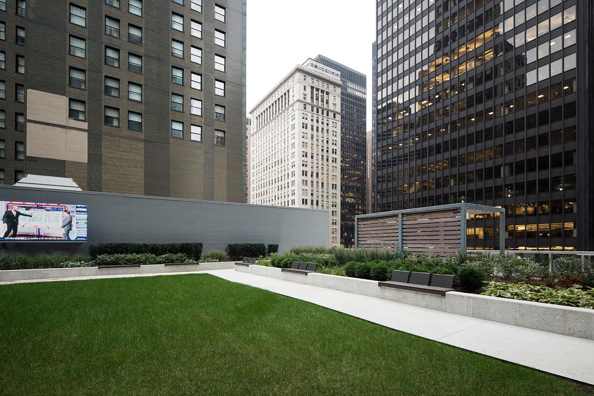 Elements of the amenity deck include the “Michigan Avenue Terrace" - a paved area with a mixture of movable and built-in furniture overlooking the street. An architectural trellis provides structure and shade, while a central green space is raised slightly above the paving to figuratively elevate the lawn panel. An exterior kitchen has integrated gas grills and sinks, dining tables and chairs, and lounge furniture. A bocce court is provided adjacent to the lawn panel, with a fire pit lounge and a linear fire element surrounded by lounge seating areas. A dog run is also provided with interactive play elements for dogs.