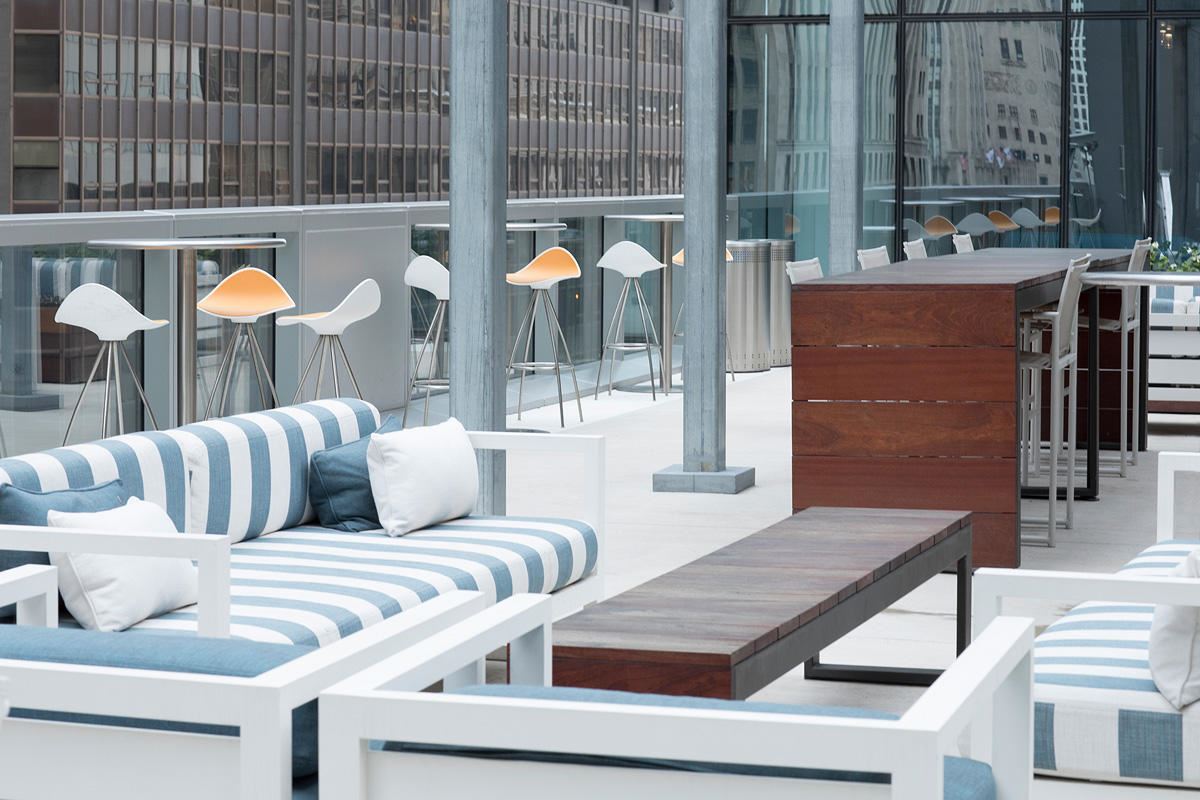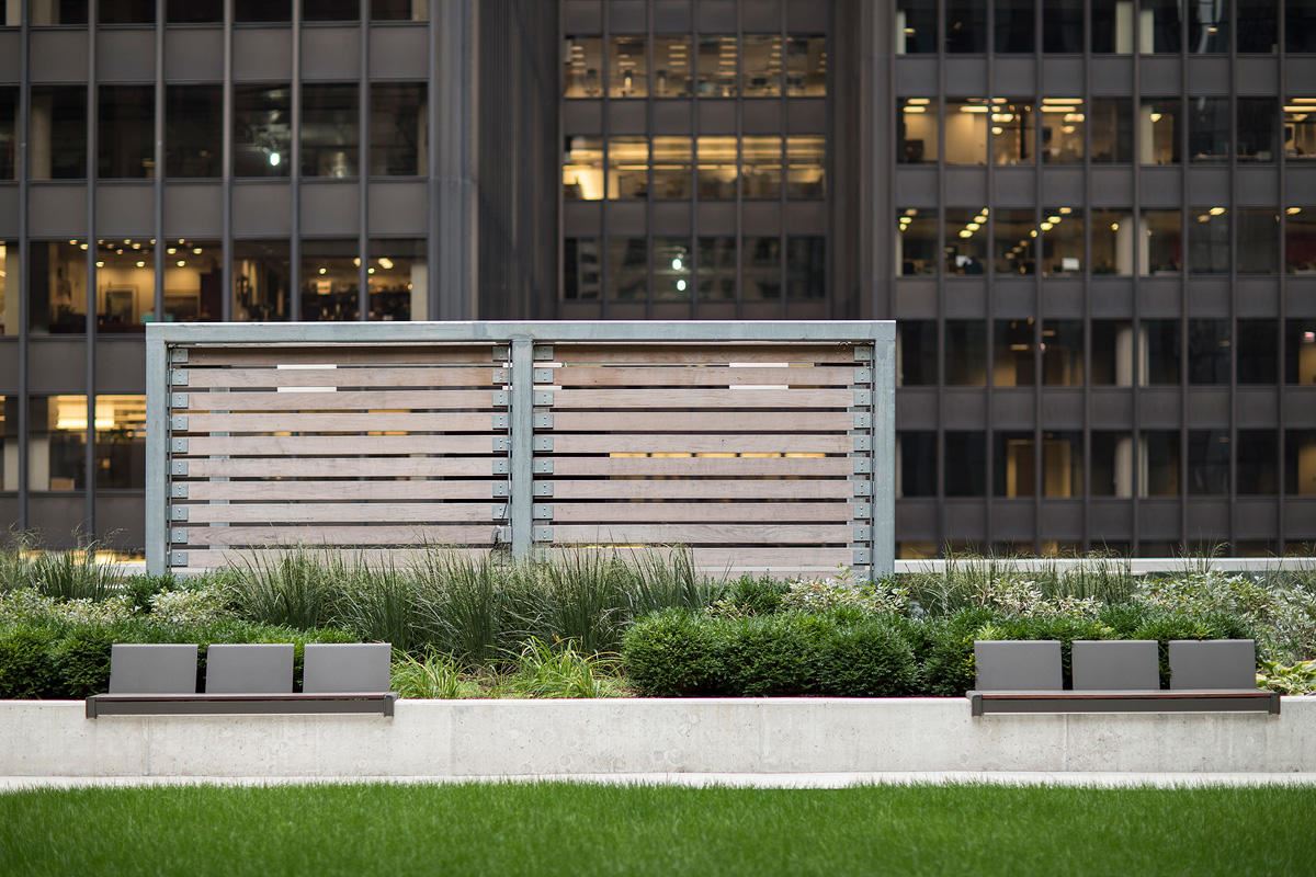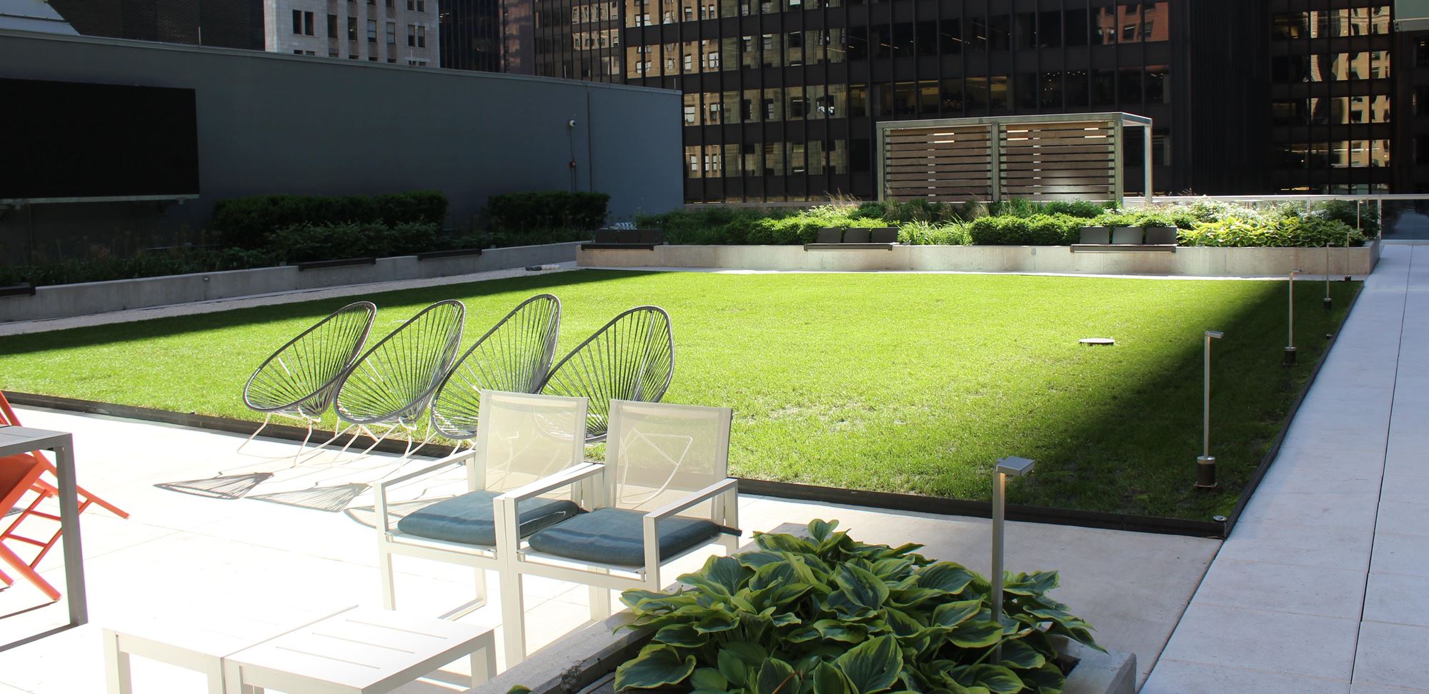 Elements of the amenity deck include the “Michigan Avenue Terrace" - a paved area with a mixture of movable and built-in furniture overlooking the street. An architectural trellis provides structure and shade, while a central green space is raised slightly above the paving to figuratively elevate the lawn panel. An exterior kitchen has integrated gas grills and sinks, dining tables and chairs, and lounge furniture. A bocce court is provided adjacent to the lawn panel, with a fire pit lounge and a linear fire element surrounded by lounge seating areas. A dog run is also provided with interactive play elements for dogs.