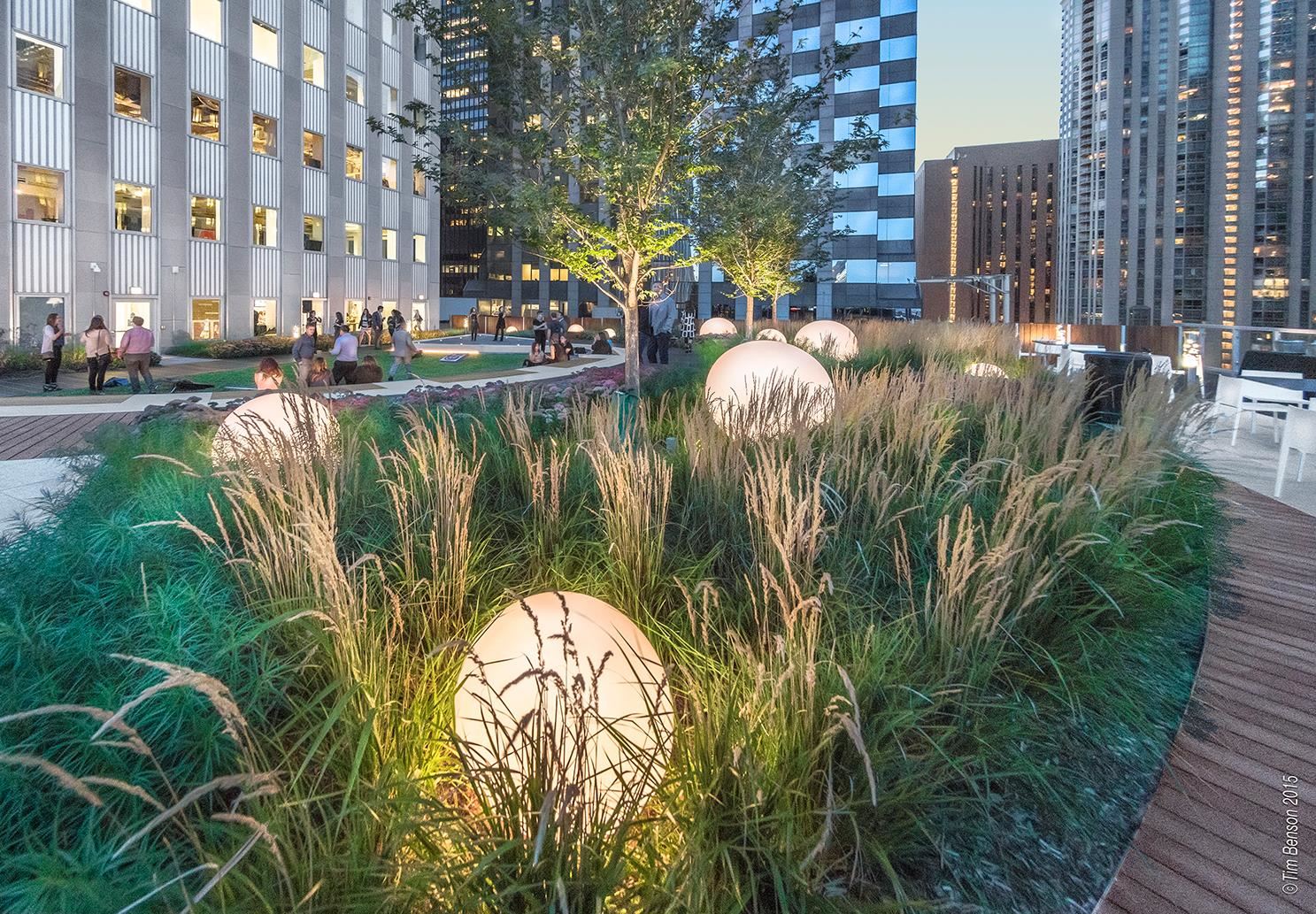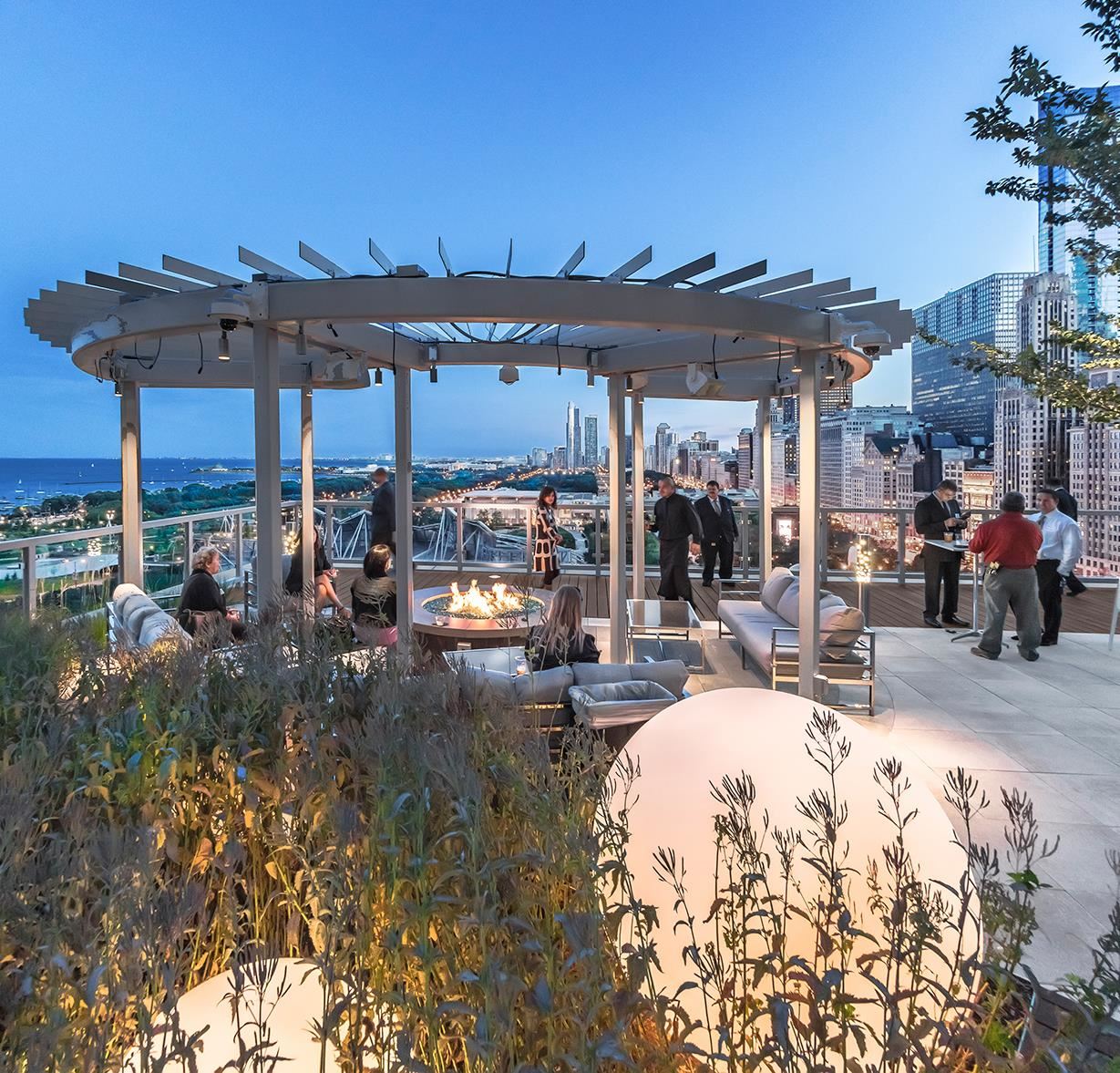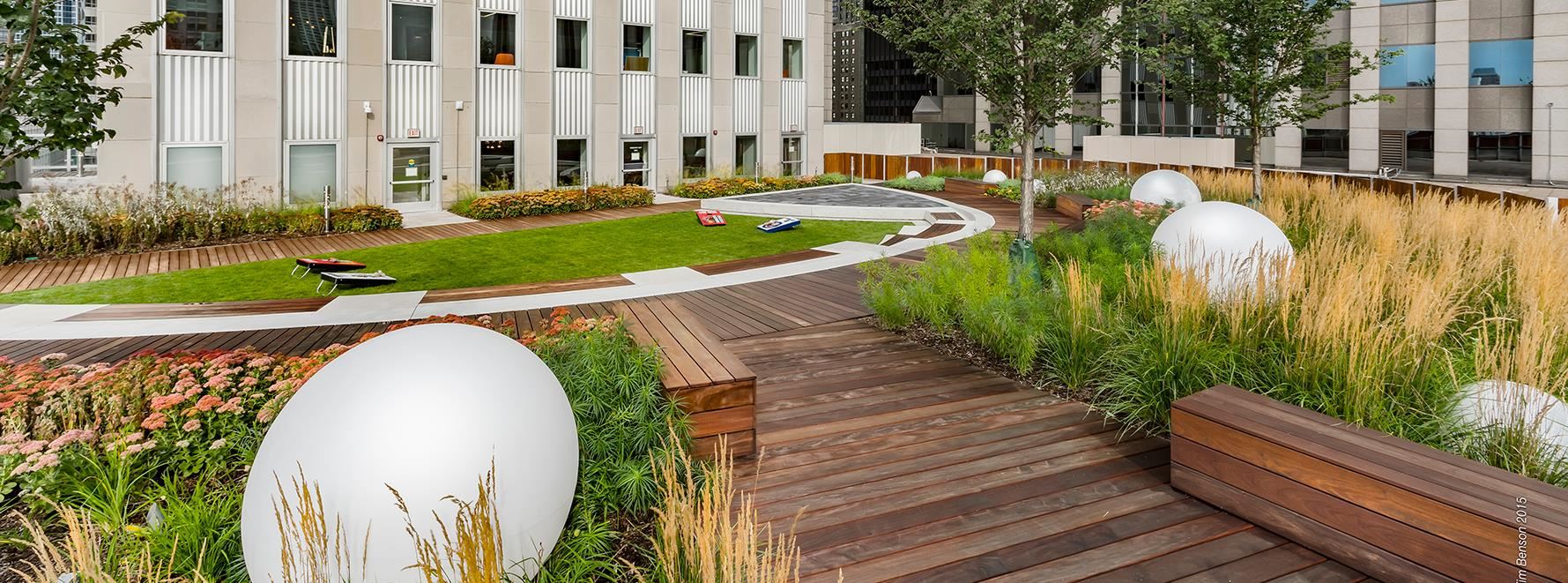 Our team served as the design lead for the roof garden while working collaboratively with the architect and structural engineers to respond to project goals, program requirements, and structural constraints. This new garden provides tenants and visitors with a central lawn space, garden areas, and hardscape design of integrated steps and ramps to access a level above the building parapet to provide unparalleled views of Millennium and Grant Parks and Lake Michigan.