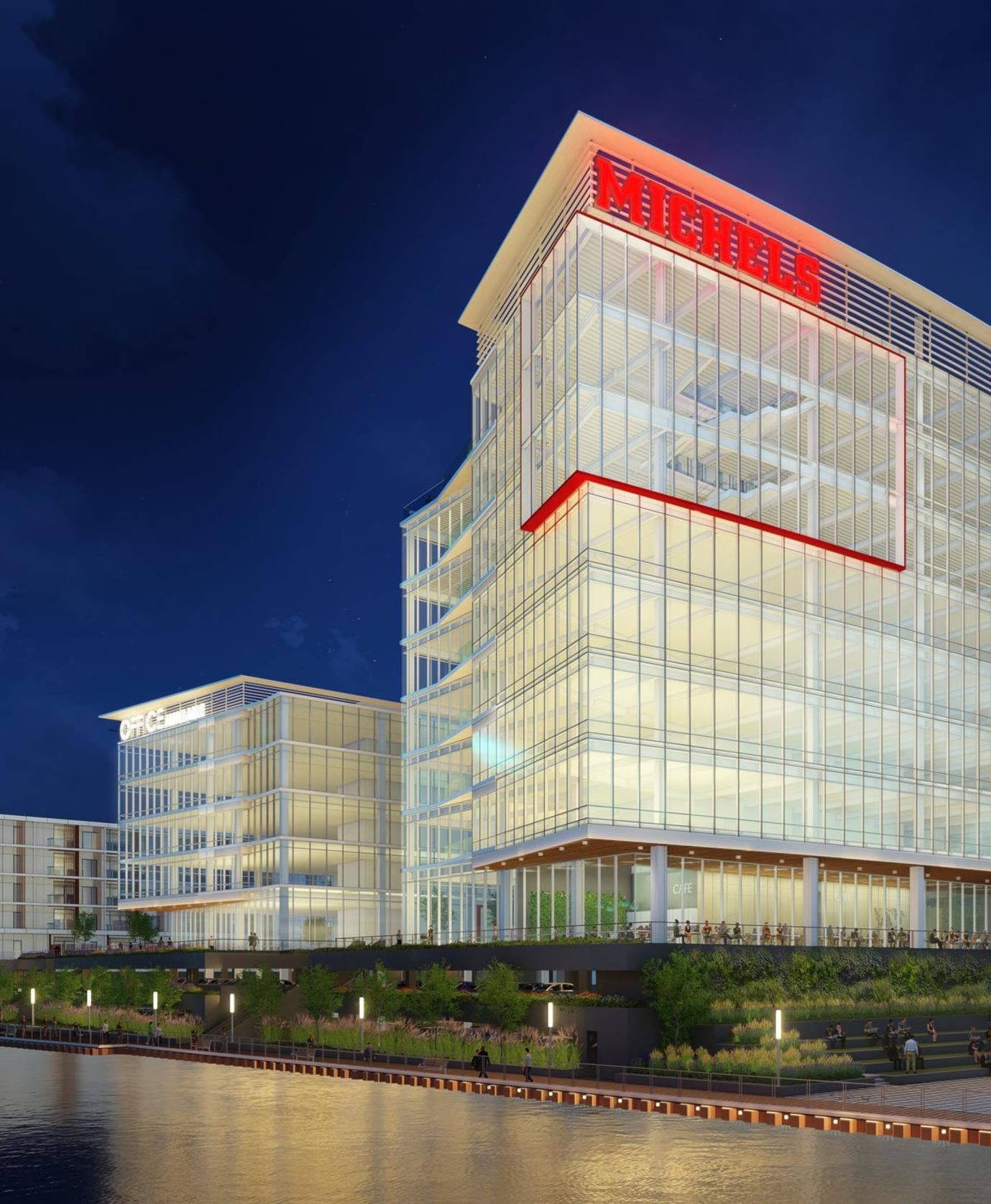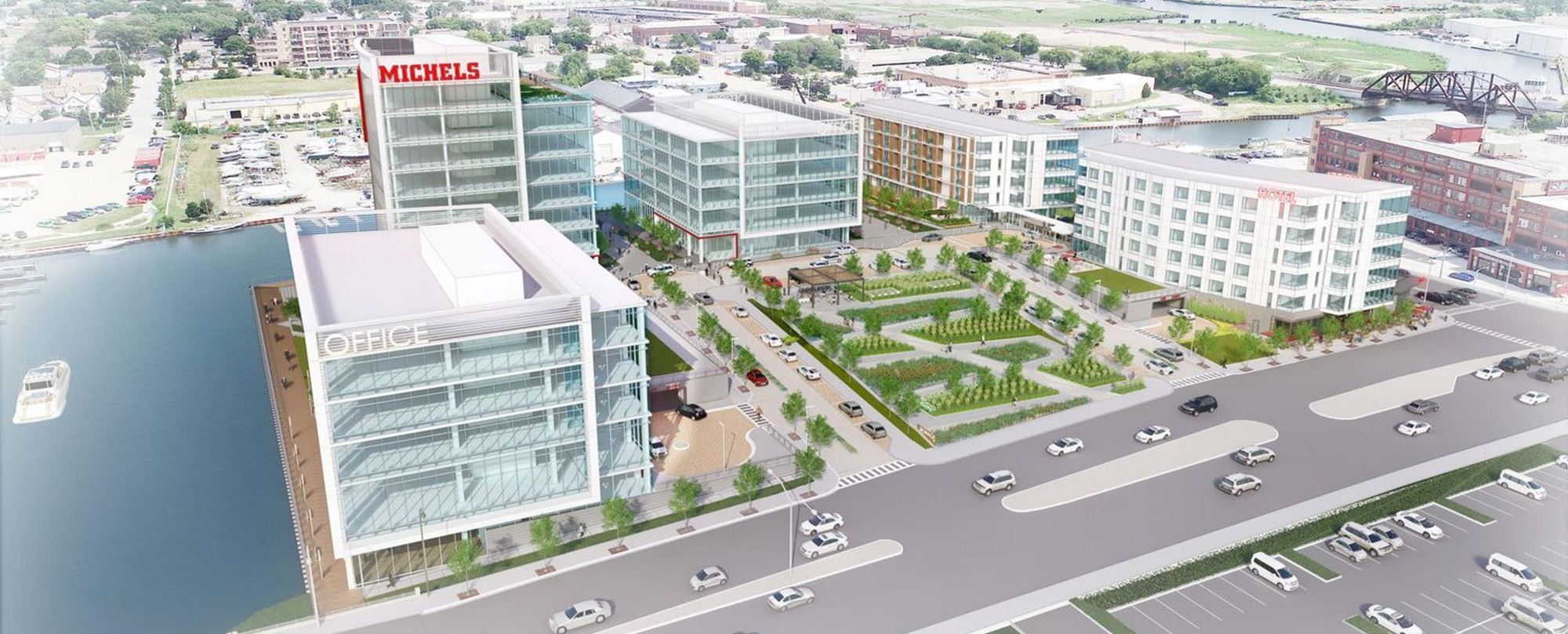 This waterfront mixed-use development consists of a new regional offices for Michels Corporation, multi-family residential, hotel, retail space, and a riverwalk with public plaza and park spaces.