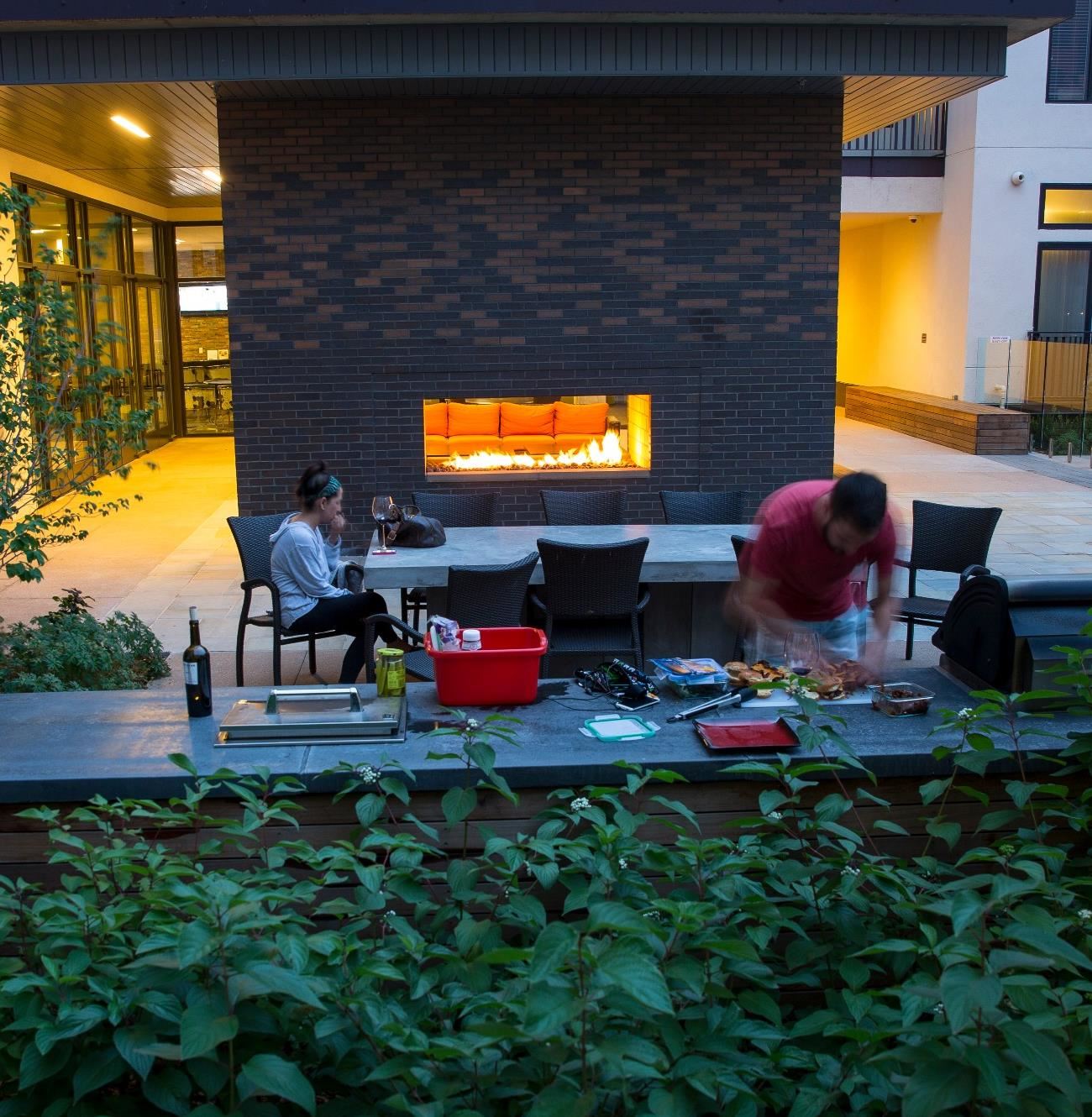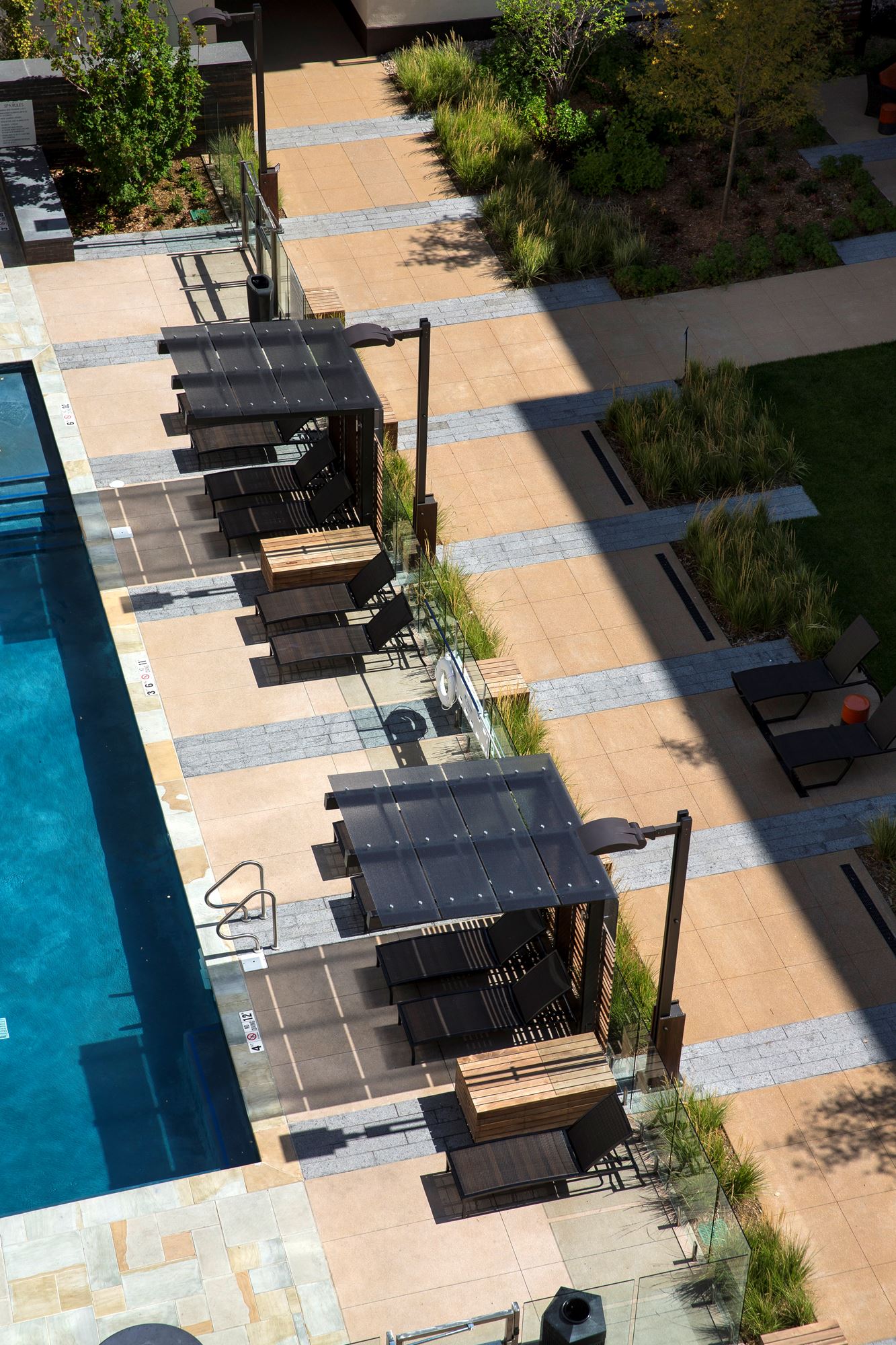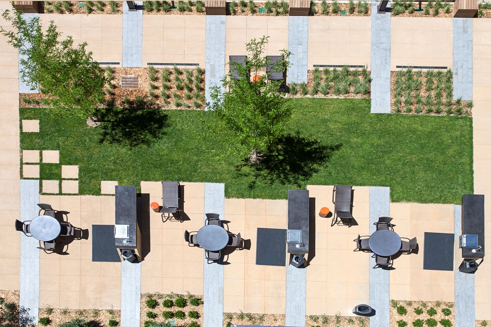 The central amenity courtyard serves residents with both passive and active spaces for year-round outdoor living and vibrant inward views for upper level residences. Careful landscape design provides private areas for passive individual use, as well as active community spaces throughout the courtyard. The development also features an intricately designed roof deck for group entertaining.