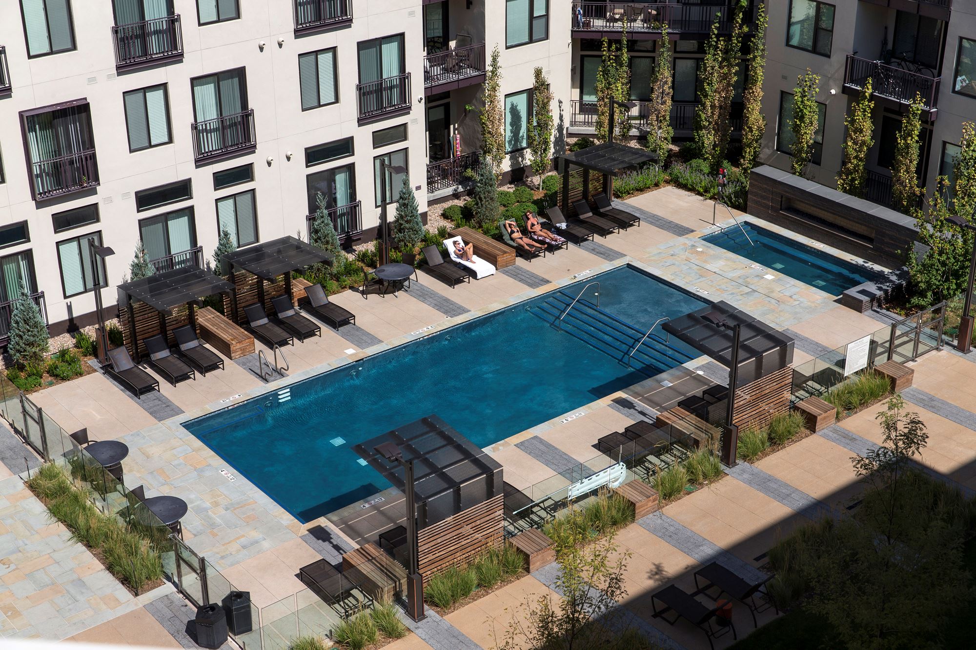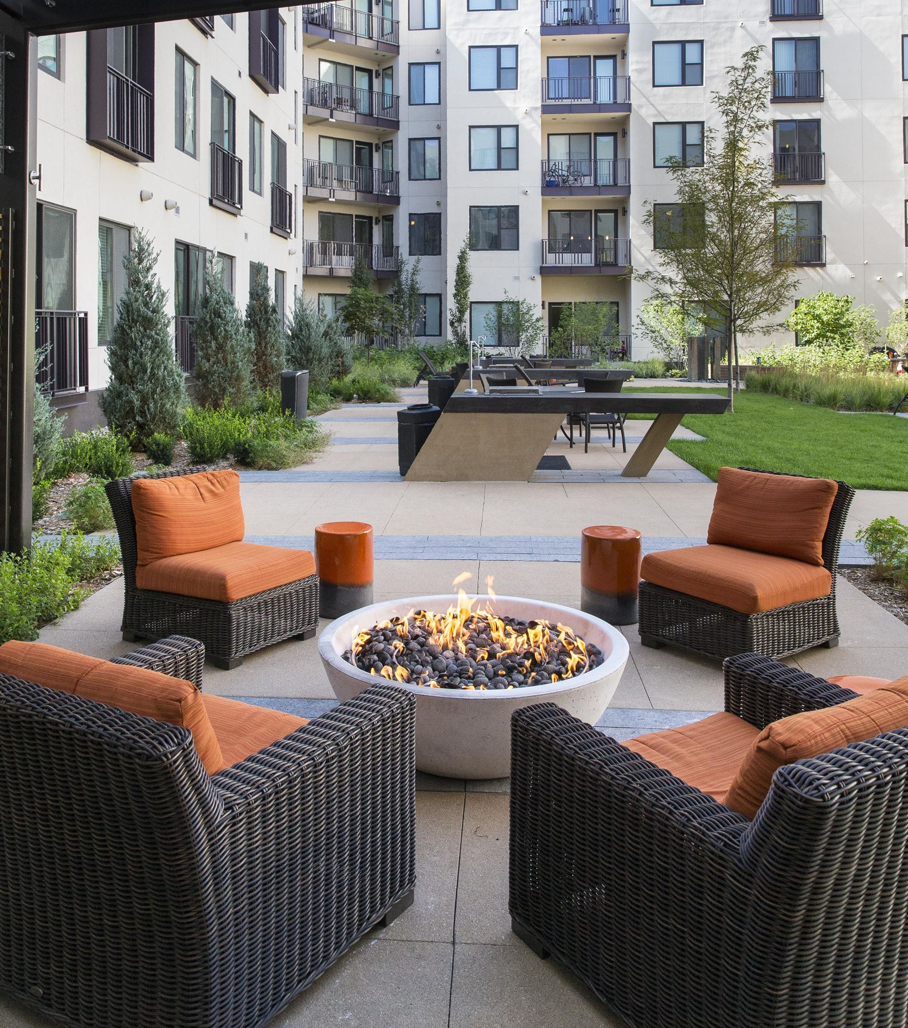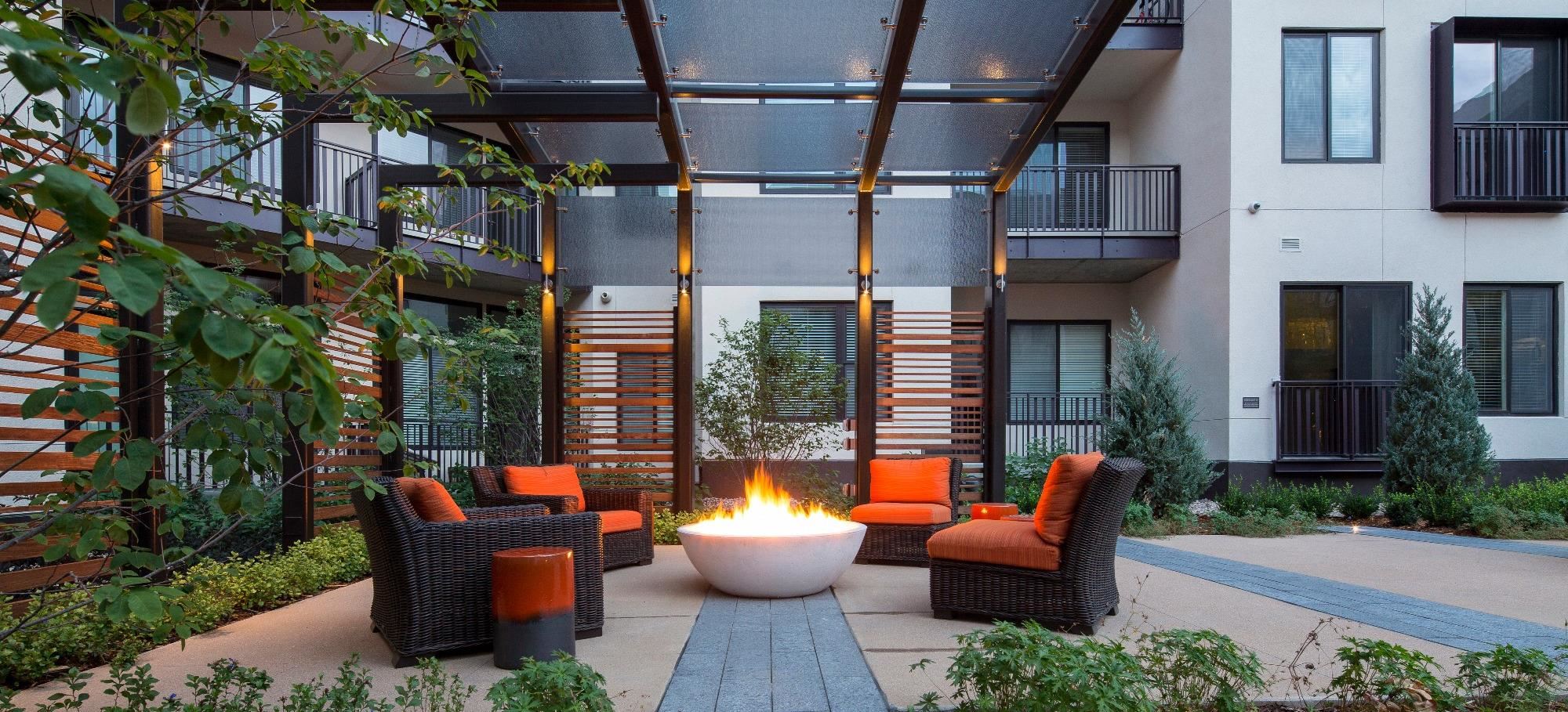 The central amenity courtyard serves residents with both passive and active spaces for year-round outdoor living and vibrant inward views for upper level residences. Careful landscape design provides private areas for passive individual use, as well as active community spaces throughout the courtyard. The development also features an intricately designed roof deck for group entertaining.