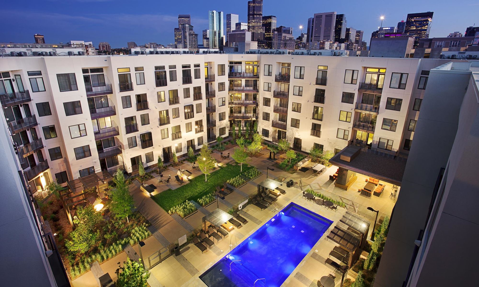 The site and courtyard design at the The Douglas draws residents and visitors into the primary entrance, leasing office and clubroom with a grand port-cochère arrival.