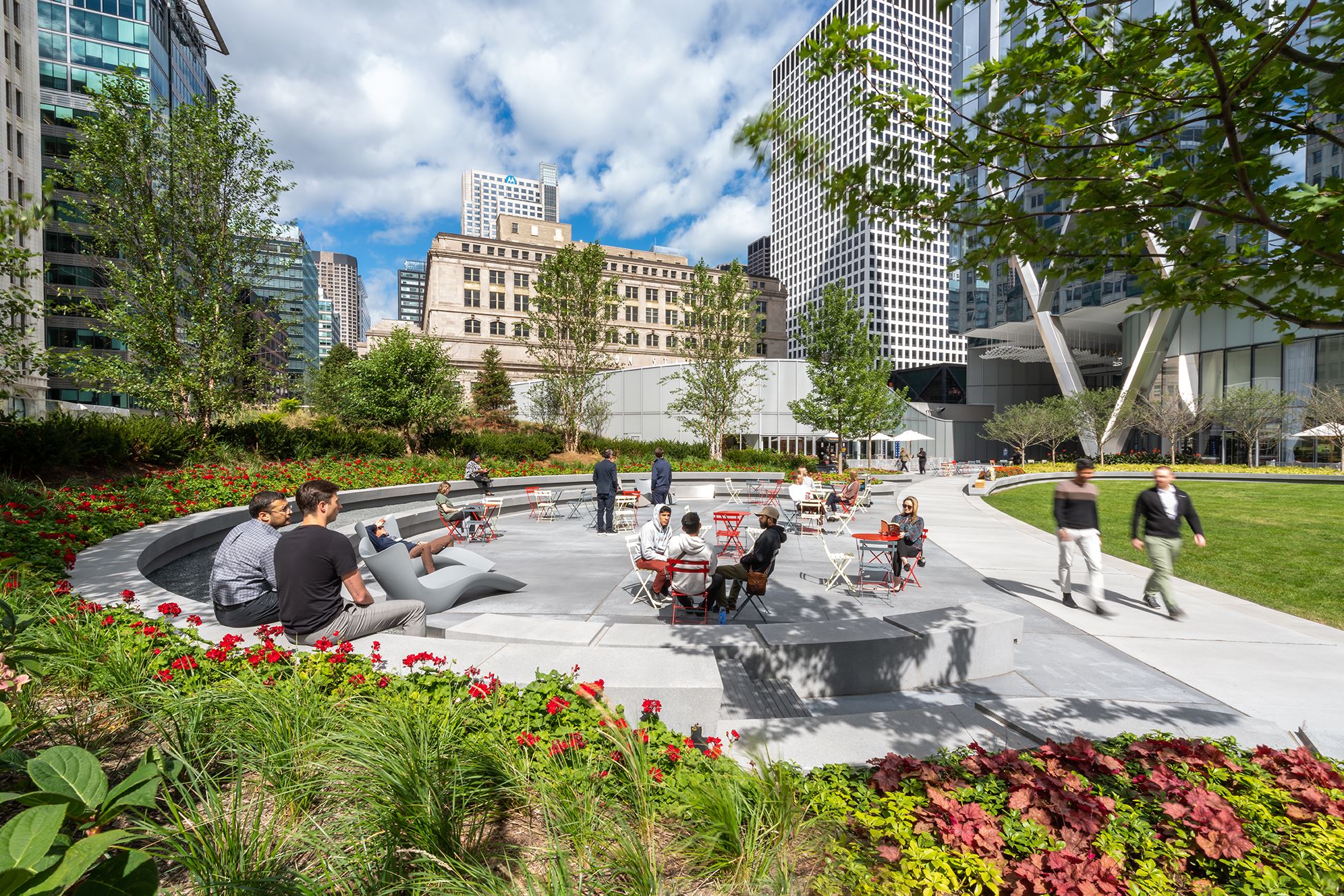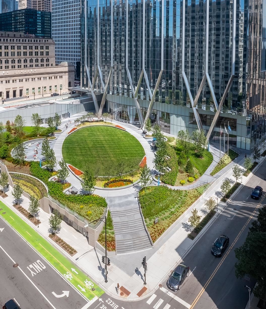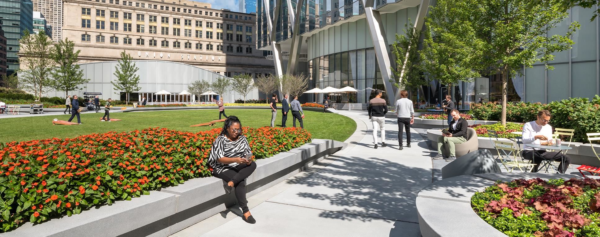 Located adjacent to Chicago Union Station’s historic Headhouse Building and Transit Center as well as a new 50-story office tower, this 1.5-acre space is a verdant oasis in an otherwise dense and high-traffic area of the city. This urban respite is constructed over the top of a parking garage and serves the surrounding neighborhood and adjacent office tenants. It's become a welcoming destination for the bustling nearby commuter hub.