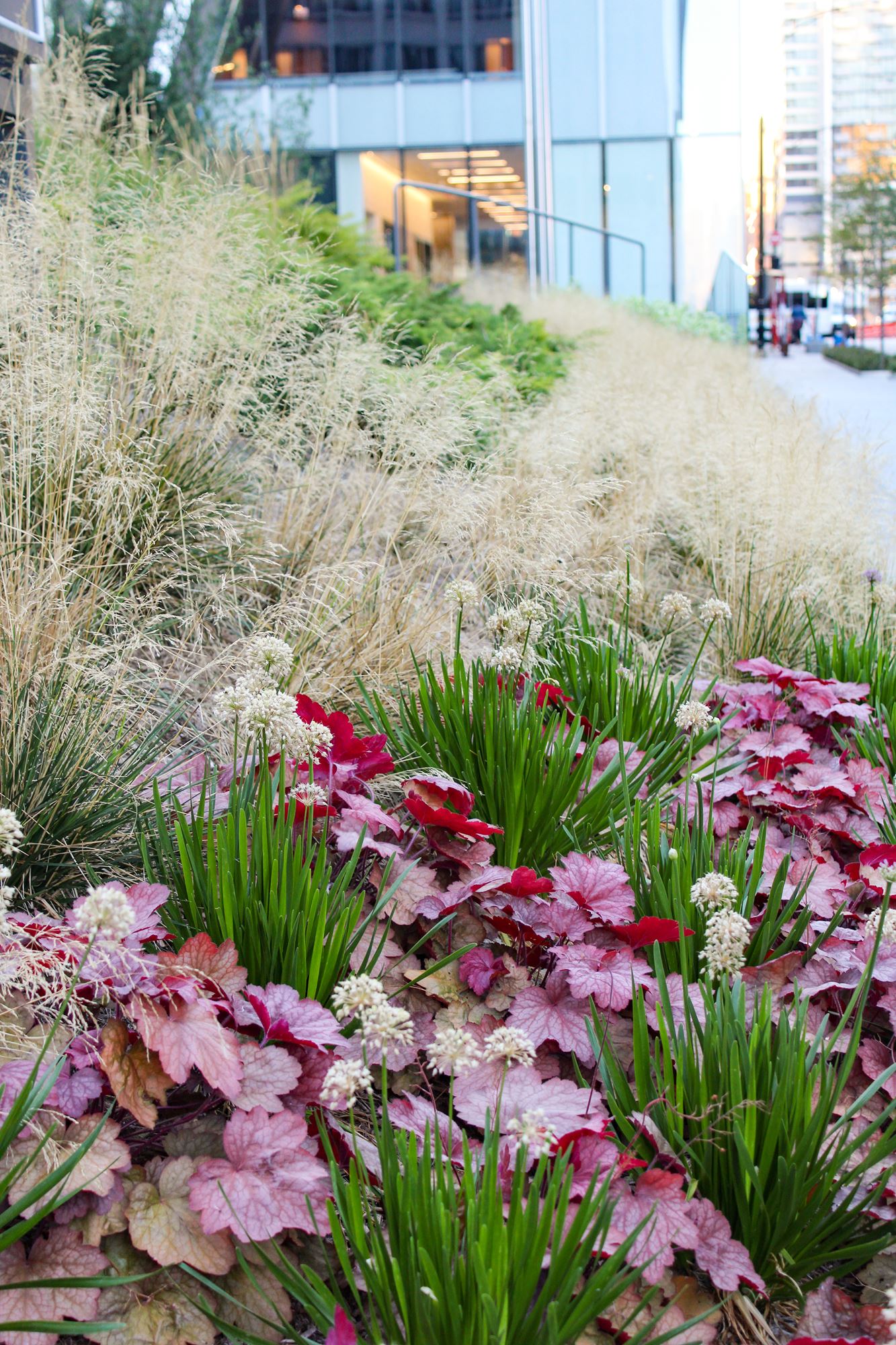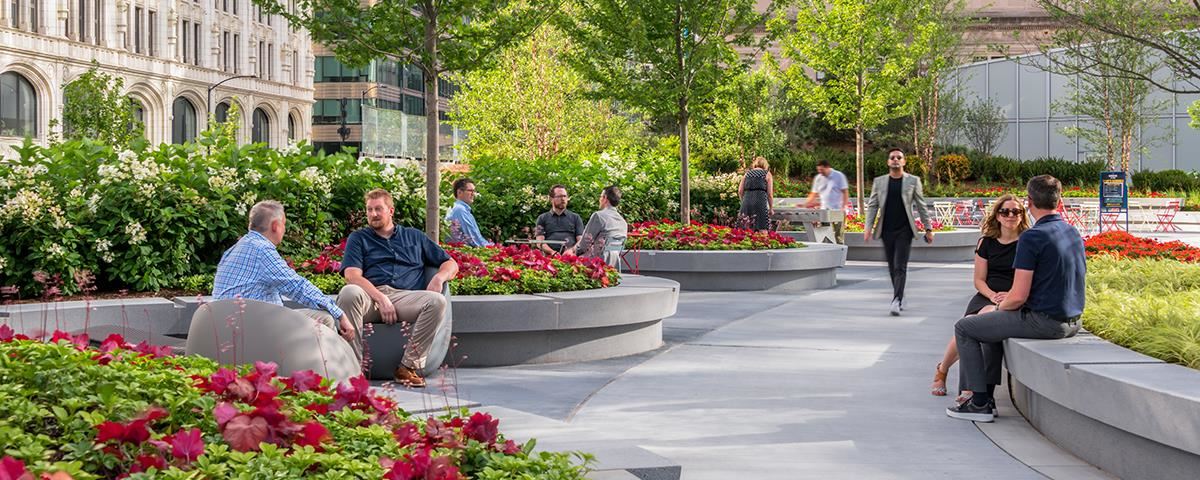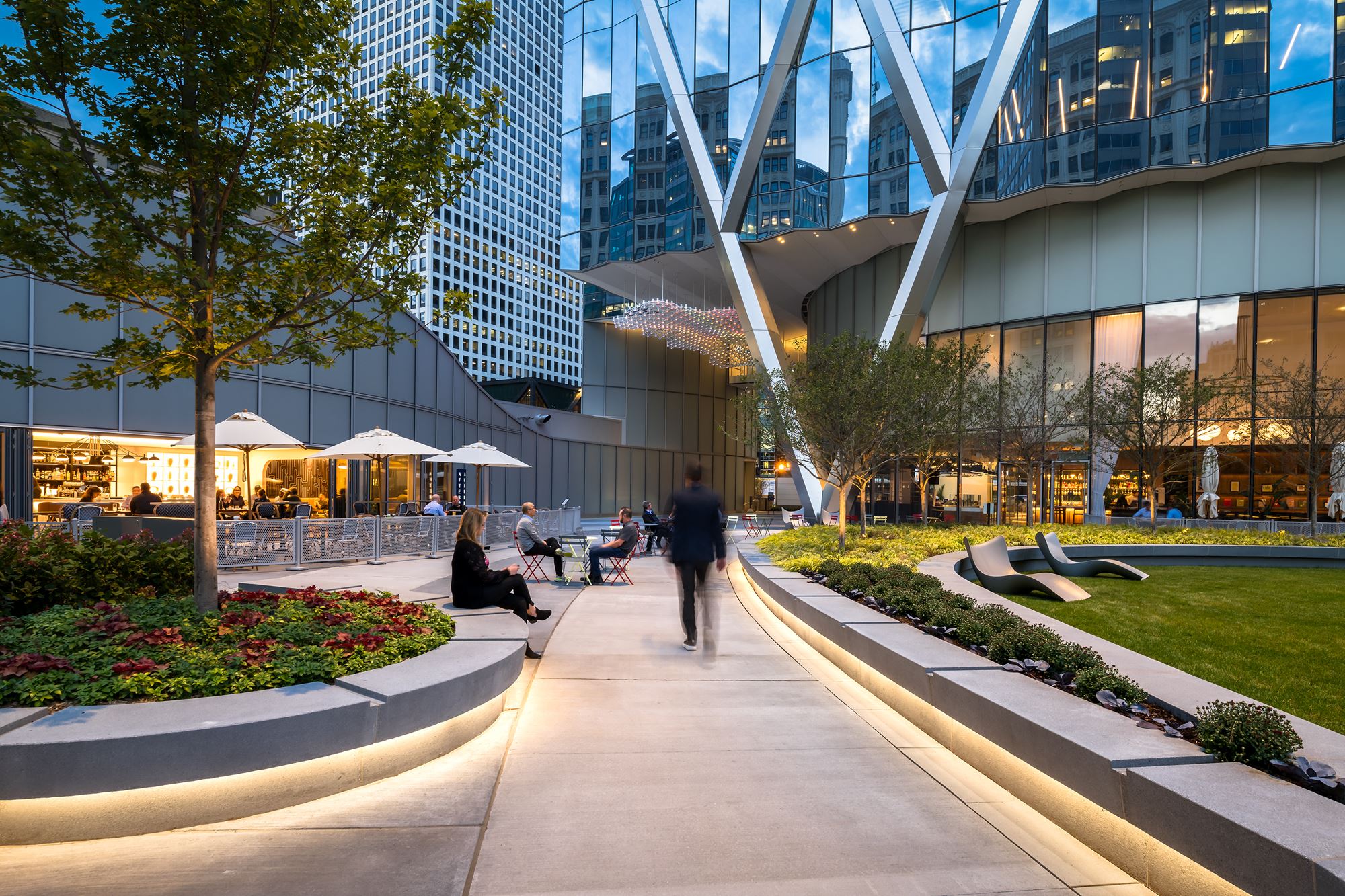 Located adjacent to Chicago Union Station’s historic Headhouse Building and Transit Center as well as a new 50-story office tower, this 1.5-acre space is a verdant oasis in an otherwise dense and high-traffic area of the city. This urban respite is constructed over the top of a parking garage and serves the surrounding neighborhood and adjacent office tenants. It's become a welcoming destination for the bustling nearby commuter hub.