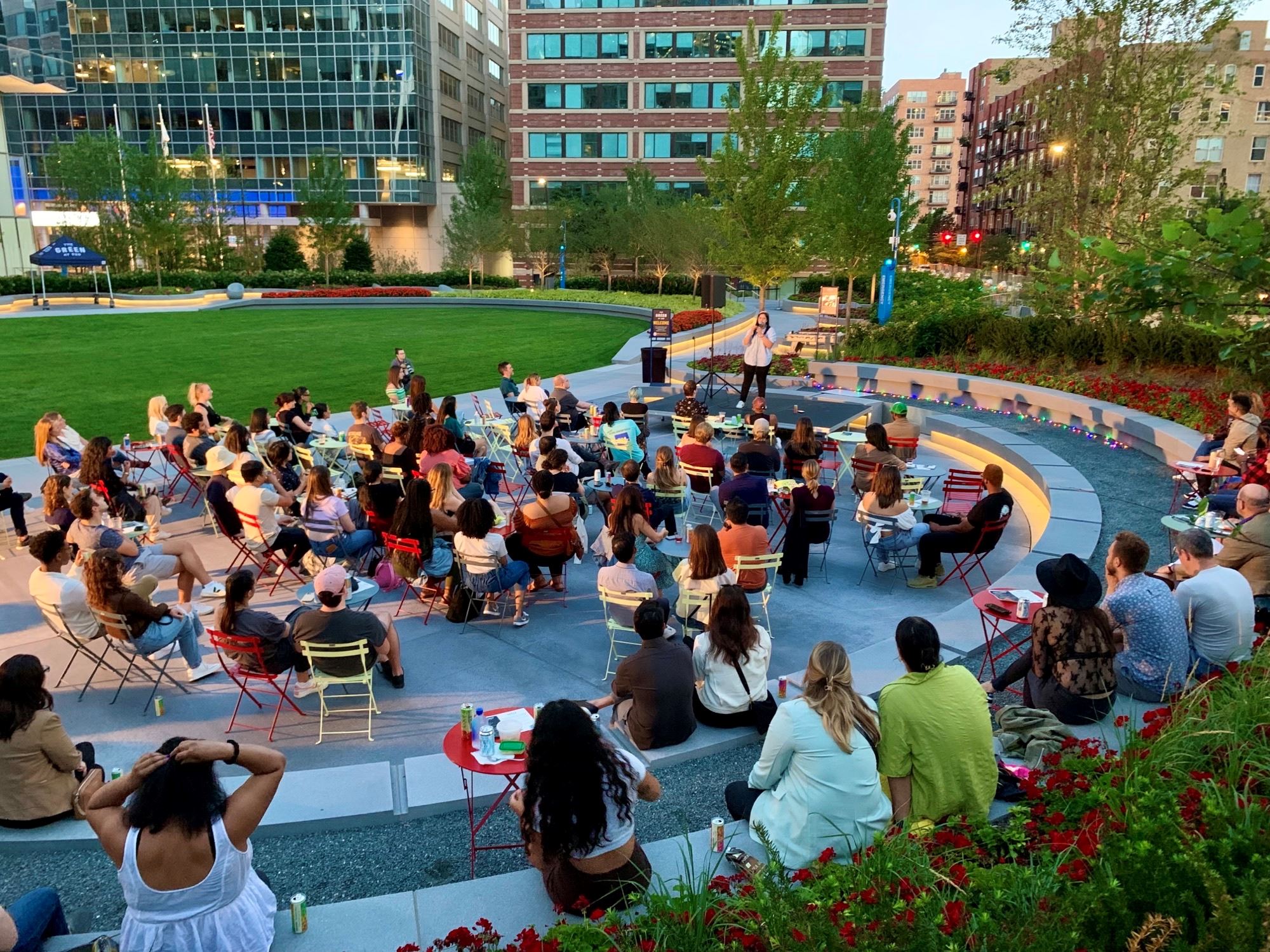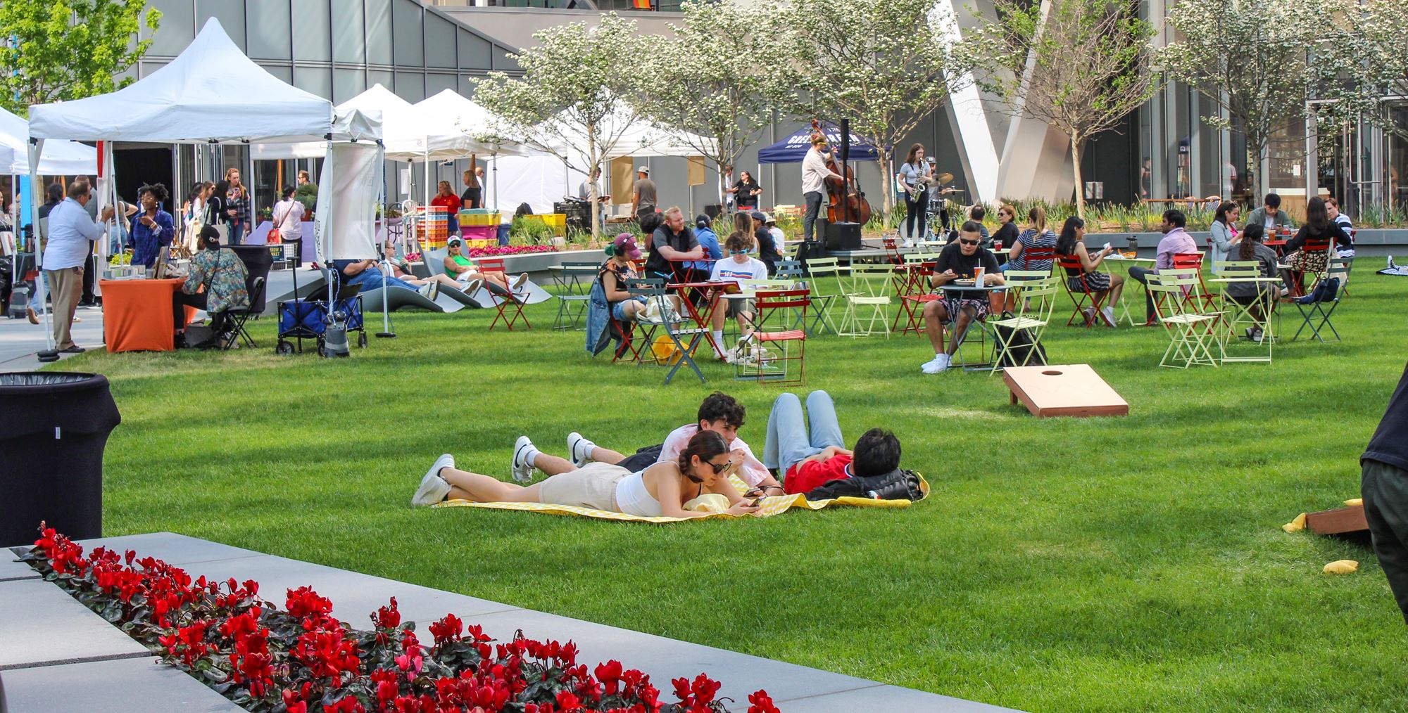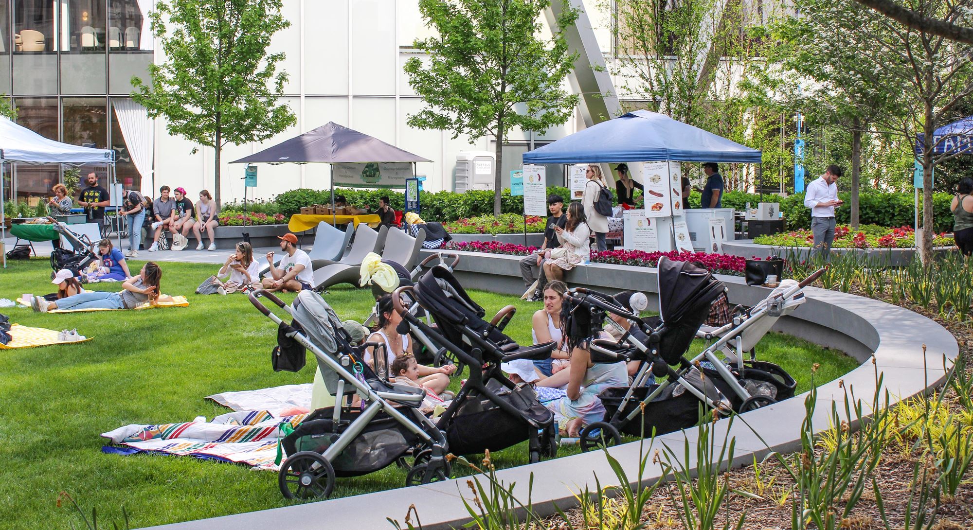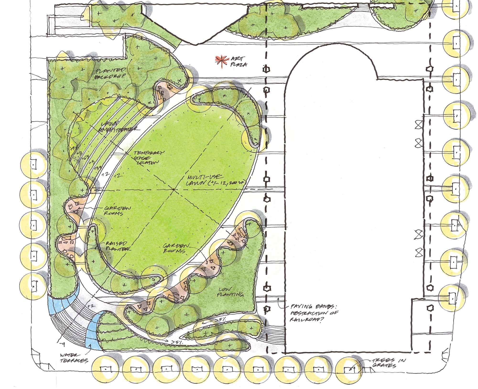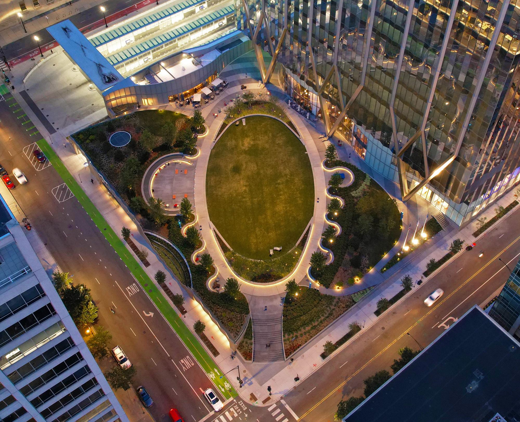 The design is based on the principle of contrast; a decidedly organic and flexible layout as compared to the adjacent sleek office tower and surrounding skyline. The park was envisioned as a flexible central green surrounded by lush garden seating alcoves, an amphitheater, retail, and connected pathways. Part of what makes this space unique is the curated activation efforts developed in collaboration with a public space programming consultant. Activation examples include fitness/wellness in the park, a farmers market, evening movies, live music, poetry readings/open mic events, games, an outdoor library, and even “borrow-a-blanket” stations for impromptu picnics on the lawn.